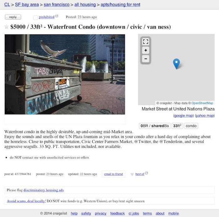 Perhaps the funniest evidence that a $5k/month dumpster is a little too close to reality, Scott’s Craigslist post still hasn’t been taken down.