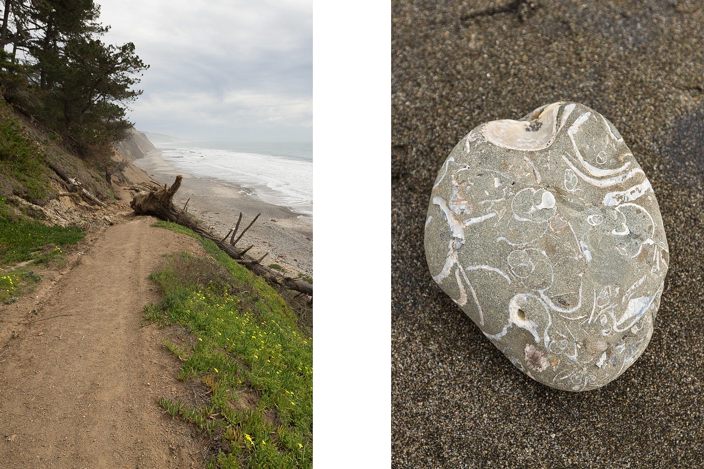 Elliot Creek flows out onto the beach just south of Año Nuevo State Park. Even if you’ve driven past it a hundred times on your way to Santa Cruz, you’d never guess there was a waterfall just off the highway. There are actually a few more within a couple of miles, but this one lasts longer than the others after a good rain. This waterfall also has a hidden talent of unearthing fossils. The three- to five-million-year-old Purisima Formation stretches along much of the coastline between San Francisco and Santa Cruz. You can find chunks of smoothed rock filled with shells scattered around the beach at low tide.