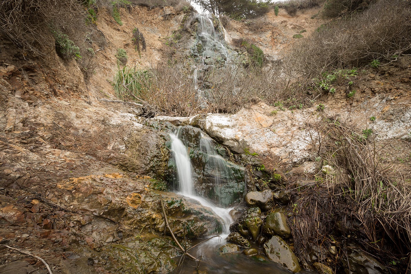 Alamere Falls is the rock star of Bay Area waterfalls. Not only is it one of the most dramatic locations, falling right onto the beach, but it’s also one of the most reliably high-flowing falls around. The hike to Alamere Falls is the longest on the list, but it keeps a fairly even elevation most of the way. The first mile snakes along a 300-foot cliff overlooking the water, and the rest goes between covered forest and exposed chaparral.