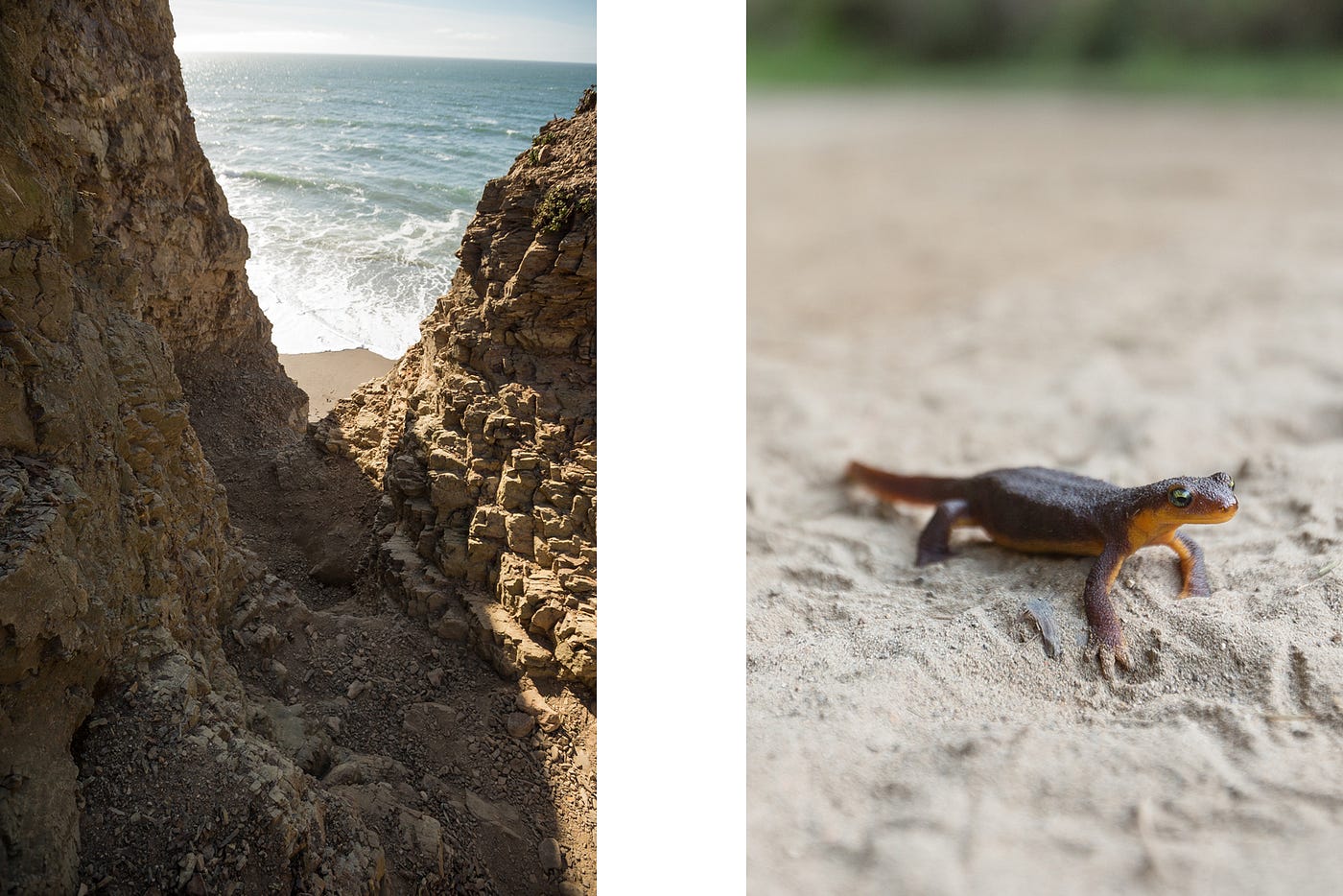 To get down to the beach, you’ll have to scramble 60 feet down a gravelly cliff. It’s nothing crazy, but you will definitely have to use your hands. Climbing back up can be tricky, and the rocks are very loose and crumbly. If you’re not feeling particularly agile, you can take an alternate route north to Wildcat Campground and then walk back down to the falls along the sand. It should be passable at most tides, but be sure to check high-tide times before you go. The alternate route will add about 2.7 miles each way.