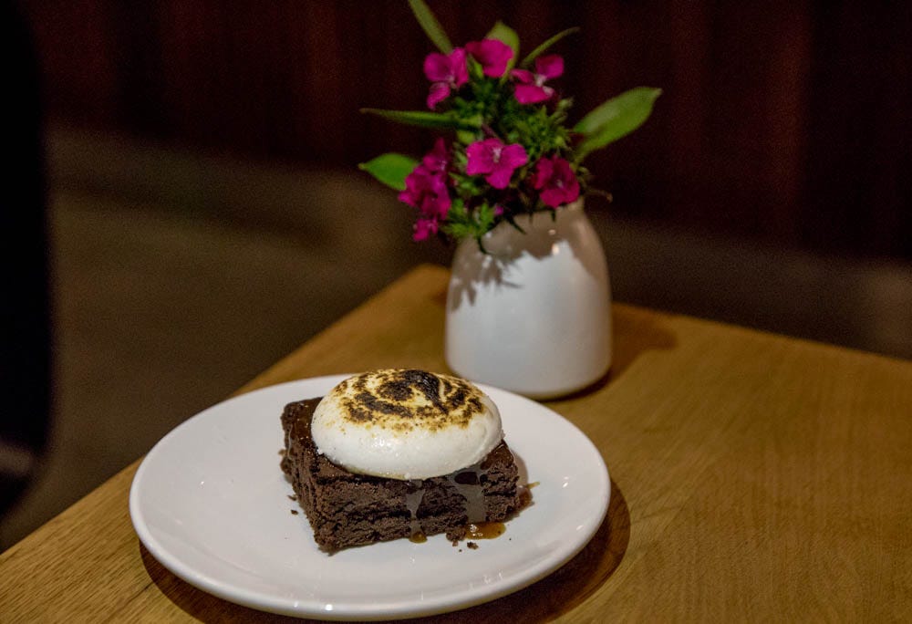 The sleeper hit is roasted and fresh persimmon over ricotta on crostata, accented by toasted walnuts, pomegranate molasses, and tomato water vinaigrette. It’s more creative than the typical trendy toasts and tasted like California winter. The “wow” dish came in a turmeric-spiced bouillabaisse of marinated black cod (I can taste the Ichi influence here) with mussels, scallops and roasted fennel. It stole the show. Aromatic makrut lime leaf in a Valrhona chocolate brownie topped with five spice caramel and toasted marshmallow makes for a whimsical, gratifying finish.