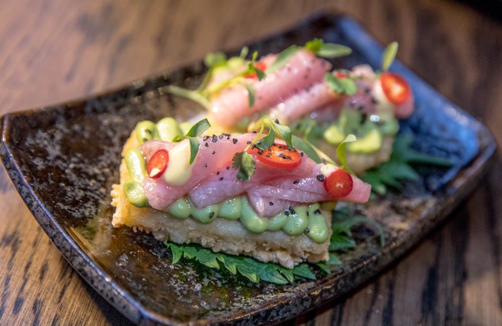 There are five ceviches, including a scallop version, plus a golden beets tiradito for vegetarians. Bluefin chu-toro tuna on crispy rice toasts over a slather of avocado cream is another starter standout and fun bar food with drinks.