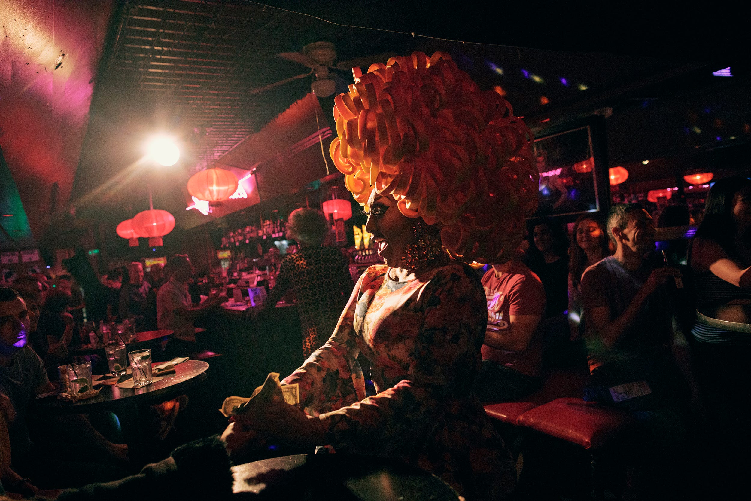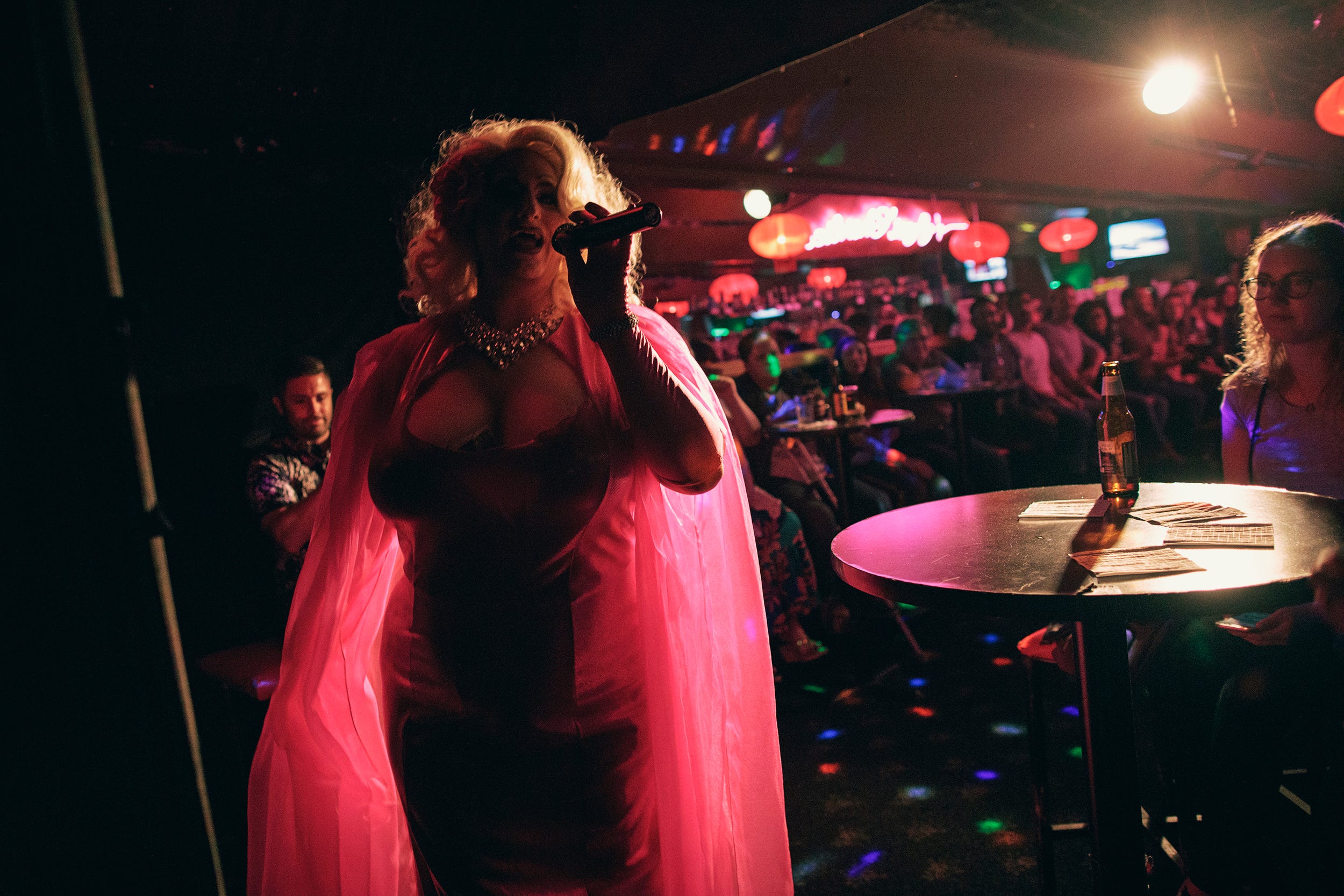 Every weekend, the Hot Boxxx Girls, adorned in a flurry of over-the-top wigs, jewelry, gowns, and expertly applied and wonderfully tacky makeup, make the audience blush. They put on a show of singalong classics from yesteryear, current Top 40 hits, and some original tunes; and these queens know how to work the room. The crowds are a mixed bag: birthdays, elder gays, bachelorette parties, couples, young queers, and the wayward tourists who somehow ended up here.