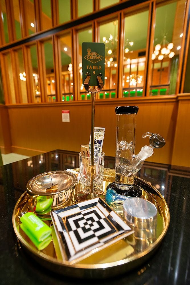 On our way in, we passed people in the Playground, a more casual space set up with smaller tables and high-tops that’s perfect for mingling with friends and strangers—though everyone mostly kept to their own small parties. At our table, we found all the necessities for rolling and lighting up a joint to smoke openly, casually and comfortably — no dodgy dorm-room shenanigans here. Just adults. Drinking. Smoking. With the decency and maturity that should be required of anyone allowed the privilege of using any substance whatsoever.
