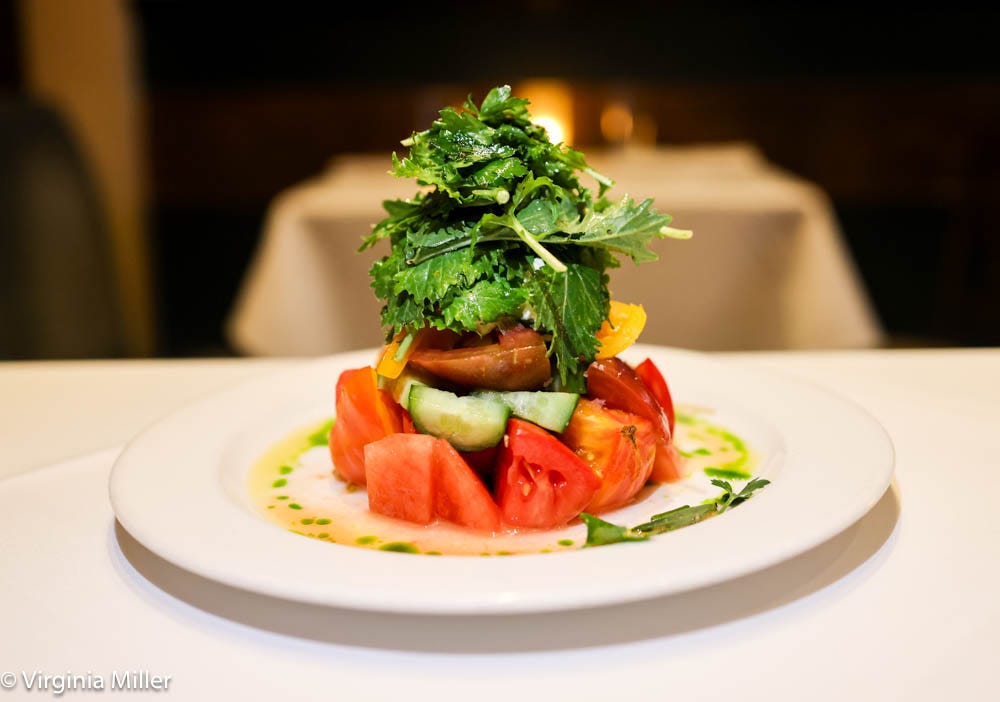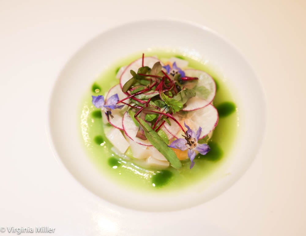 It felt like SF summer with a towering heirloom tomato and watermelon salad. Other elements like French feta cheese, Persian cucumbers and radishes may be common partners with tomato and watermelon, but green grape vinaigrette and the tower presentation topped with a “hat” of mizuna lettuce leaves is not. Seafood tartares and crudos are also ubiquitous on local menus for years, but Begg’s sea scallop tartare is silky, diced-up scallops (instead of served whole) with Summer melon, lemon, shiso and toybox radishes swimming in a cool cucumber nage (aka stock or broth). This dish transported me back to a heat wave harvest in Bordeaux, France, in September 2011 when I’d kill for light French-style seafood tartares in that heat as I was served heavy foie gras and steak daily.