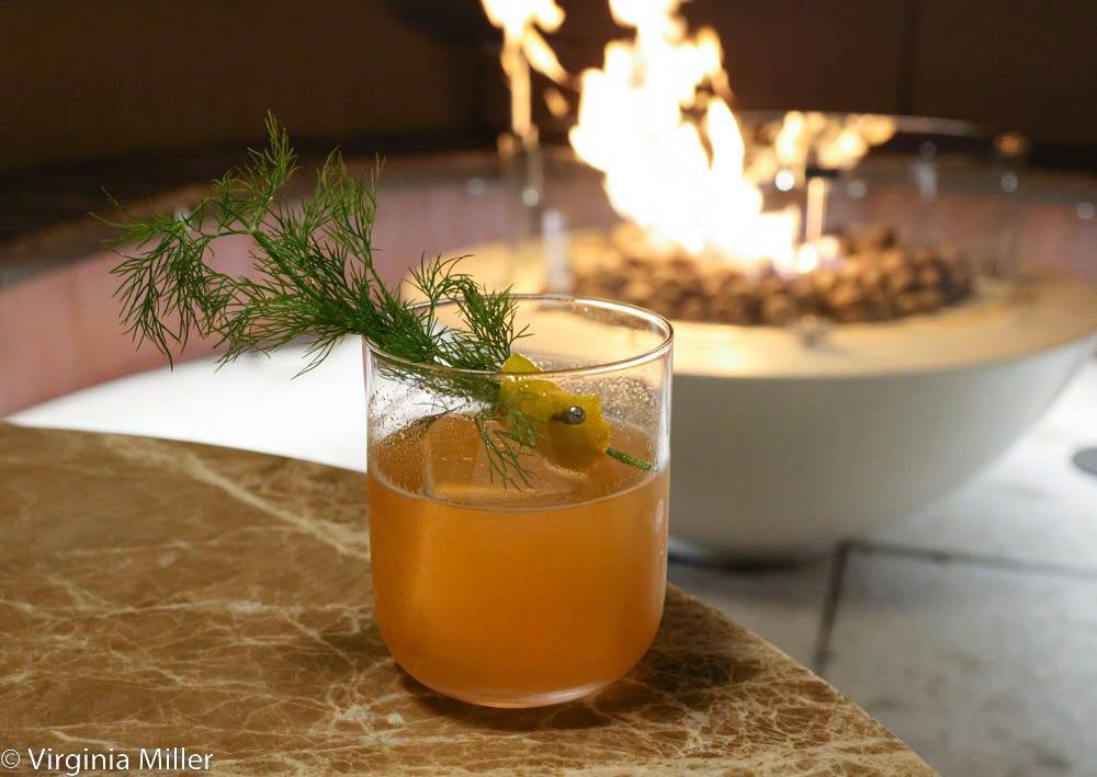 In some ways, I’m reluctant to write about the fab new rooftop bar, Rise Over Run in the new LINE Hotel, because I don’t want it to be as mobbed as other rooftop bars (like nearby Charmaine’s or KAIYO Rooftop). But alongside the LINE’s new restaurant downstairs, Tenderheart (reviewed here), Rise opened October 14, 2022, on the hotel’s rooftop with brilliant views over downtown SF, heat lamps, intimate corners and open spaces punctuated by fire pits. Plants, trees and fruit trees grow in the center, imparting a lush feel. Even better, on my initial visits, it has been chill with space for all. I expect that may not last but hopefully standing crowds get relegated to an area they might use for standing patrons, ideally leaving tables and the indoor, glass walled atrium with bar for reservations and walk-ins.