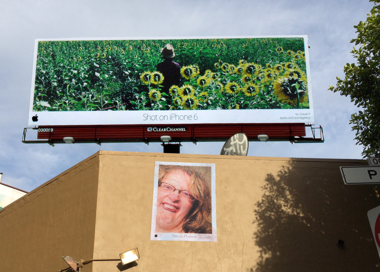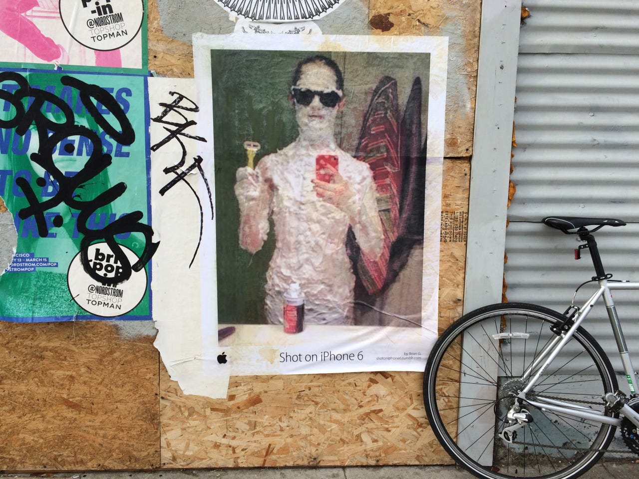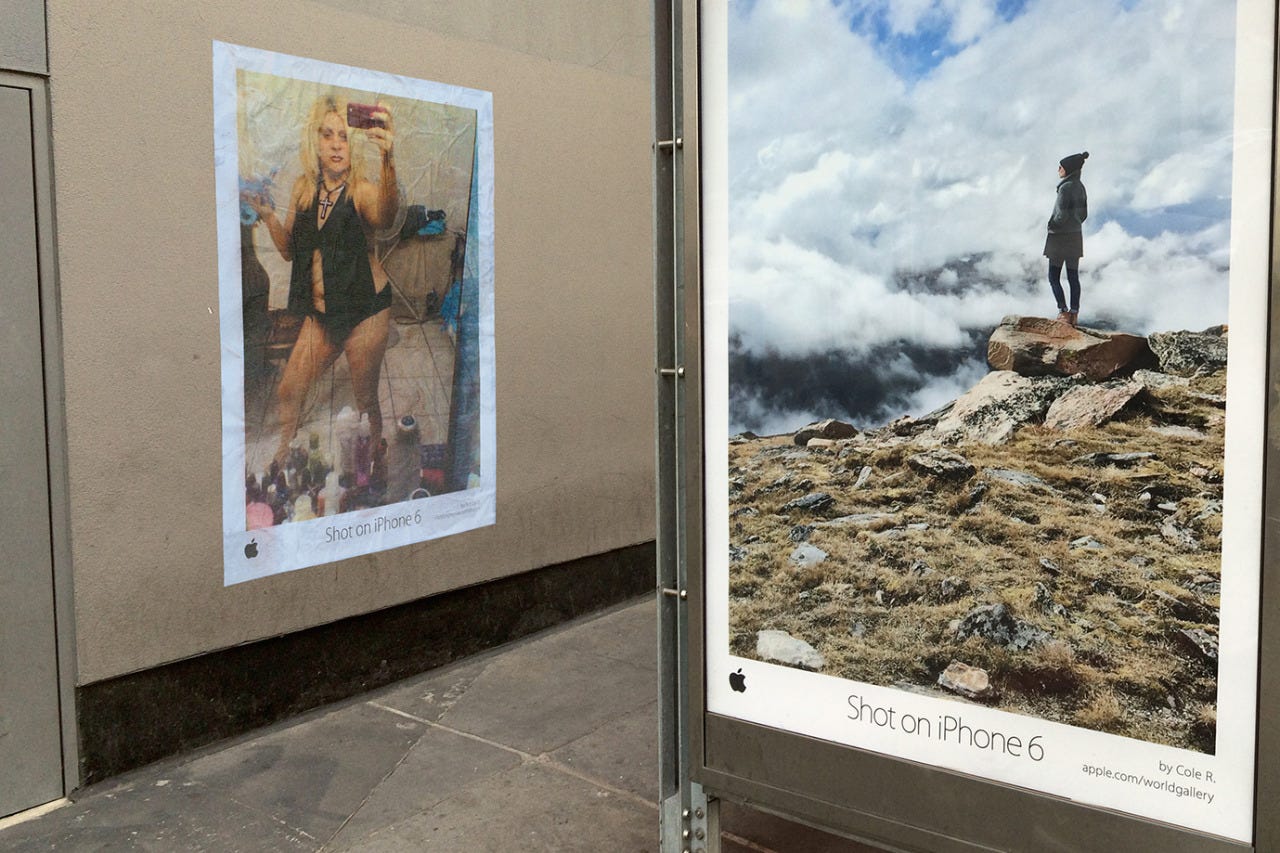 This is all just to say that I thoroughly appreciate the Tumblr-documented street-art parody Also Shot on iPhone 6, a project by an SF-based duo. They blew up photos of bathroom selfies, distorted faces, and other much more ubiquitous subjects when it comes to what the iPhone is most often documenting, framed them in identical borders, and mounted them alongside the original ads: