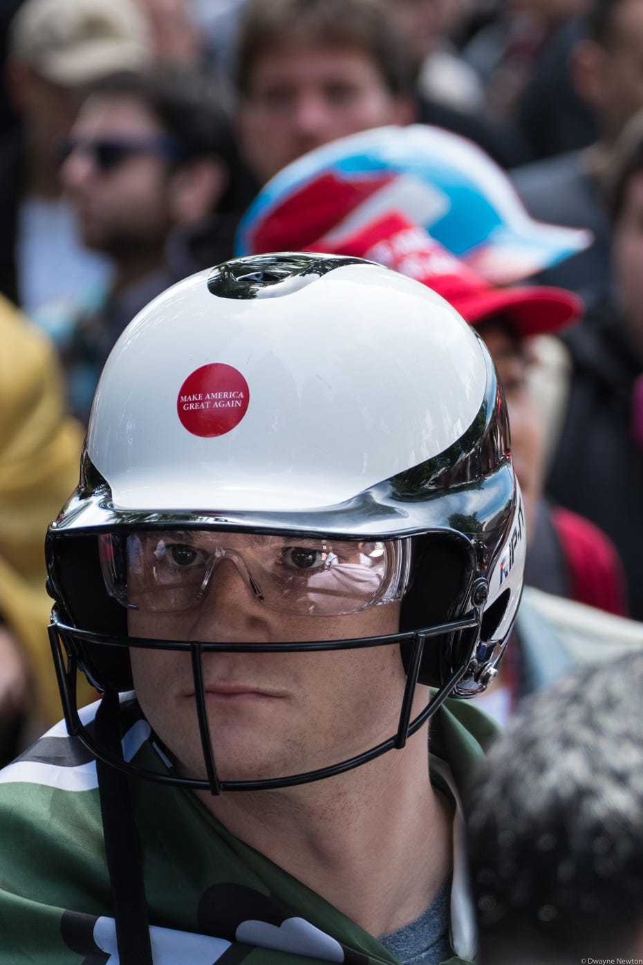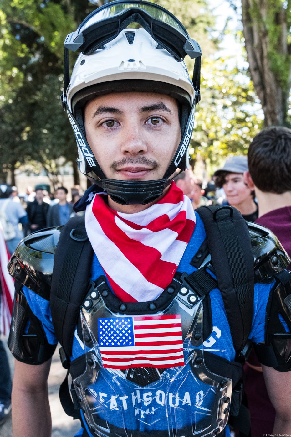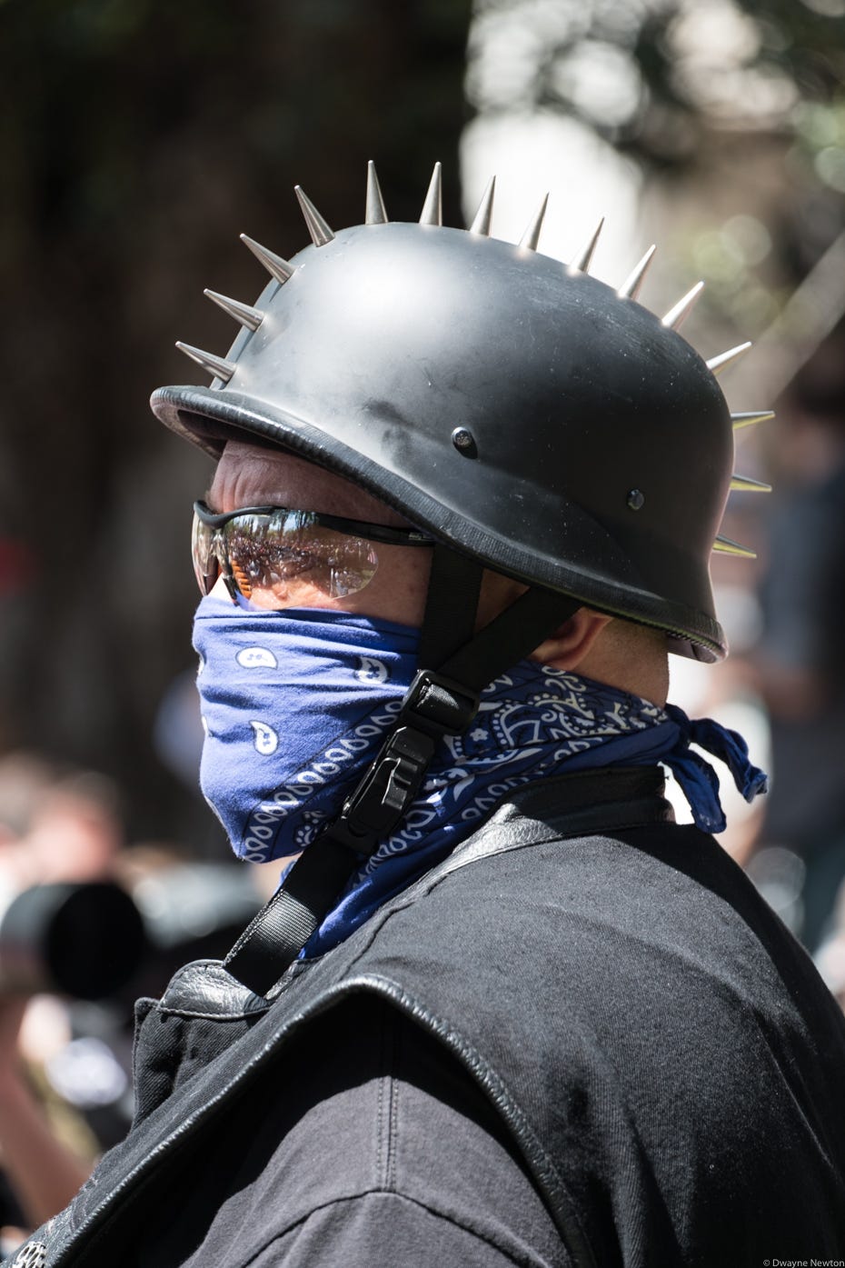 The alt-right called it a “Rally for Free Speech” at the Berkeley Civic Center, where these pictures were taken. They came from all over the US, festooned with flags, pins and bumper-sticker patriotic quotes velcroed to leather vests. Also, they came prepared — with an armory of helmets, shoulder and knee pads, fighting gloves, baseball bats, knives, radios, gas masks, goggles and scores of big dudes with big arms.