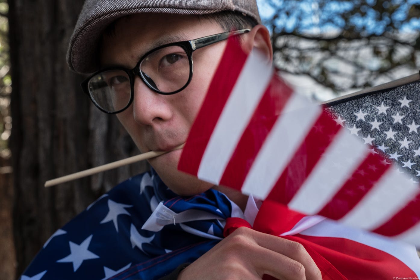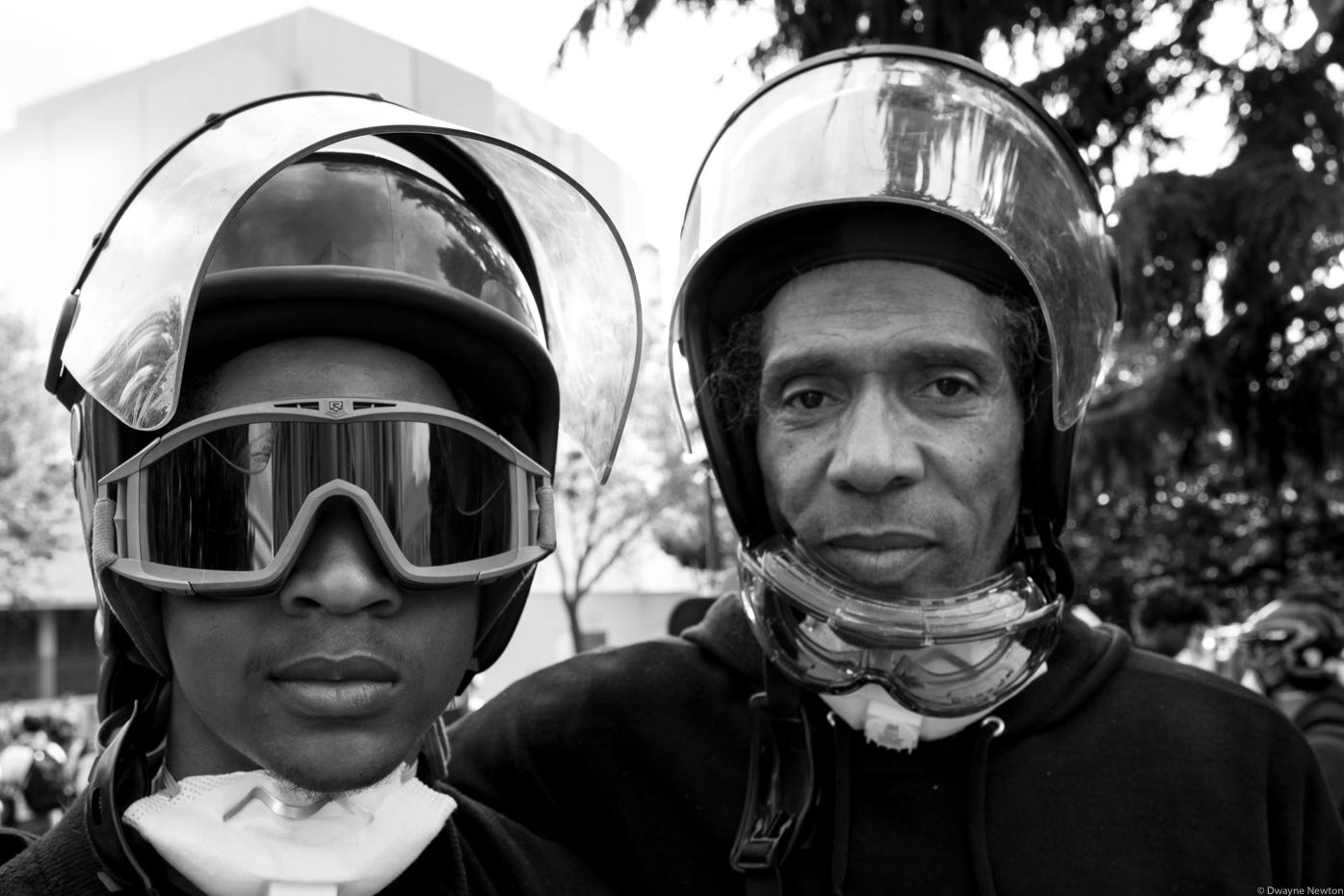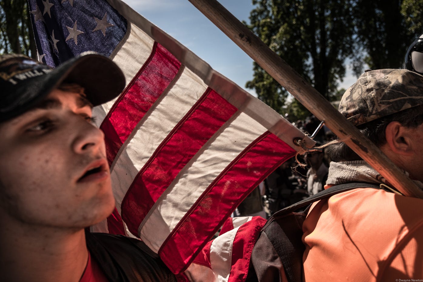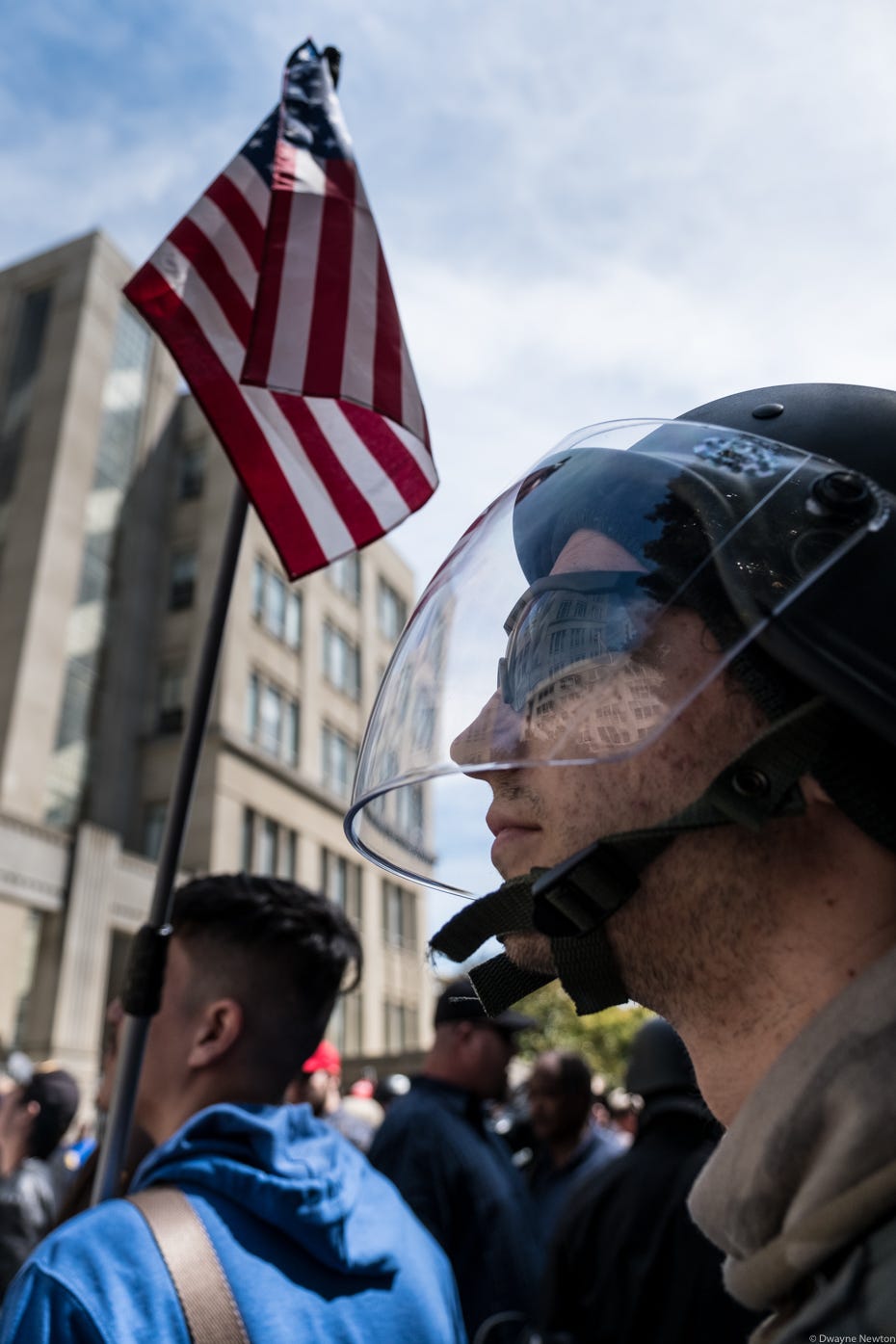 The alt-right called it a “Rally for Free Speech” at the Berkeley Civic Center, where these pictures were taken. They came from all over the US, festooned with flags, pins and bumper-sticker patriotic quotes velcroed to leather vests. Also, they came prepared — with an armory of helmets, shoulder and knee pads, fighting gloves, baseball bats, knives, radios, gas masks, goggles and scores of big dudes with big arms.