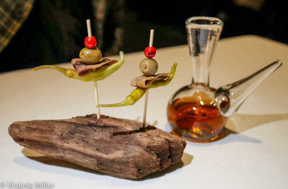 Bay of Biscay cocktail is a house distilled olive and anchovy spirit, briny yet restrained with nutty manzanilla sherry, vermut (Spanish vermouths) and bay laurel. Served in a classic porrón glass wine pitcher originating from Catalonia, Spain, and poured tableside, the lovely cocktail is paired with two Gilda pinxtos on toothpicks sticking out of driftwood. These classic Spanish bites (pintxos) were named after bombshell Rita Hayworth’s 1946 movie Gilda, the same era the bite was invented in Spain. It’s a Basque pintxo of a salted anchovy, olive and guindilla pepper on a toothpick skewer, ideal with a briny-nutty sherry cocktail such as this.