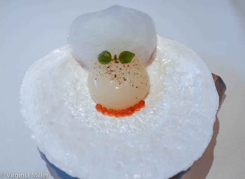 Where initial courses were cool and light, a little bowl of diced Monterey abalone, swordfish “bacon” and strips of green onion in dashi broth is warm, nurturing, full bodied. 2020 Suertes del Marqués ‘Sortevera’ is the only non-French pour — and red wine, as many of the best restaurants globally do — in the wine pairing lineup, from one of my longtime faves, Spain’s Canary Islands, where elegantly funky natural wines have long been produced. This red wine has a light body but earthy, vegetal notes that sing with the dashi’s umami.