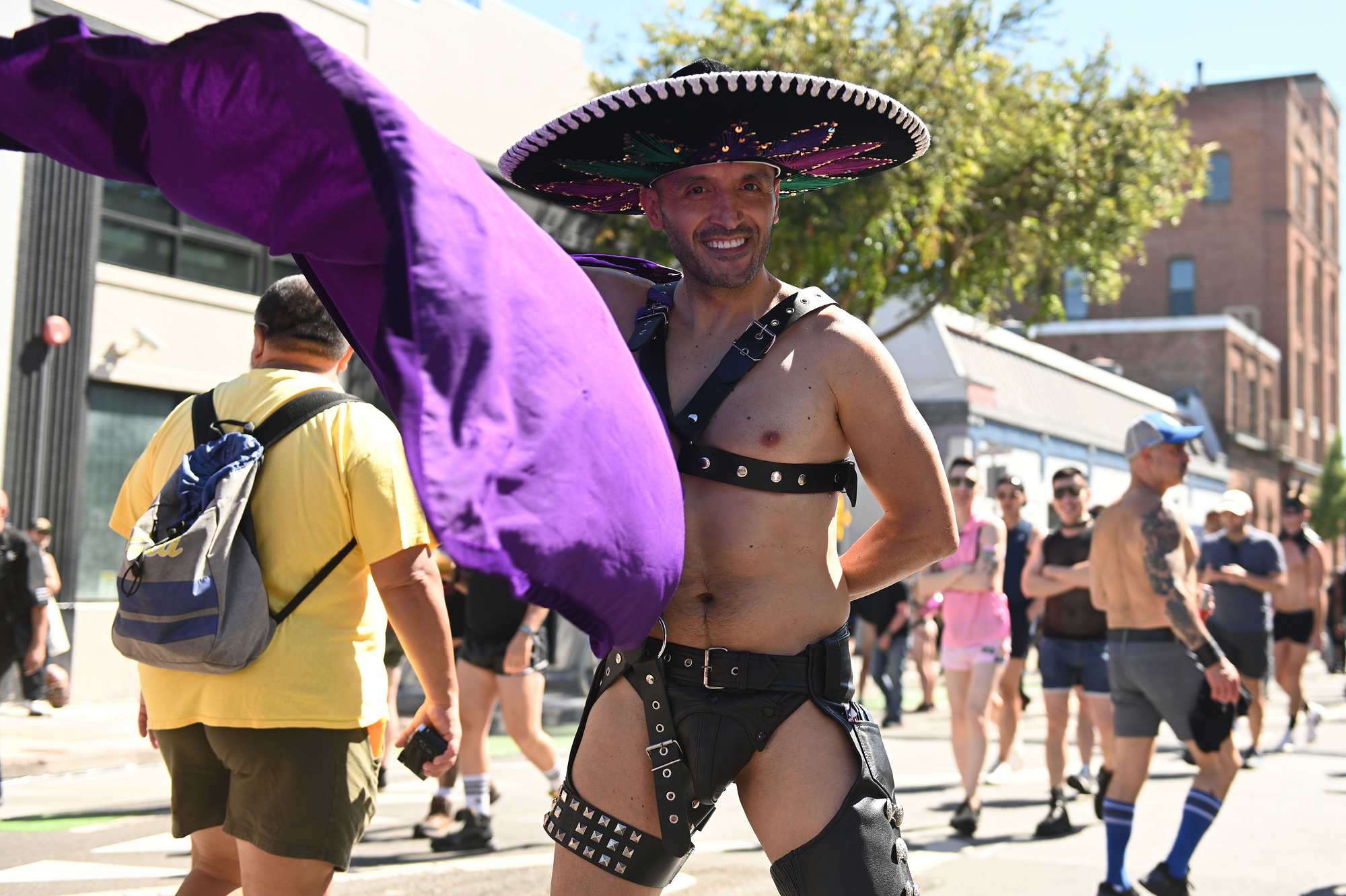 I continued down the street: Couples were having oral and anal sex, and then I met a very cute man donning a massive hat, a purple cape and leather harness, legstraps and jock. I asked to take his photo and he posed, whipping his cape out in front of him. And then we made out, kissing for all to see, before going our separate ways. I kept walking.