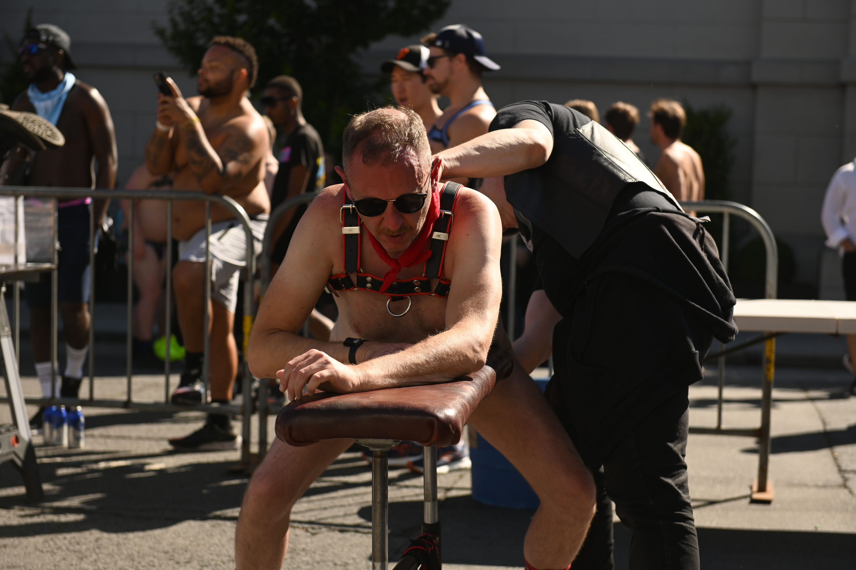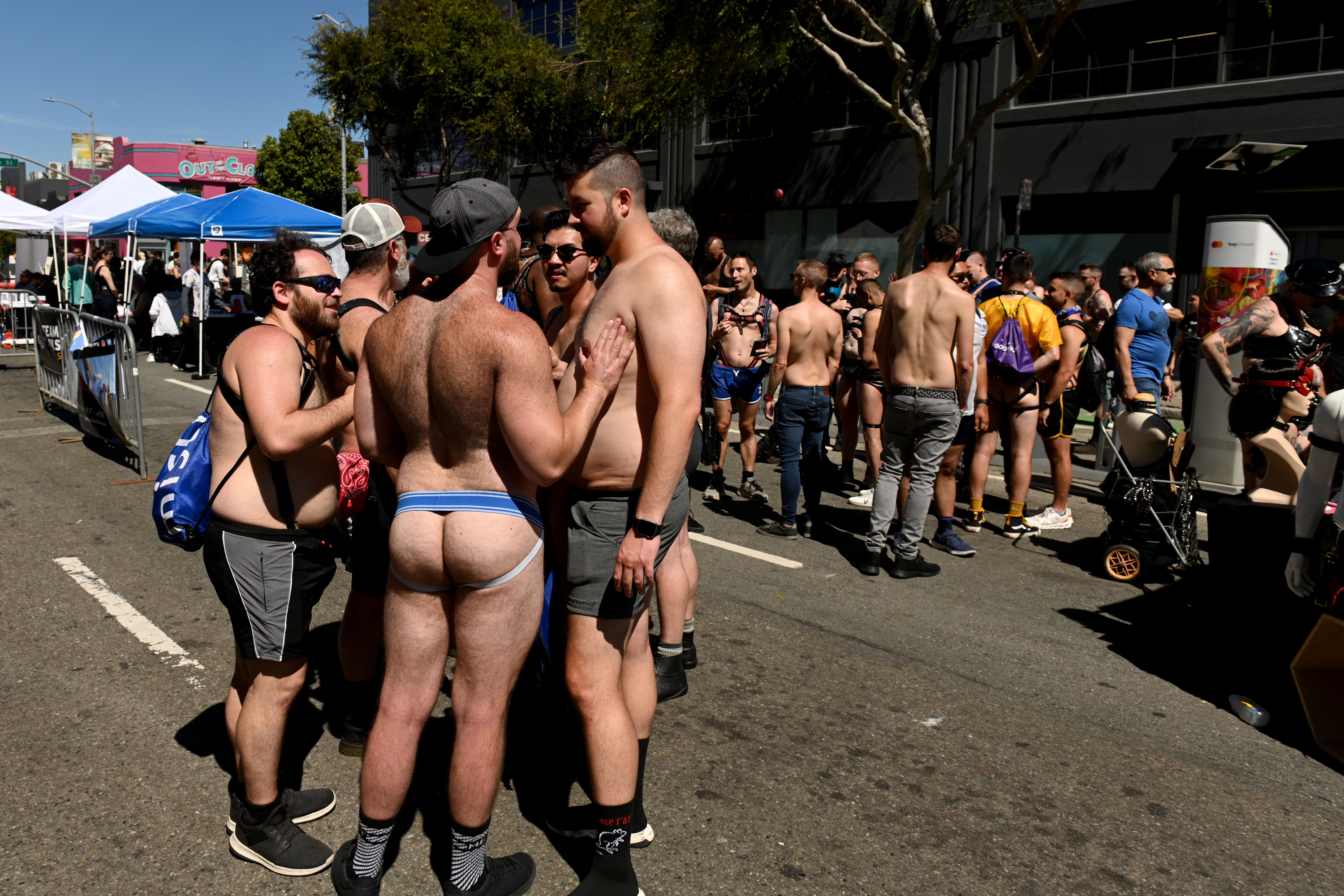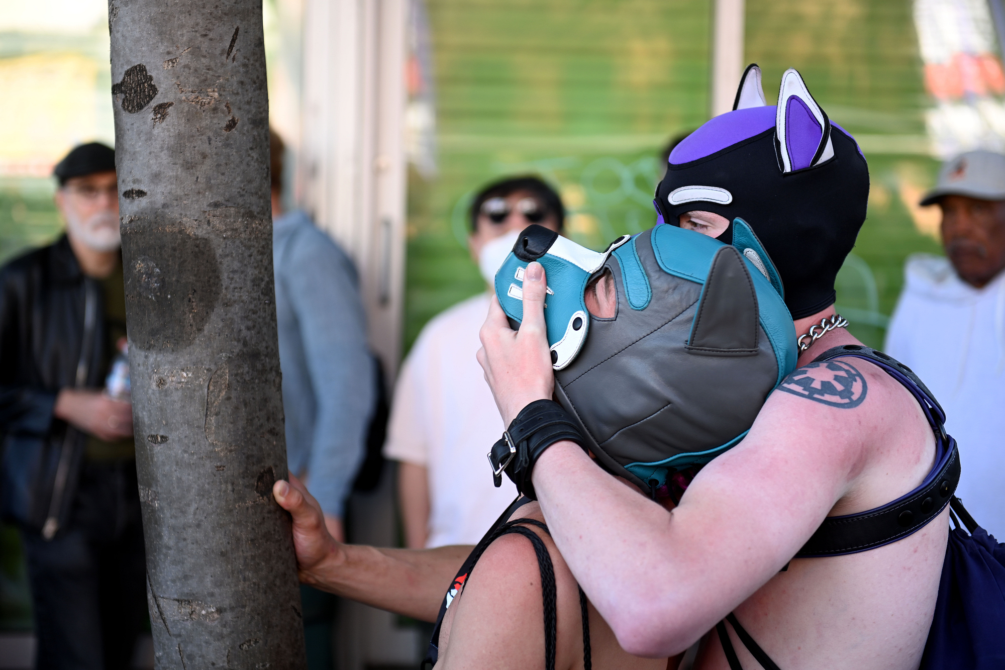 On a sunny day at the perfect temperature, I walked shirtless and pup-hooded down Folsom, taking in the sights of the kink and BDSM festival, “Up Your Alley.” Countless shirtless people, fit to fat, flat-chested to breast-baring, walked down the street, many exposing their rears wearing jockstraps and thongs. Many were outright naked, letting everything hang out for all to see.