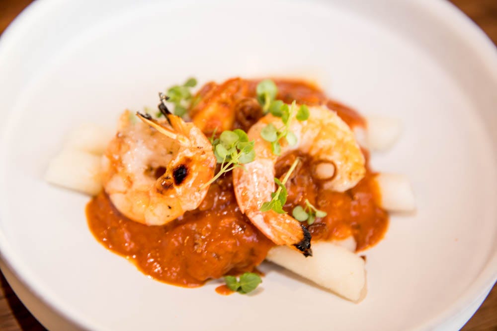 As one starts delving into the shareable small-to-medium-sized plates, this is where Min and Lim’s skills overwhelm little missteps in ambience, pairing and plating. Silky yellowtail wrapped in prosciutto was a unique and dreamy crudo-meets-Italian prosciutto and melon sort of feel. Accented with wasabi cream, dill oil, mango salsa and melon greens, it was a play in contrasts and a fresh take on ubiquitous crudo dishes on menus these days.