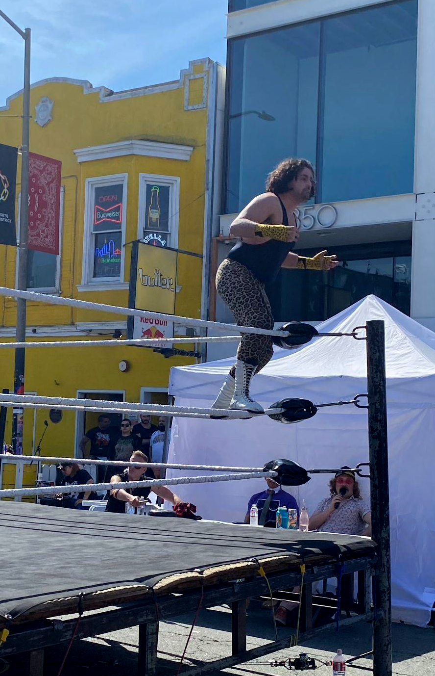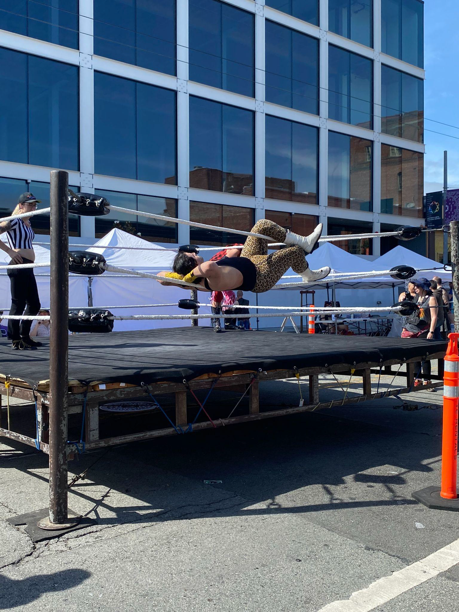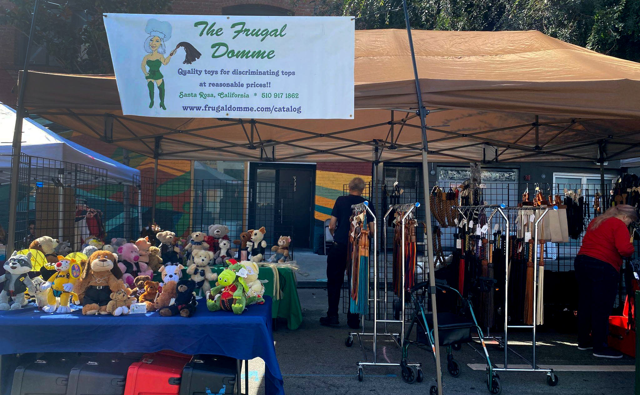 And let’s not forget the wrestling match arena and a wide array of shopping. Trans-run shops like The Spooky Haus made an appearance, along with mom-and-pop domme supplies. I made a stop for this trans pin and took a look at the selection of beautifully crafted floggers from The Frugal Domme.