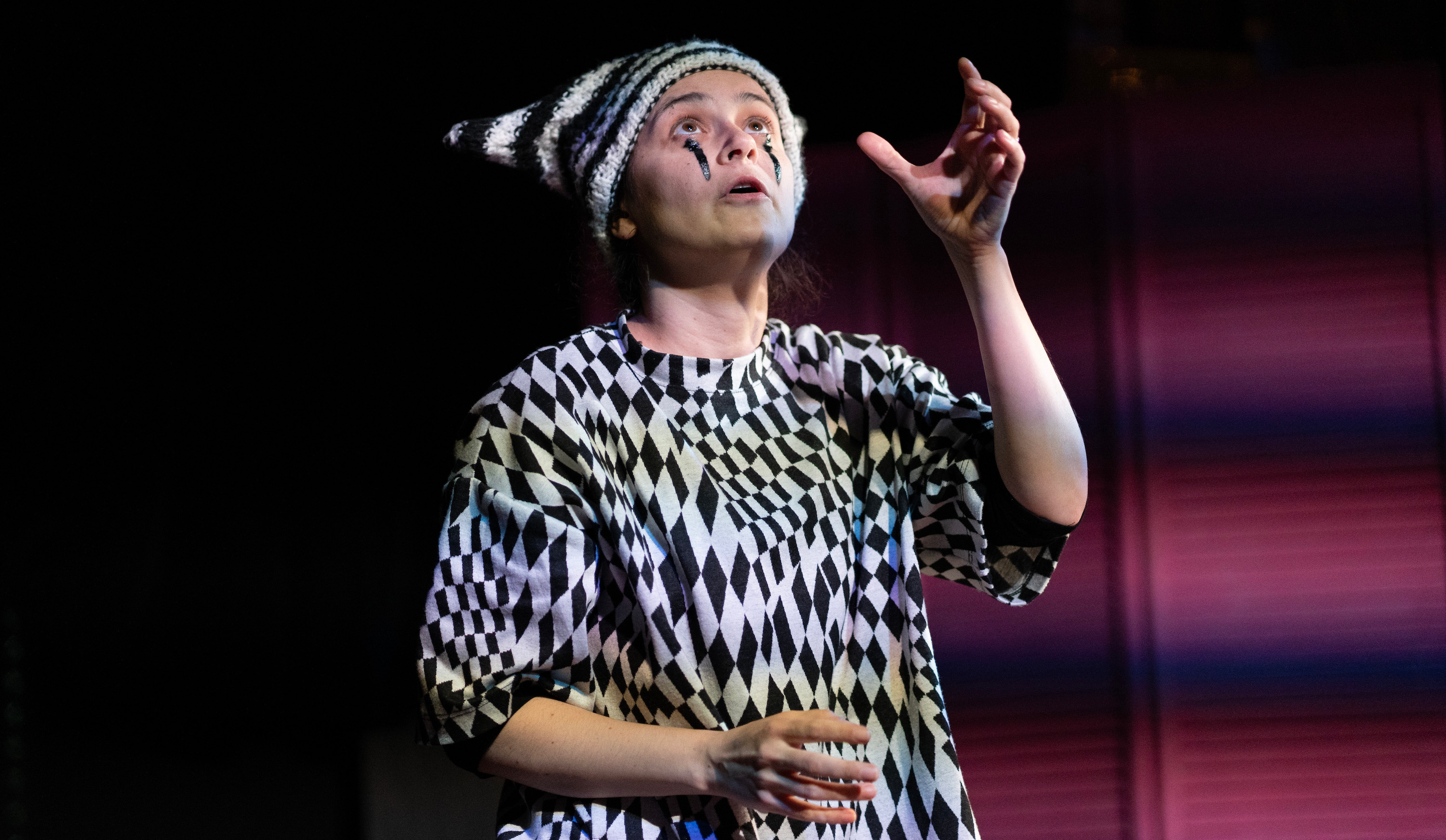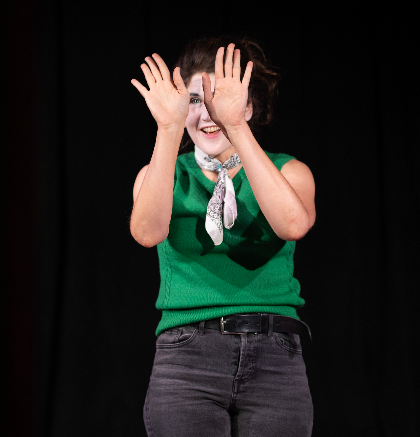 Standing on stage, you are struck by how close the audience is, despite your elevated position. There is nowhere to hide on the Church of Clown stage, by design — Griffiths wants minimal separation between the performer and the audience. Woolner toyed with this expertly during her show, whittling the separation down to the slimmest of barriers as she cajoled audience members to join her on stage and darted amongst the folding chairs herself.