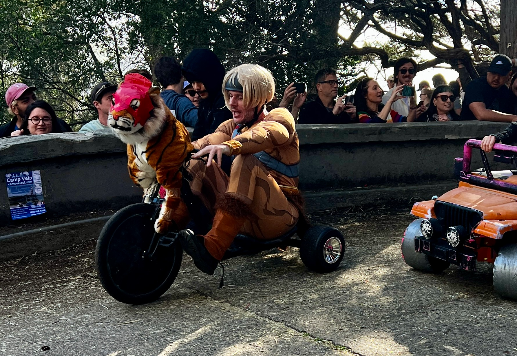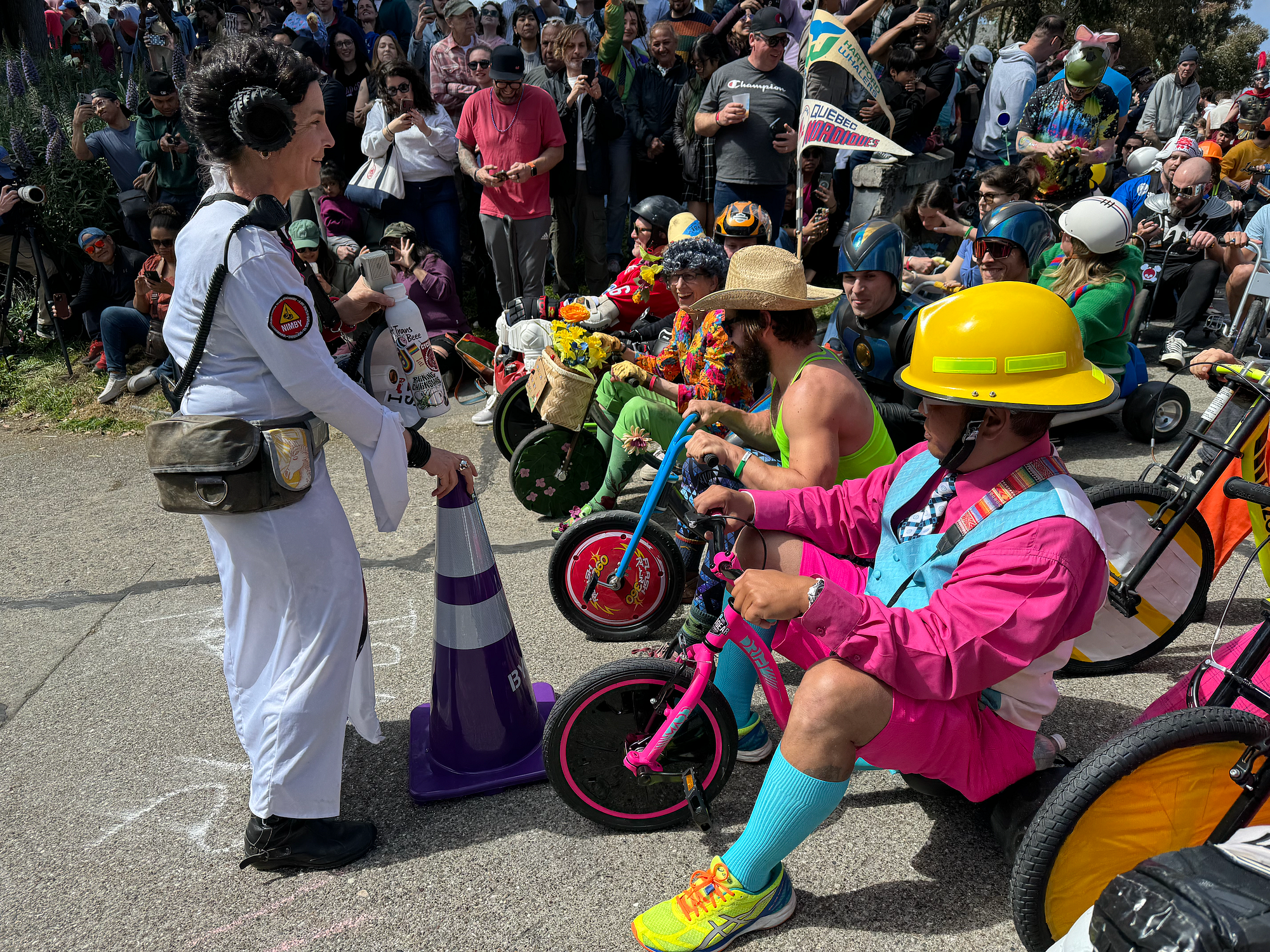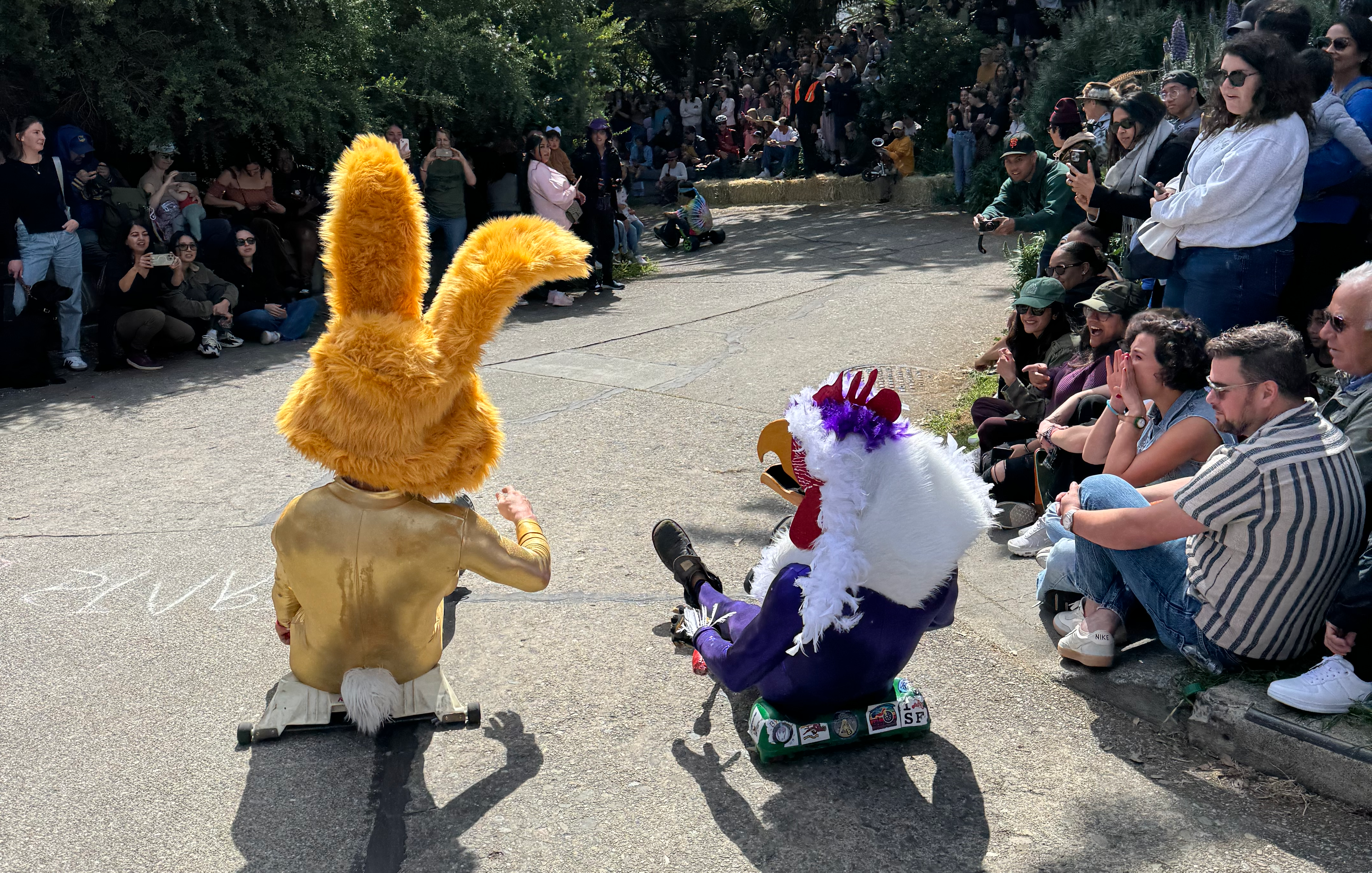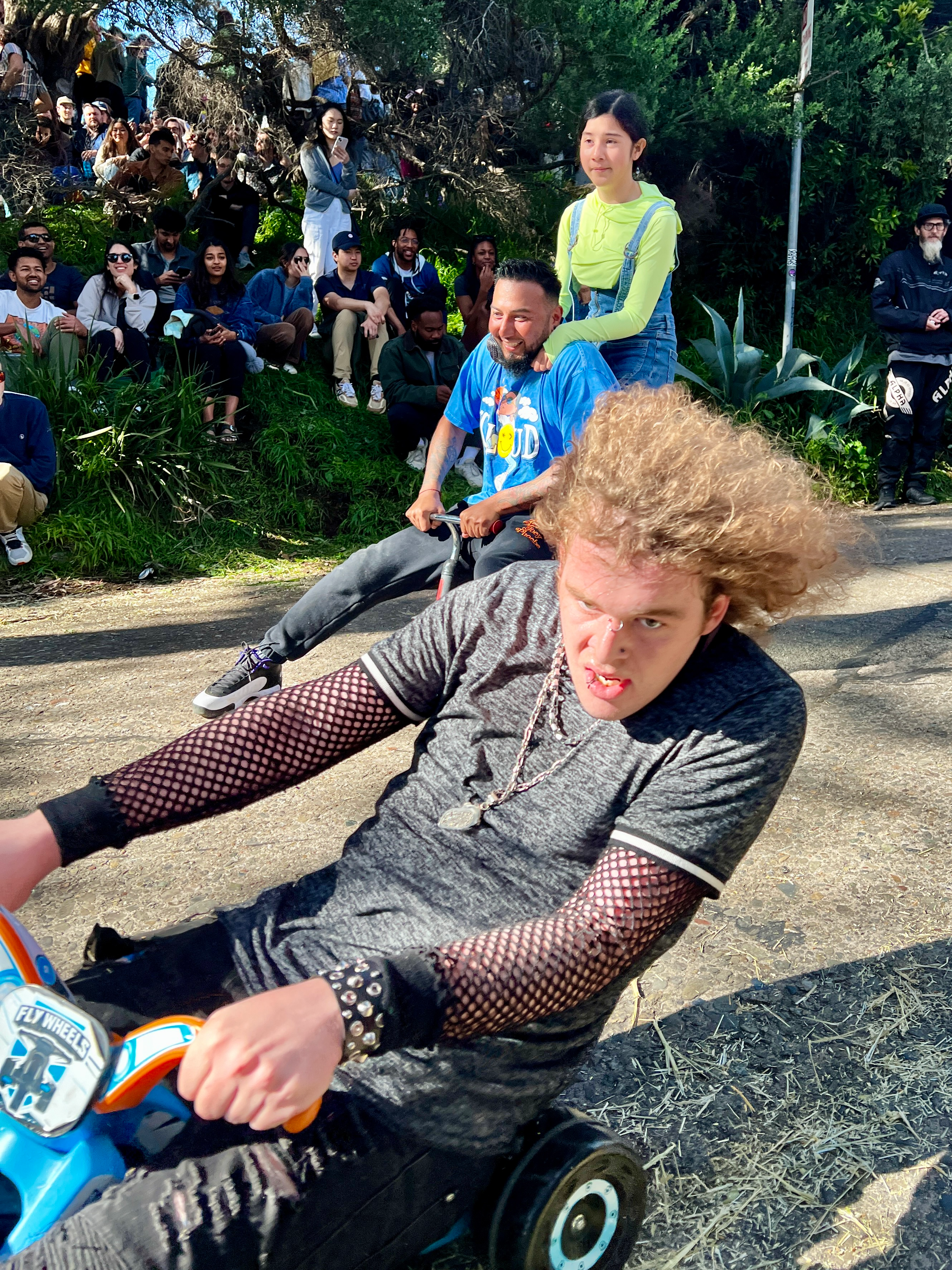 This year’s BYOBW, per usual, was not without its uncertainties. Rain threatened nearly all Bay Area Easter activities, so we were watching the weather forecast closely. But Sunday saw more riders and larger spectator crowds than I’ve seen in my decade-plus of volunteering, and the riders didn’t disappoint with costumes. Personal favorites: the He-Man riding a plush Battle Cat, a duo of gentlemen in lederhosen who tag-teamed their rides holding (sometimes full) beer steins, and a Rolleblade Ken who wore actual roller blades while also maneuvering his trike down the hill. Life in plastic is fantastic.