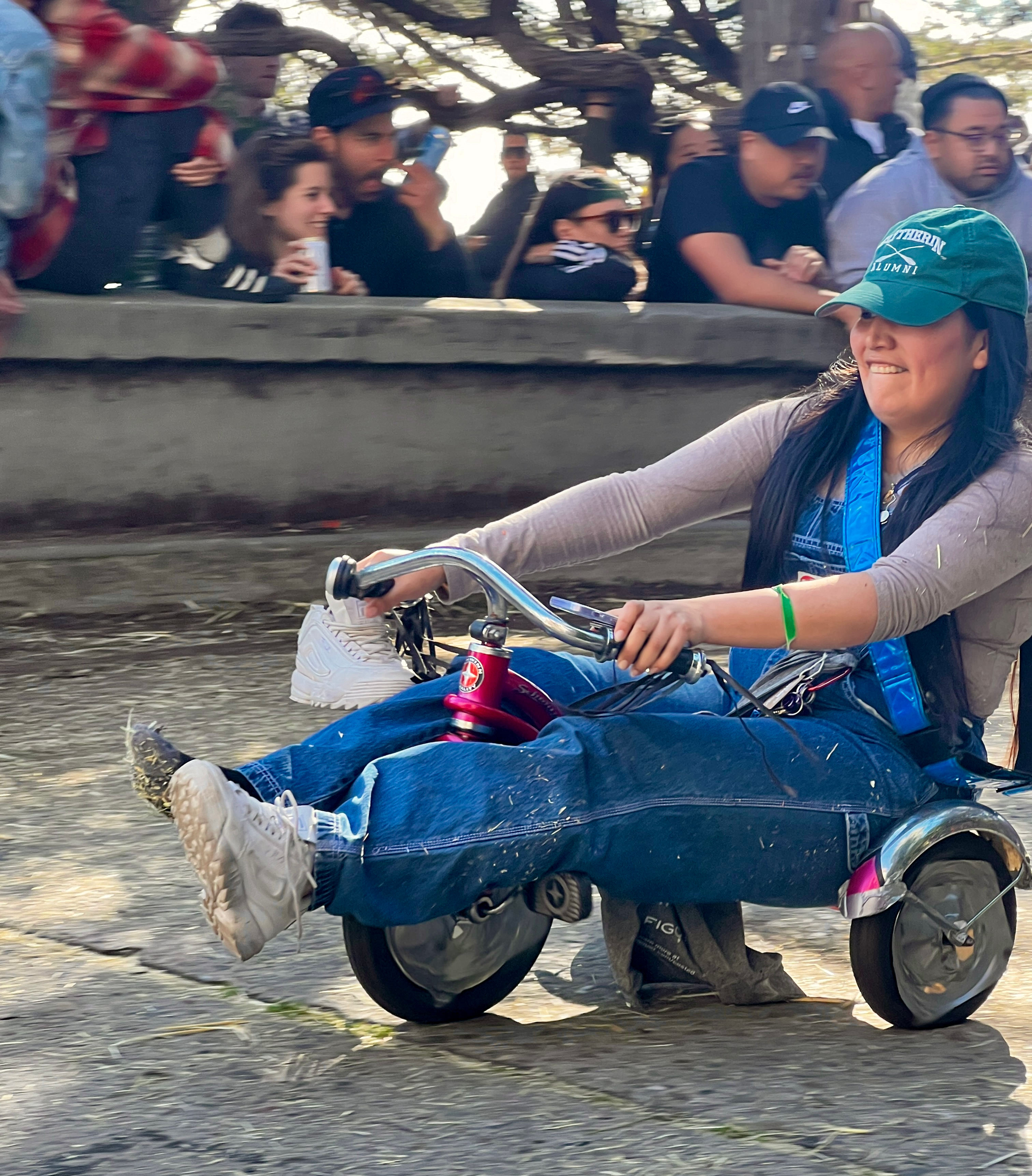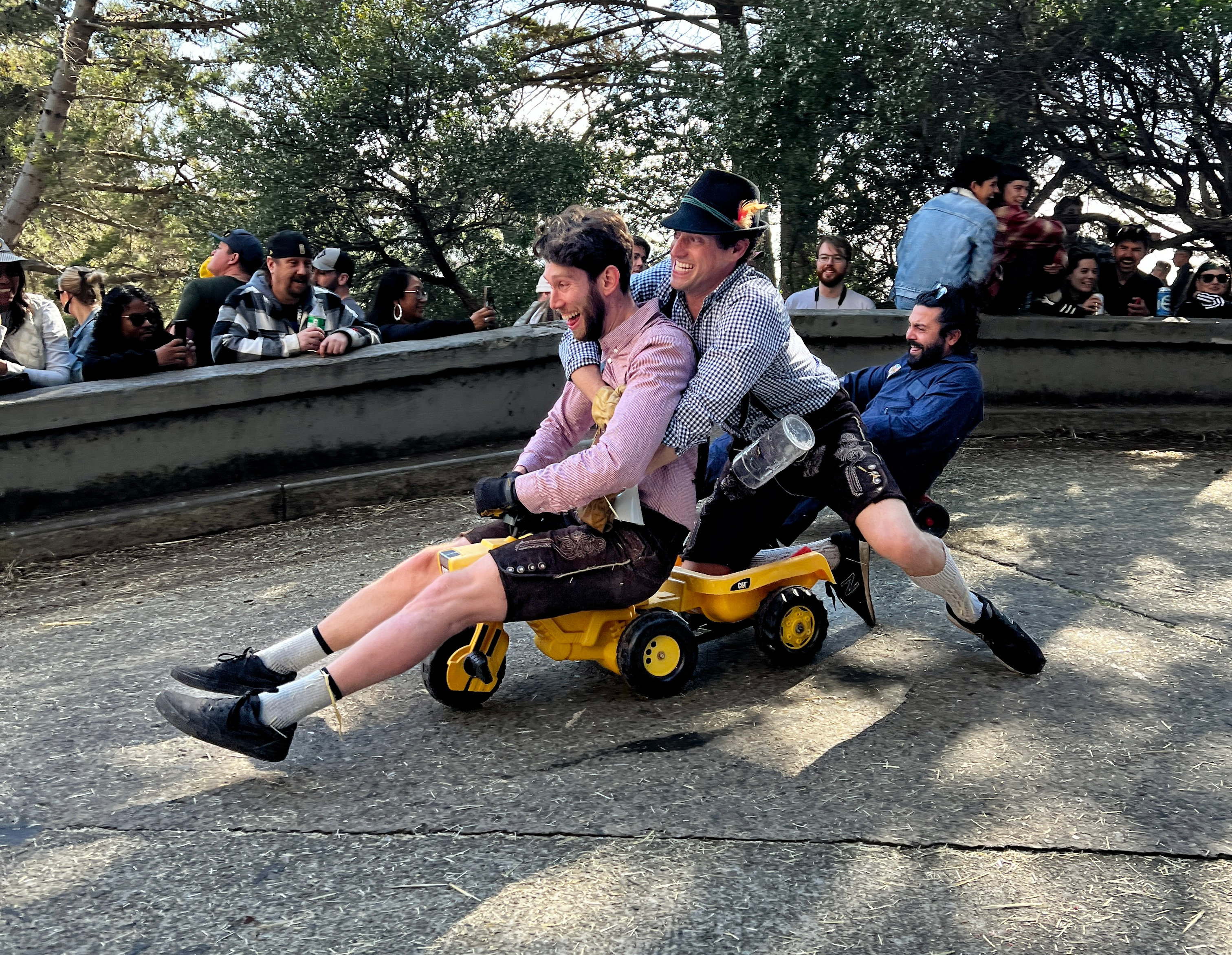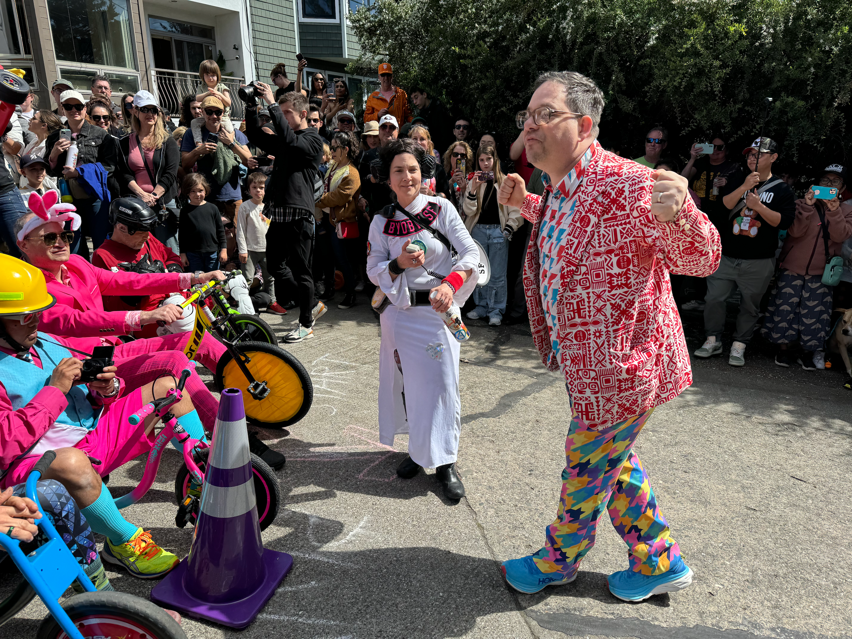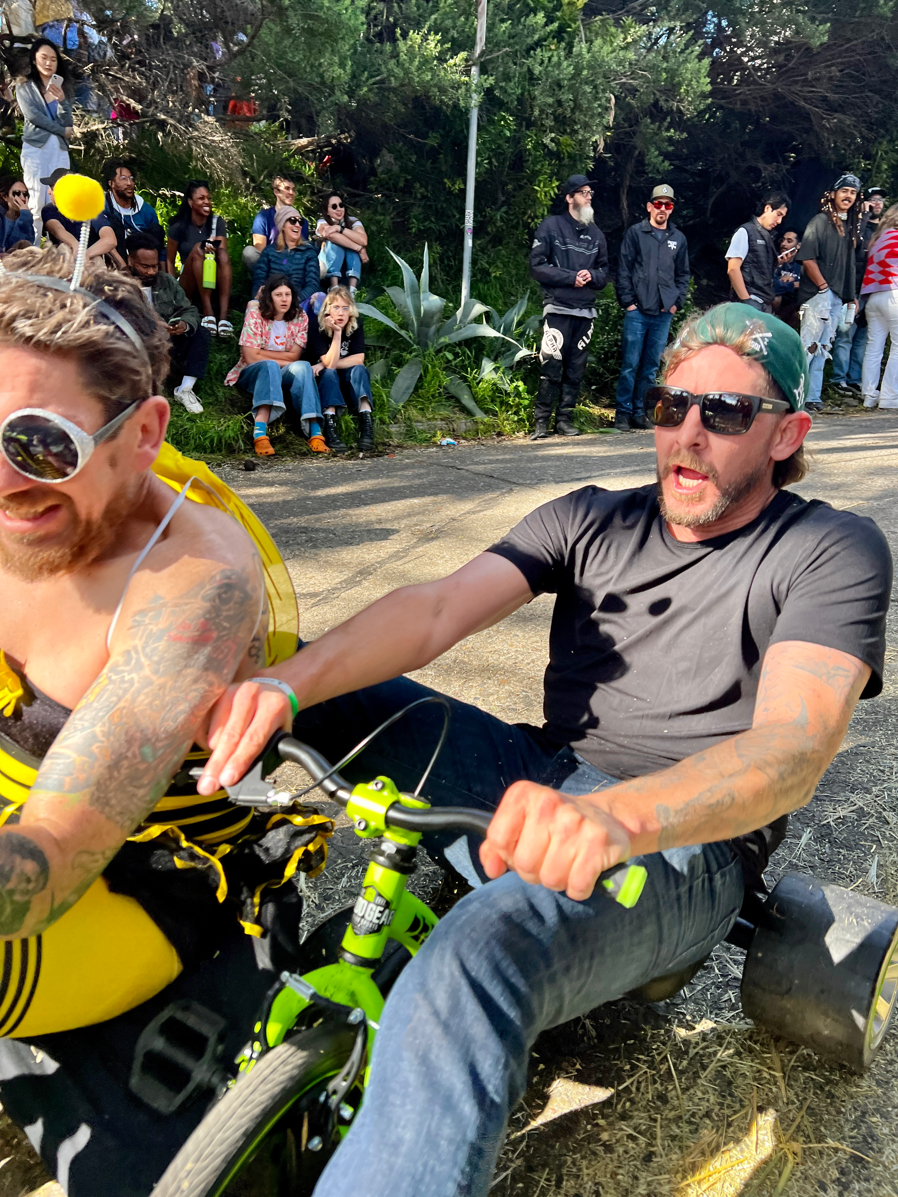 This year’s BYOBW, per usual, was not without its uncertainties. Rain threatened nearly all Bay Area Easter activities, so we were watching the weather forecast closely. But Sunday saw more riders and larger spectator crowds than I’ve seen in my decade-plus of volunteering, and the riders didn’t disappoint with costumes. Personal favorites: the He-Man riding a plush Battle Cat, a duo of gentlemen in lederhosen who tag-teamed their rides holding (sometimes full) beer steins, and a Rolleblade Ken who wore actual roller blades while also maneuvering his trike down the hill. Life in plastic is fantastic.
