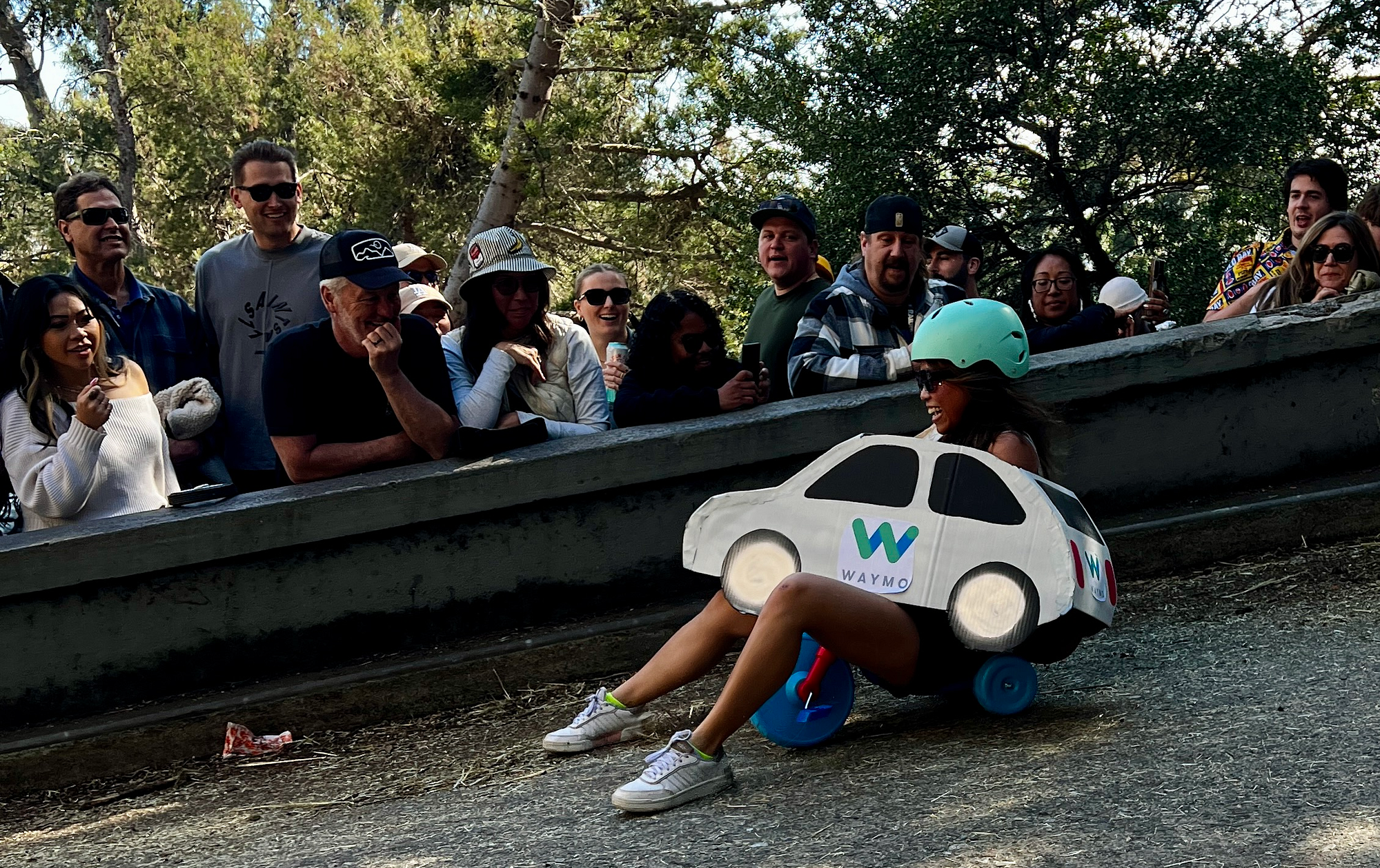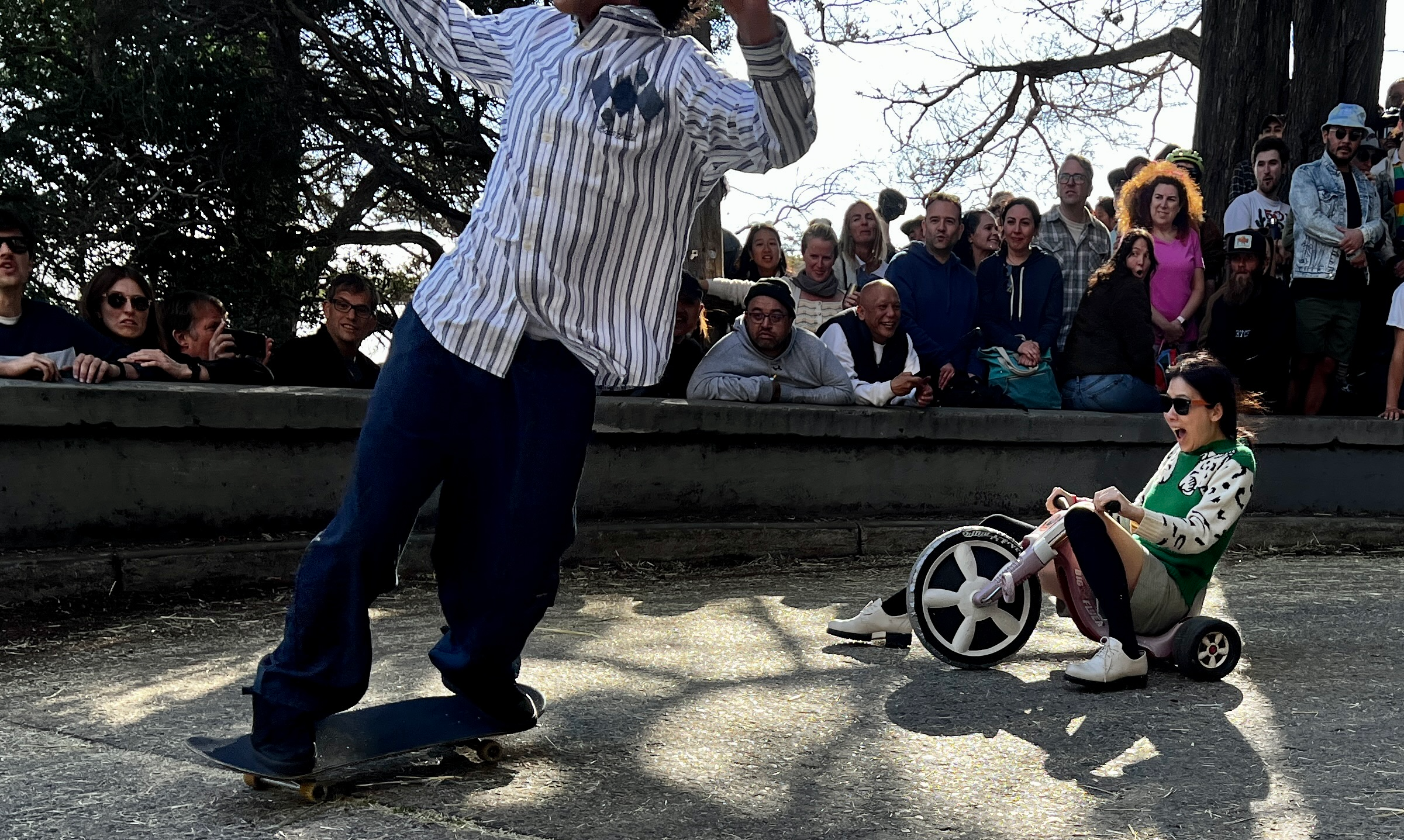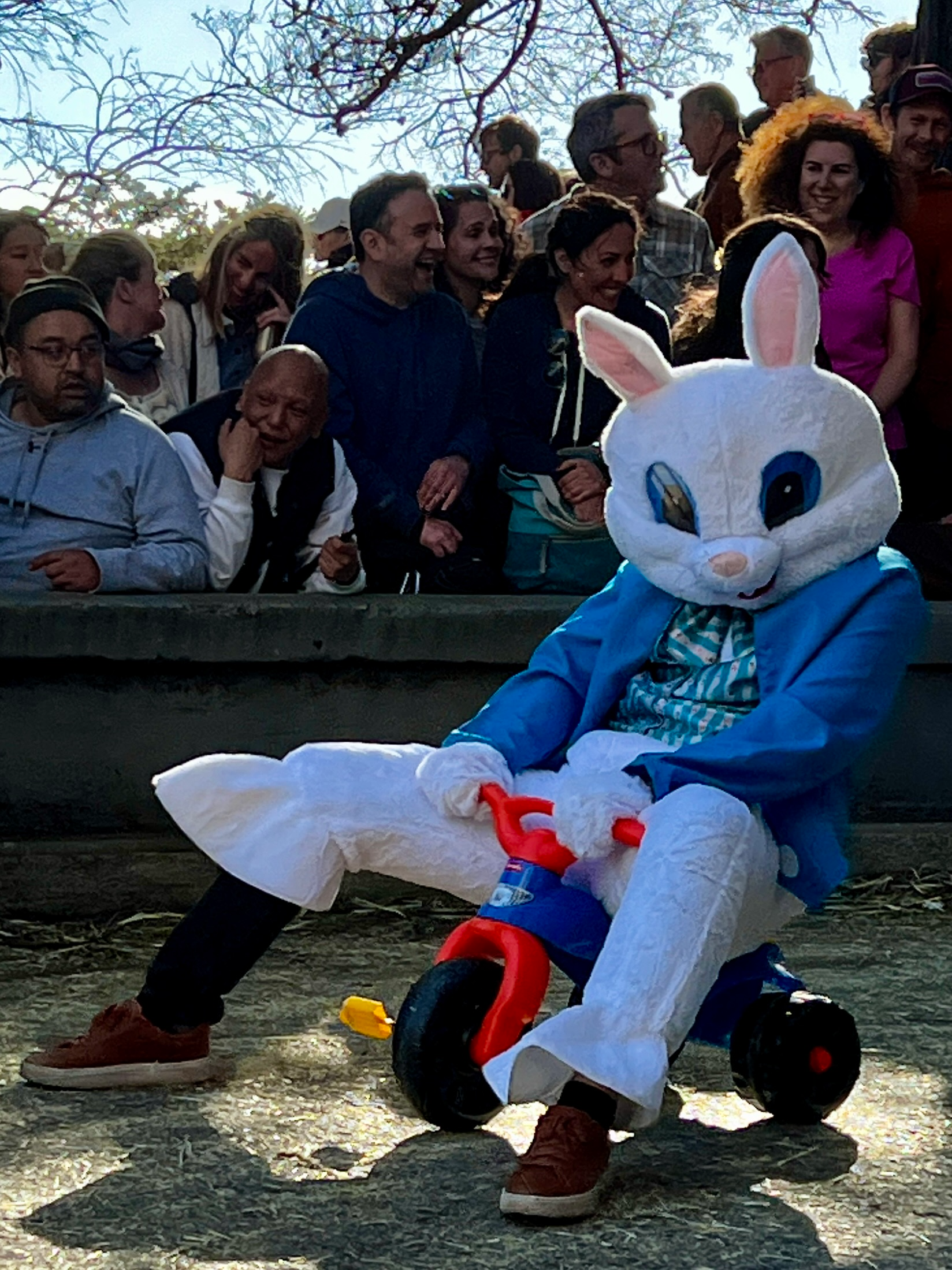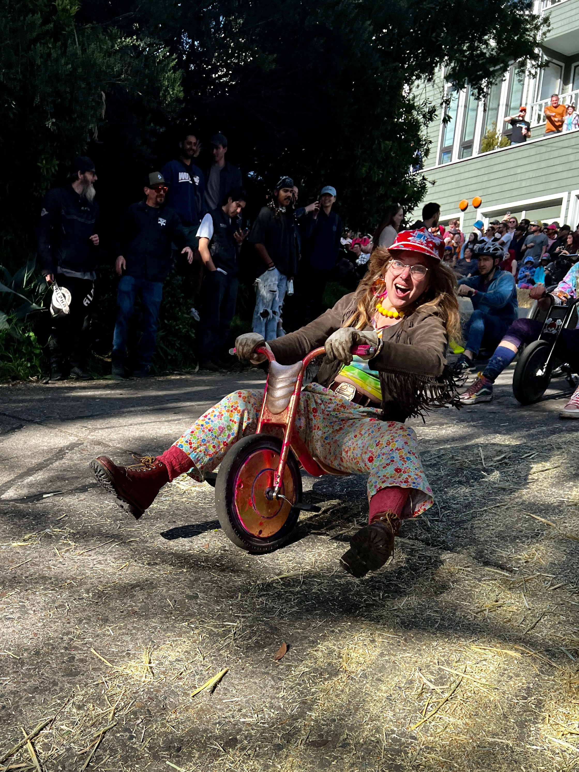 This year’s BYOBW, per usual, was not without its uncertainties. Rain threatened nearly all Bay Area Easter activities, so we were watching the weather forecast closely. But Sunday saw more riders and larger spectator crowds than I’ve seen in my decade-plus of volunteering, and the riders didn’t disappoint with costumes. Personal favorites: the He-Man riding a plush Battle Cat, a duo of gentlemen in lederhosen who tag-teamed their rides holding (sometimes full) beer steins, and a Rolleblade Ken who wore actual roller blades while also maneuvering his trike down the hill. Life in plastic is fantastic.