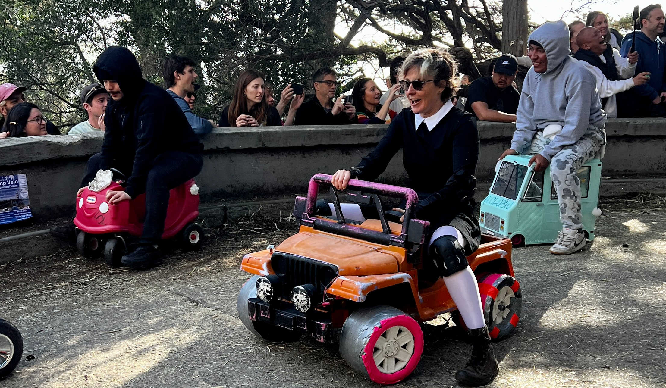 Then, adult children queue up at the starting line and the spectacle that ensues is nothing less than pure, unmitigated glorious ridiculousness. In true San Francisco fashion, many riders arrive costumed. Gilmore says one of the biggest rewards she gets out of organizing, aside from working with friends and family members who volunteer to help keep all of the moving parts running, is “the pure joy I sees on people’s faces when they’re careening down the hill dressed like a leprechaun or a banana or Jesus in a tiara.”