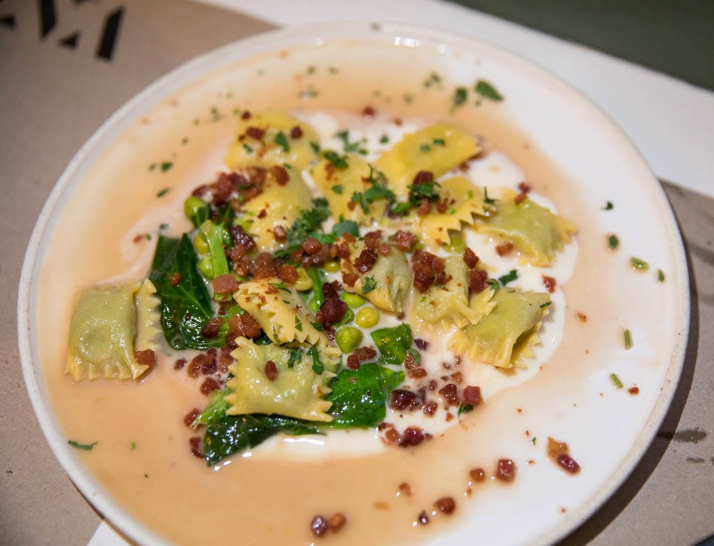 Given my adoration for a proper pasta en brodo (in broth), especially after my travels in Italy’s Emilia-Romagna region where rustic tortellini en brodo is art form, I had to try the brodo en sacchetti starter of three Italian soup dumplings in chicken broth, dusted in Parmesan, with a nicely bitter spinach. Unfortunately, the pastas were so al dente they were almost hard. But I sopped up the broth and greens. Via takeout, I had enjoyed a solid tagliatelle Bolognese with fried kale so was expecting better.