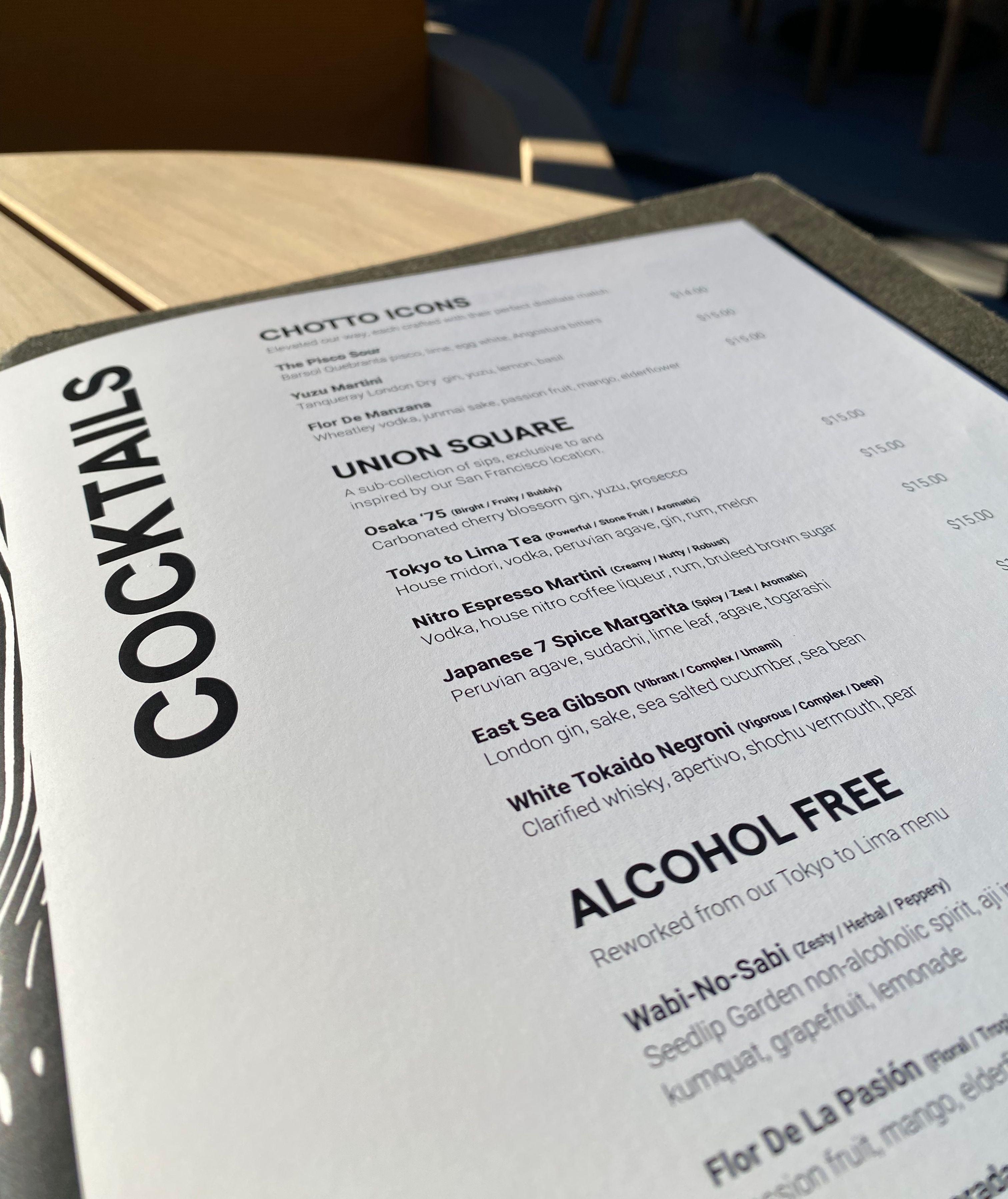 Chotto Matte brings to Union Square its “Tokyo to Lima” cocktail menu, a bevy of beverages with strong herbal overtones. While I had my heart set on the Union Square offerings, “exclusive to and inspired by our San Francisco location,” the server informed us that key ingredients for all of them were out. We instead went with the Kakigori and El Camino from the Tokyot to Lima collection: a vodka lychee-infused sherbet and tequila-mescal affair, respectively.