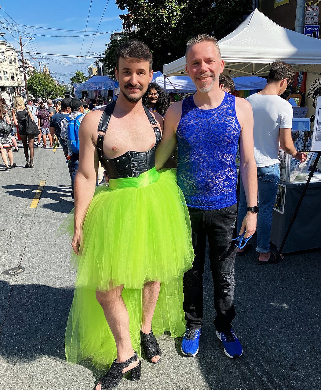 Each LGBTQ+ festival carries a different vibe in San Francisco: Pride is our annual national spotlight on the local community, and likewise, Folsom brings us widespread attention and celebration within sex, kink, fetish, and shared intimacy spaces. Dore Alley is like a little sibling of Folsom, and Castro Street Fair likewise appeals more to a local crowd. The latter’s always been just a little racy with nudists and some sporting fetish wear, but also quite family friendly with many local vendors, dance parties, sidewalk art, and just happy people.