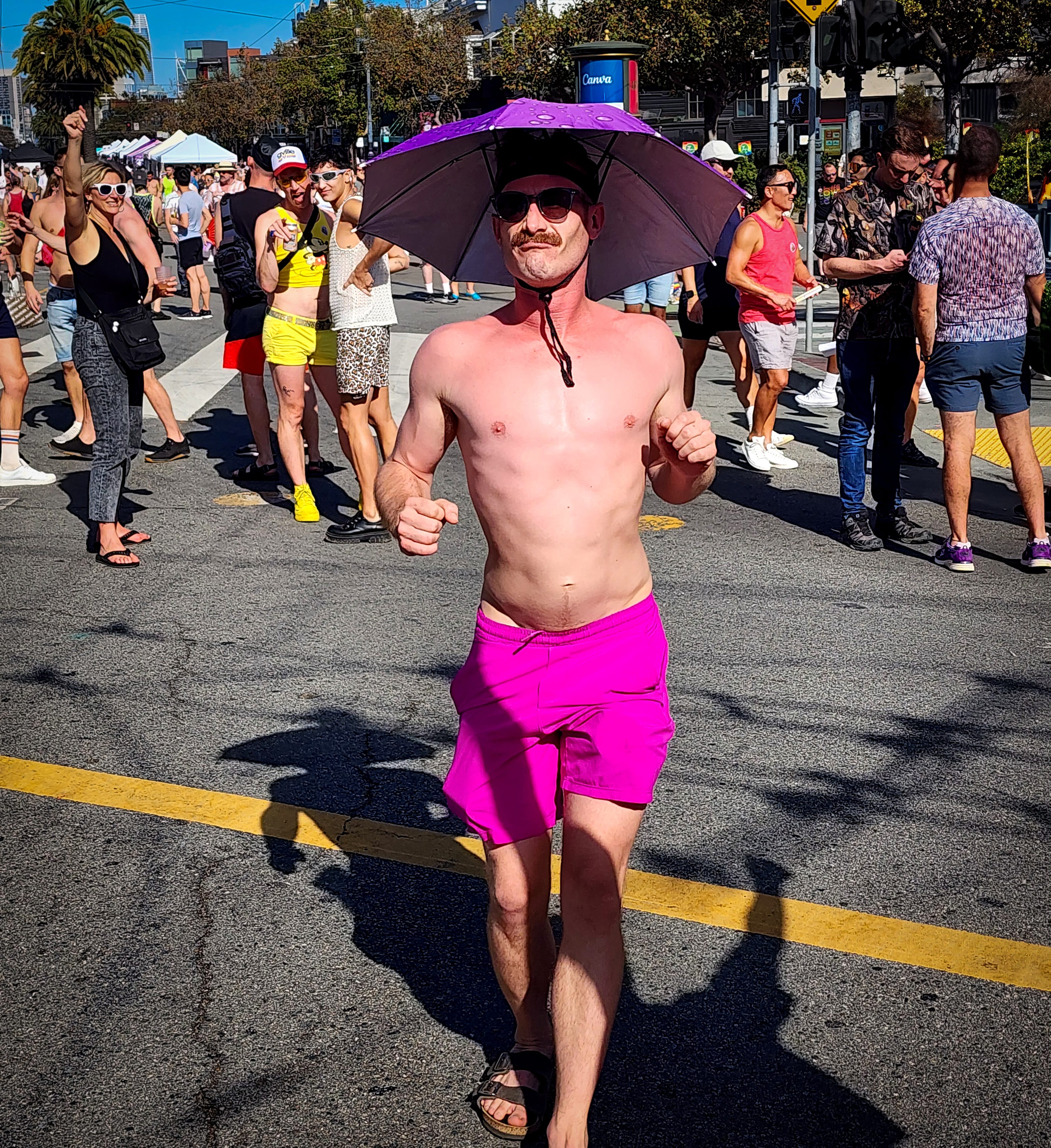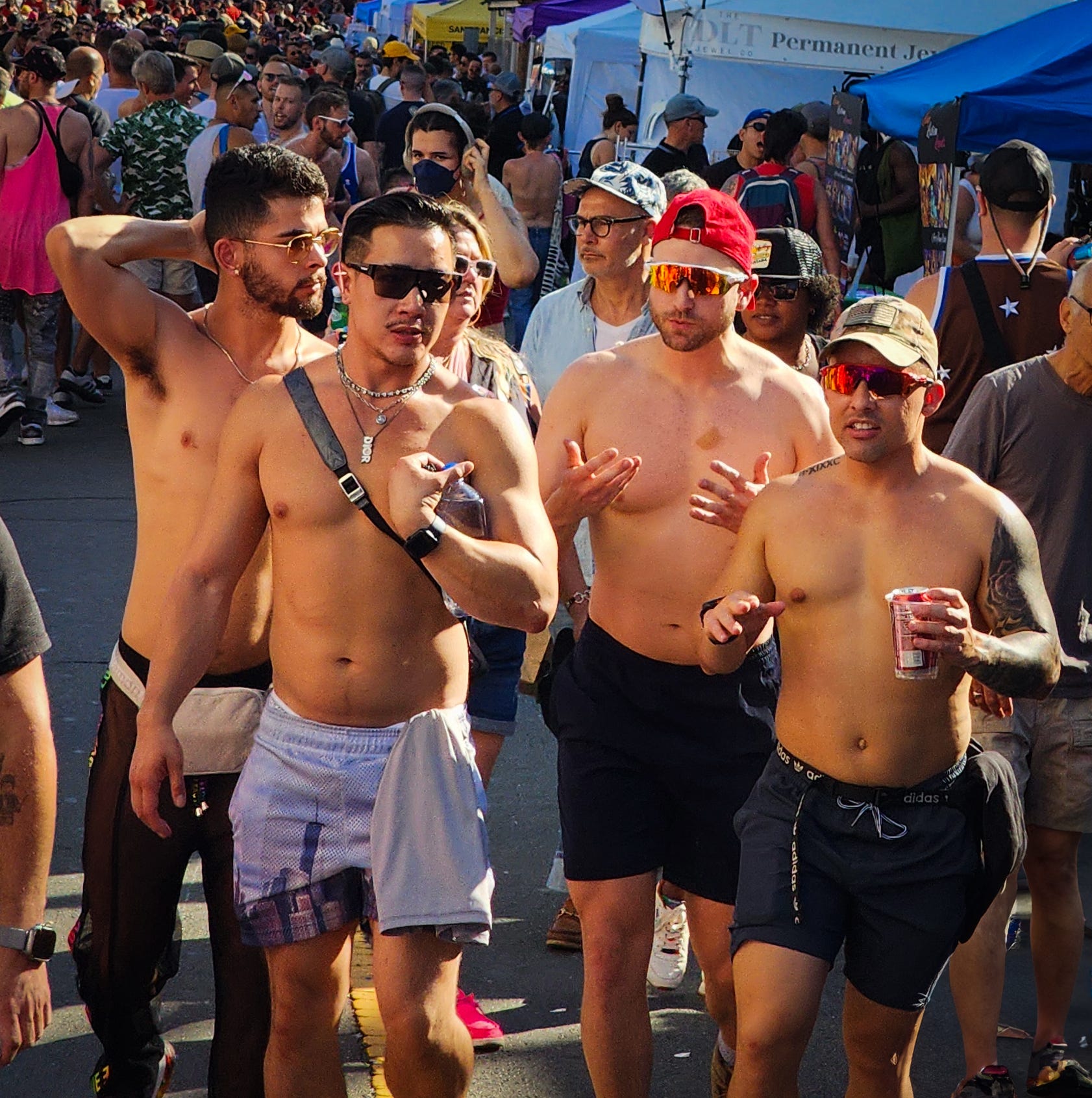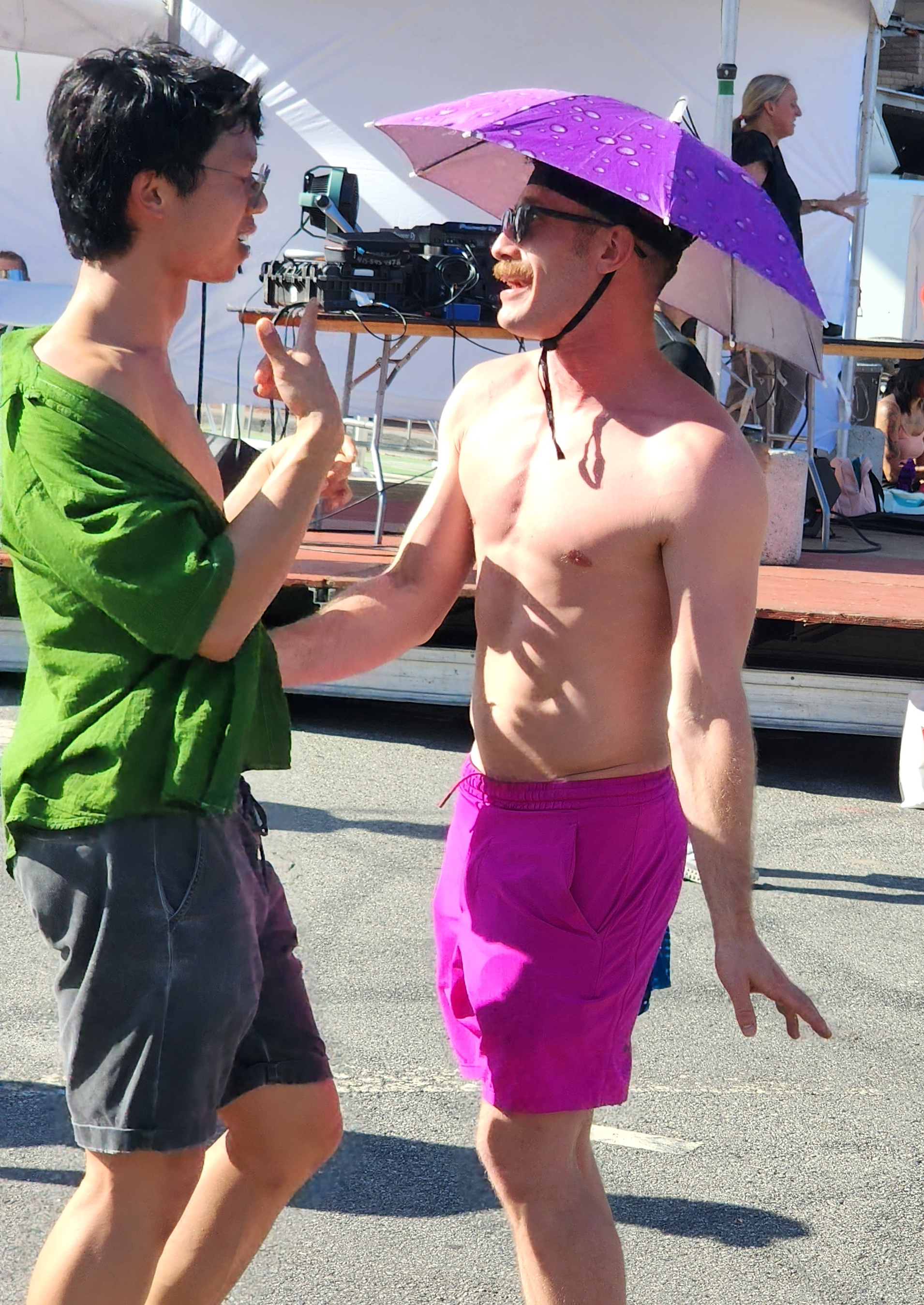 The 2024 street fair brought us a blistering 94-degree sun, which on the one hand created a veritable meat market with eye candy everywhere. On the other hand, we all huddled beneath every shady area and whined our way through the day. But this also gave us an amazing parasol parade: