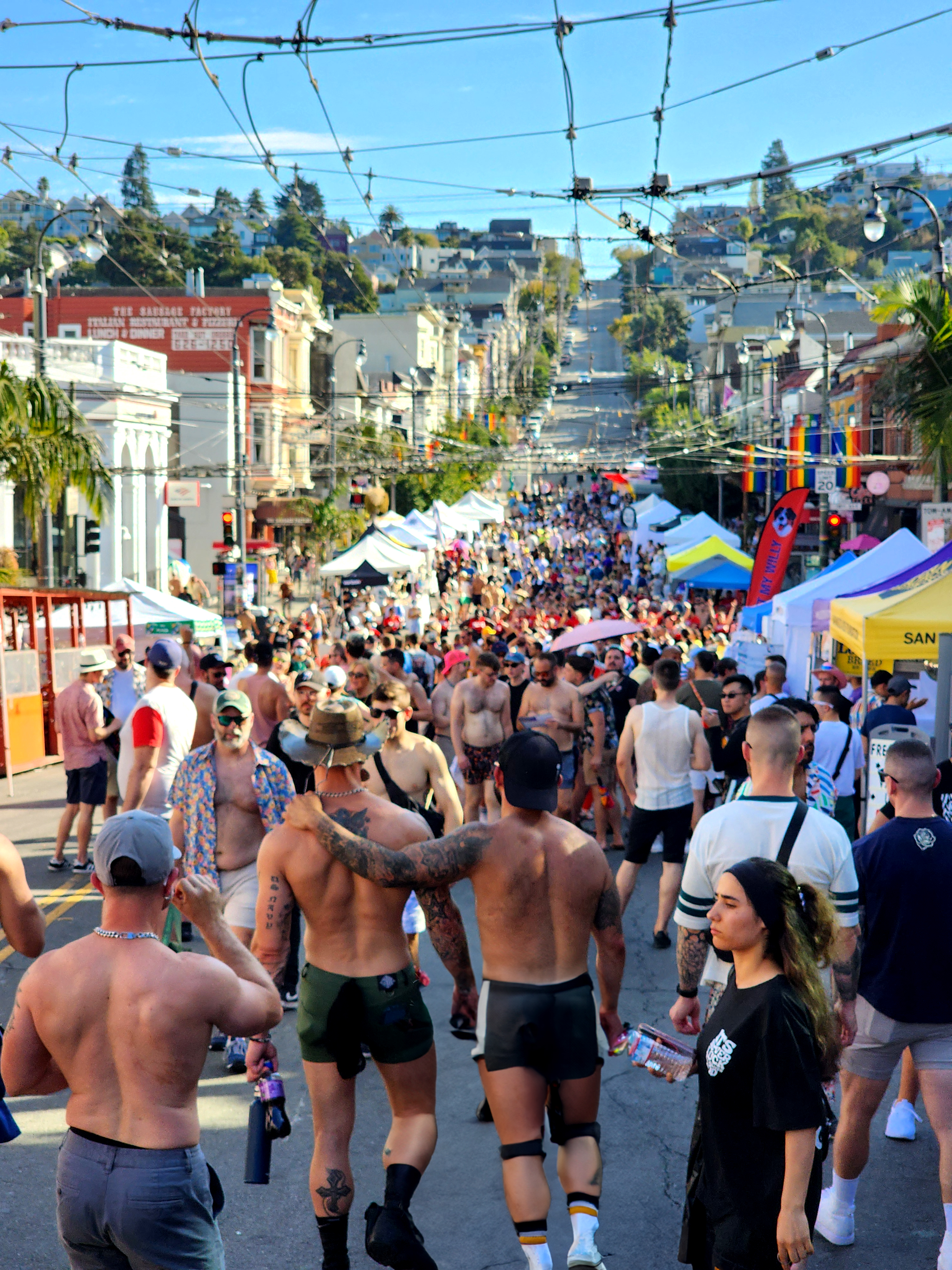 The fair feels different post-pandemic, and I don’t mean it’s smaller; In San Francisco we’re often complaining about lifeless parts of town, but to me the Castro Street Fair has been pulling in a large, younger cohort that’s ready to party for the past several years. We did see a bit of a dip because of the heat this year — climate change is real — but likewise still a very enthusiastic crowd in the thousands.