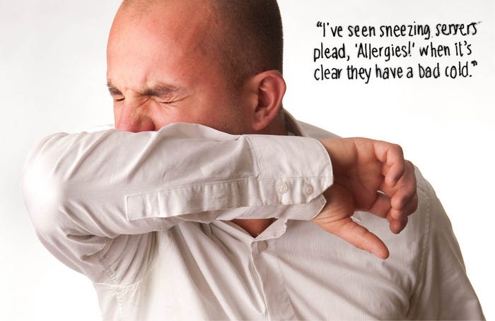 Most catering servers tend to be well-educated people with interesting back stories, and a lot of us genuinely care about the business, or we wouldn’t be in it. But we also do it because we need the money. Since you don’t accrue sick pay for irregular contract gigs, people will show up for work quite ill and then proceed to handle guests’ food. I’ve seen sneezing servers plead “Allergies!” when it’s clear they have a bad cold but couldn’t afford to miss out on $300. Staffers with stomach bugs “confess” they’re hung over, only to run to the toilet, fooling nobody.