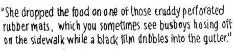 More prosaically, though, catering staffers are unnecessarily overworked, which leads to mistakes and contributes to a general atmosphere of “Well, my boss doesn’t give a shit, so why should I?” At least, that’s what I assume that chef was thinking the time I observed her drop a tray of baked Cornish game hens on the floor and pick them all right back up, continuing to prep them for a meal. The really gross part was that she dropped the food on one of those cruddy perforated rubber mats, the kind that looks like a black Connect Four rack, and which you sometimes see busboys hosing off on the sidewalk while a black film dribbles into the gutter. The chef shot me the deadliest look as she plated that game hen. I sort of sympathized and said nothing. What was her alternative, really? No entrées for one-third of the party? Who among us hasn’t observed the two-second rule?