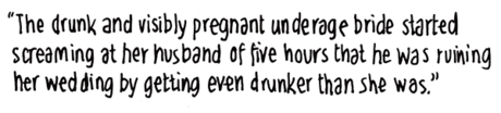 Medical emergencies aside, I love watching drama unfold, especially in situations in which you’d normally shy away out of embarrassment, but professional duty requires you to stand right where you are, behind the bar, facing the show. The most amazing thing I’ve ever observed was at a gorgeous outdoor summer wedding in Westchester, New York, when the drunk and visibly pregnant underage bride started screaming at her husband of five hours that he was ruining her wedding by getting even drunker than she was. It was magnificent. But the most satisfactory wedding was the one where I went home with the best man.