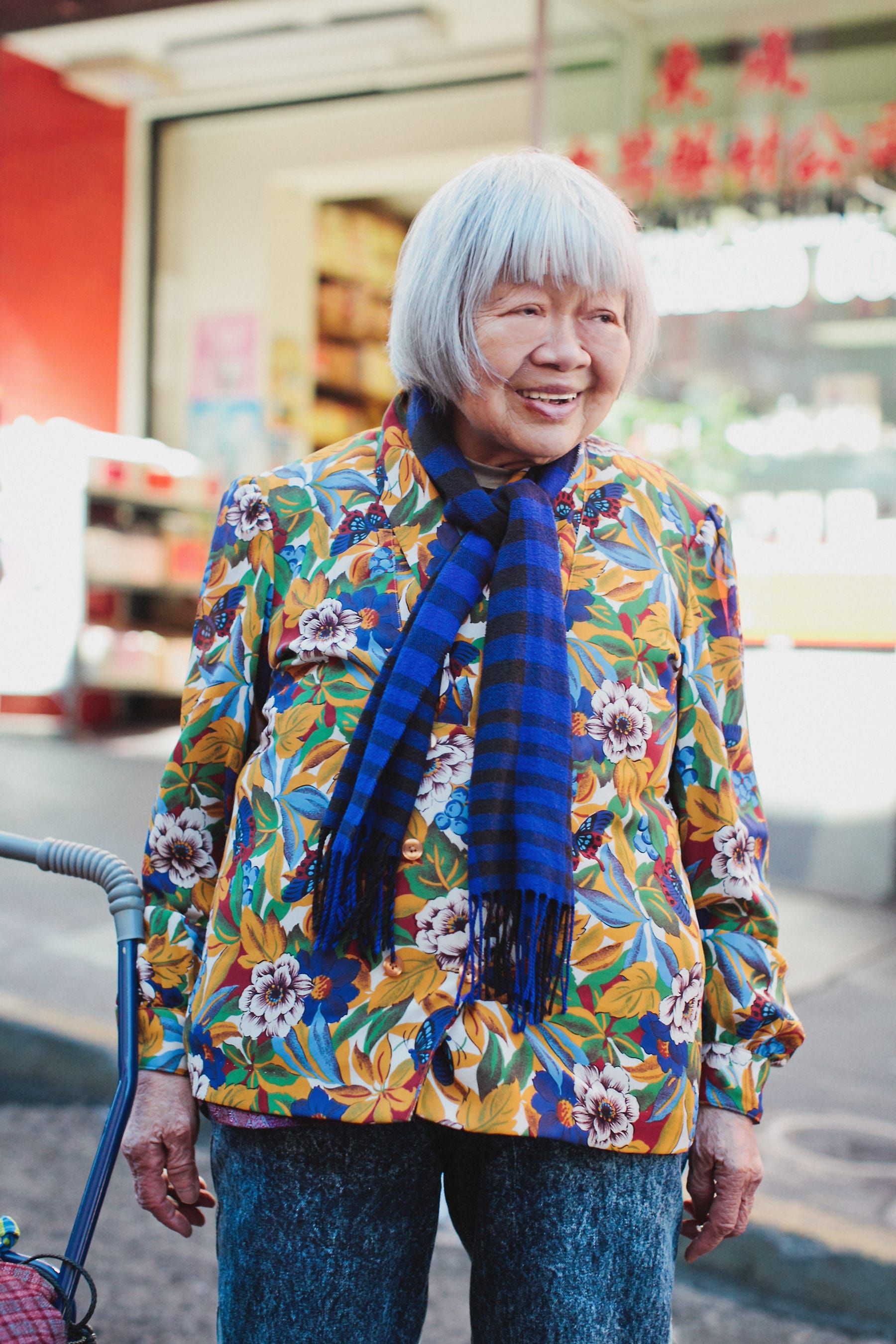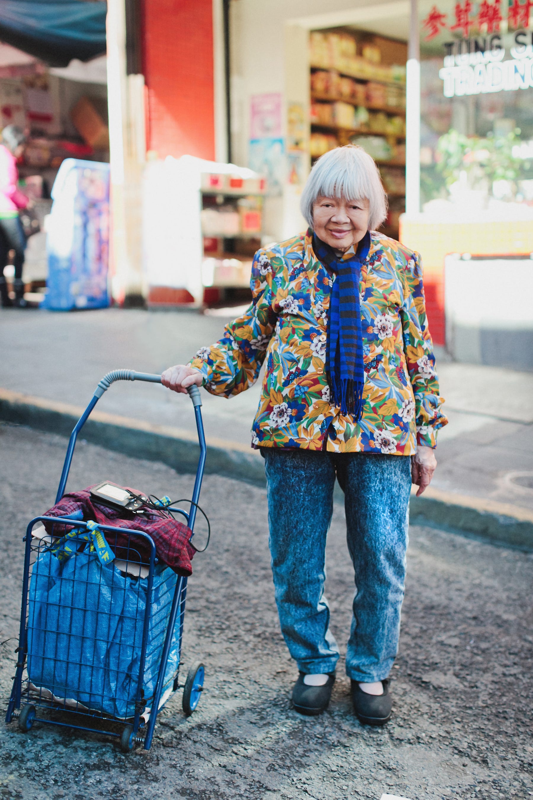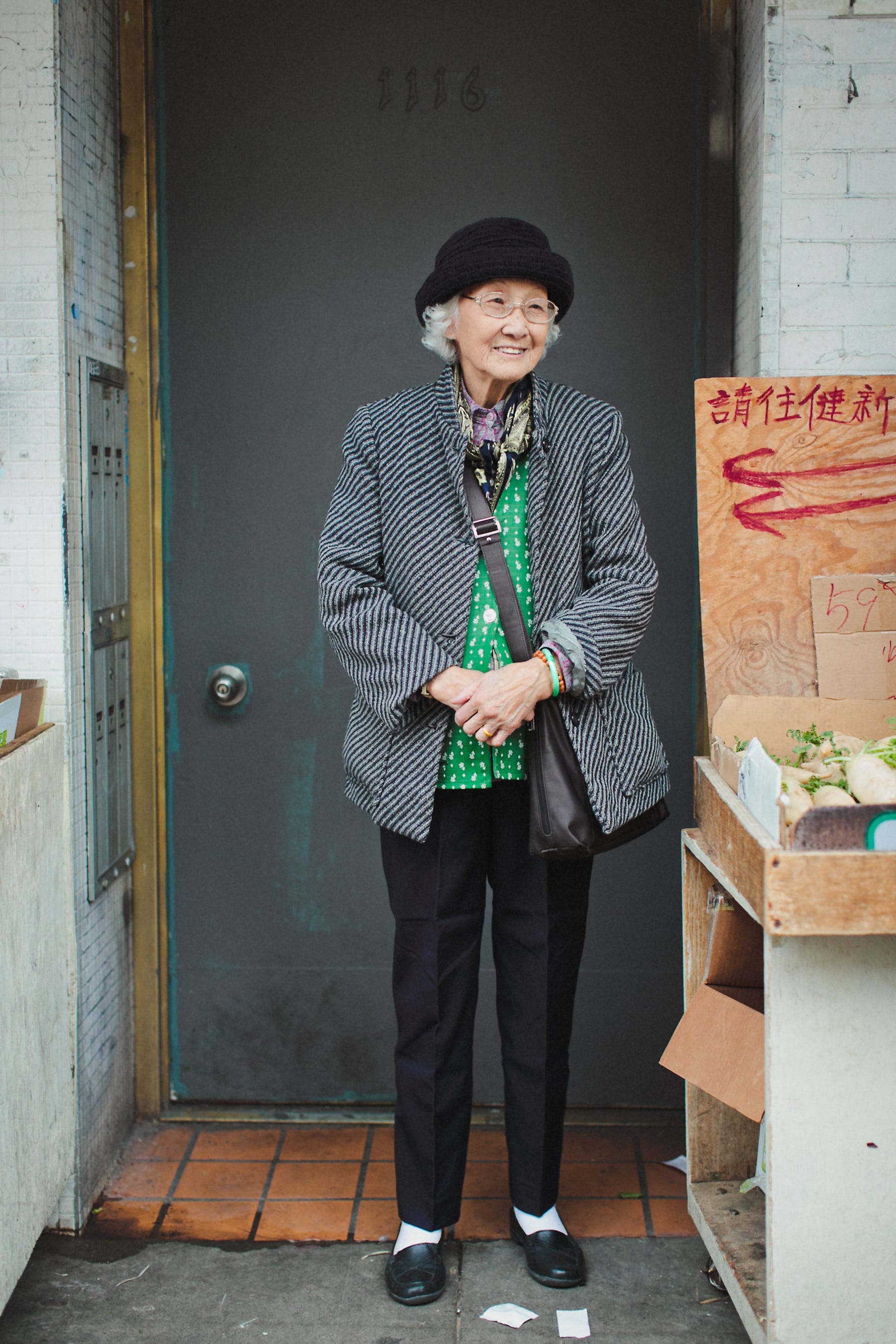 We cornered Yok Chung, a 90-year-old Chinatown resident, outside a grocery store on Stockton Street. She was a bit taken aback at first by the three of us, a gaggle of girls touching her tweed coat and complimenting her on her layers of silk—a jade blouse with a purple paisley shirt underneath and a black-and-gold paisley scarf around her neck.