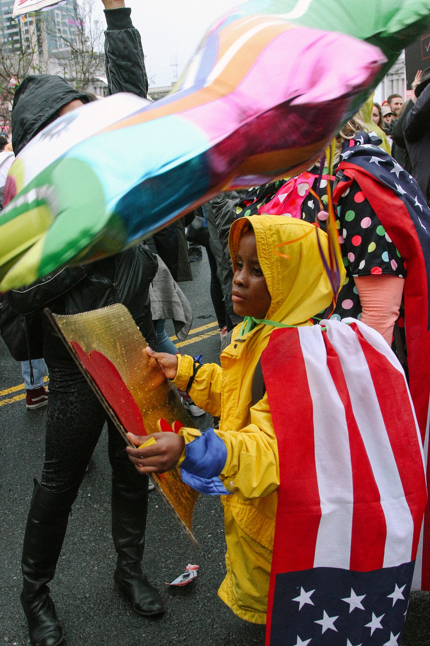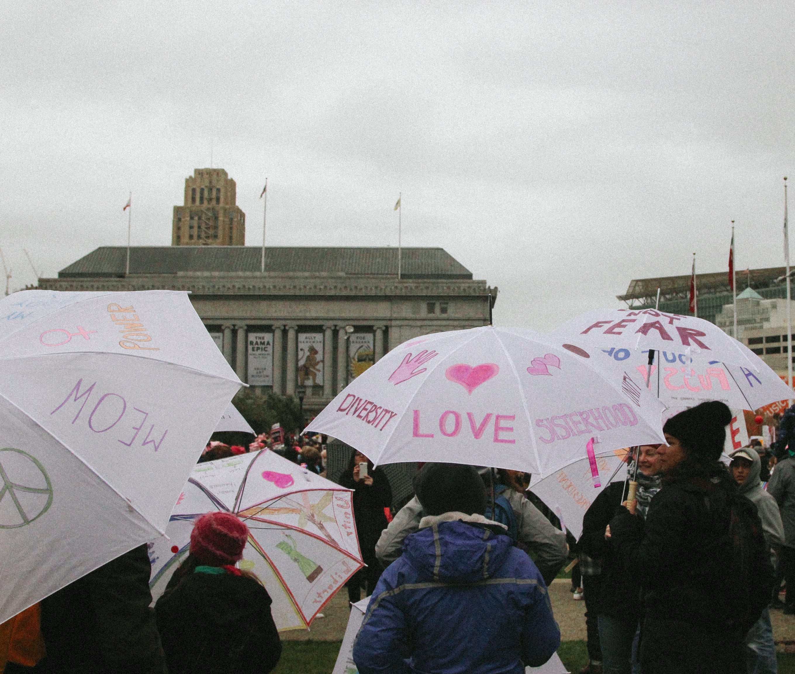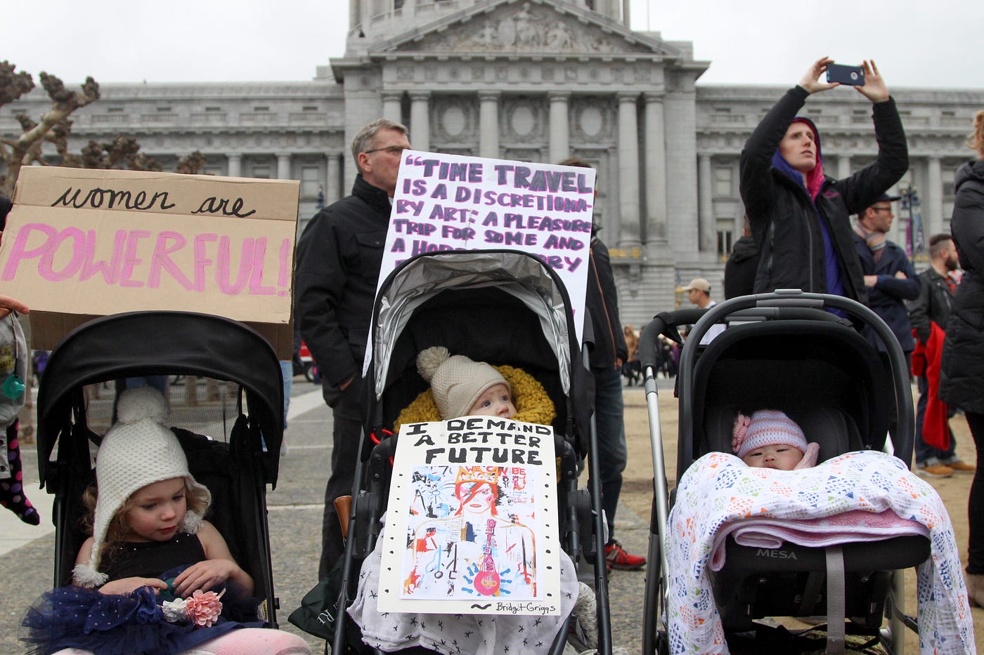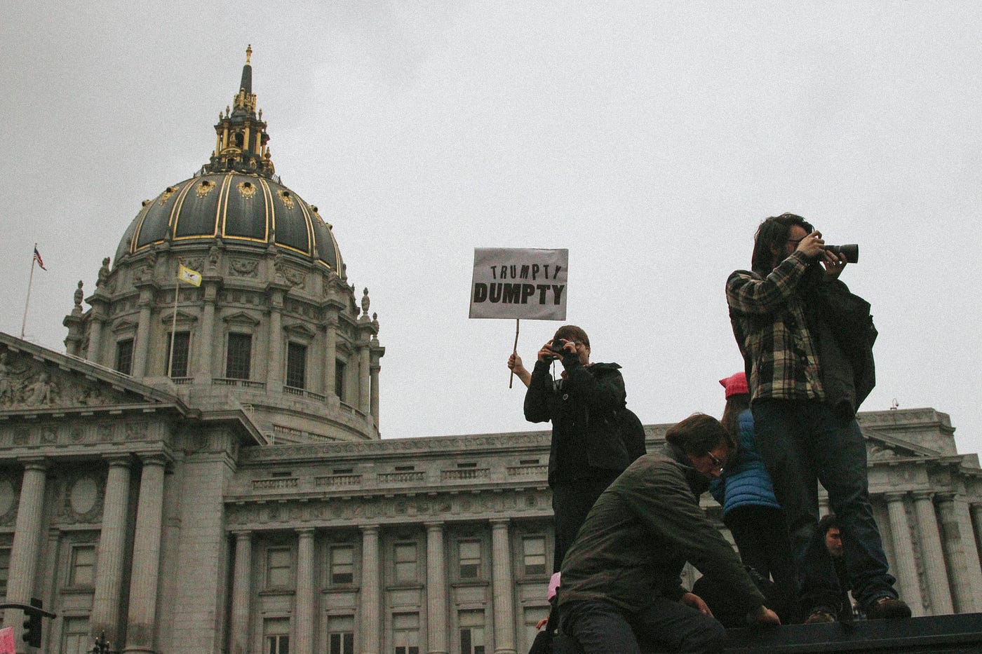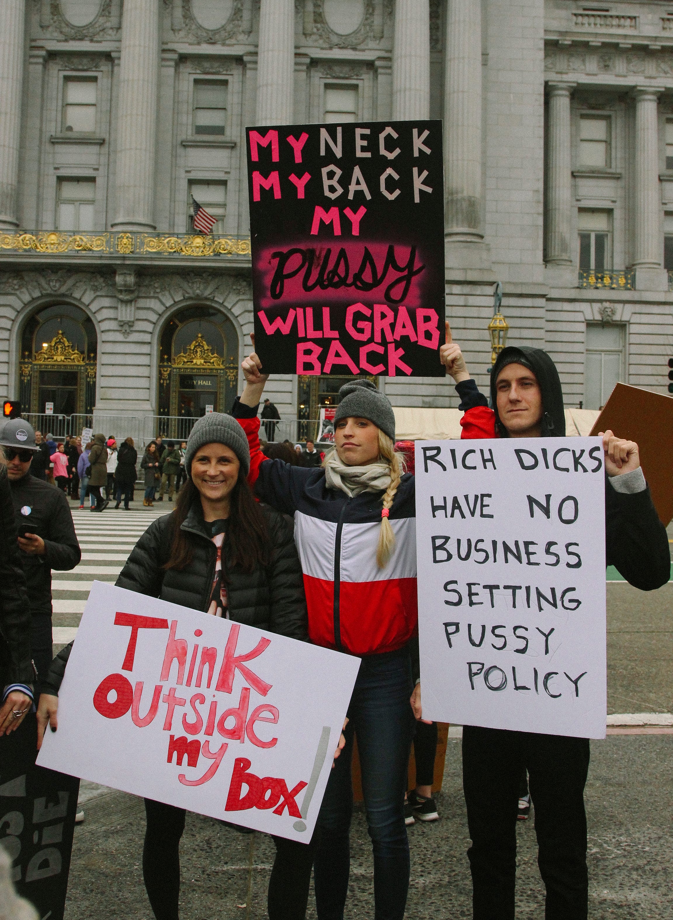 Protesters whose ages ranged from newborn to 99 streamed into Civic Center Plaza, carrying clever signs and sporting pink “pussy” hats. Despite the rain that began to fall heavily at the start of the march, tens of thousands marched from City Hall to the Embarcadero well into the evening, carried by their rallying cries and rain boots.