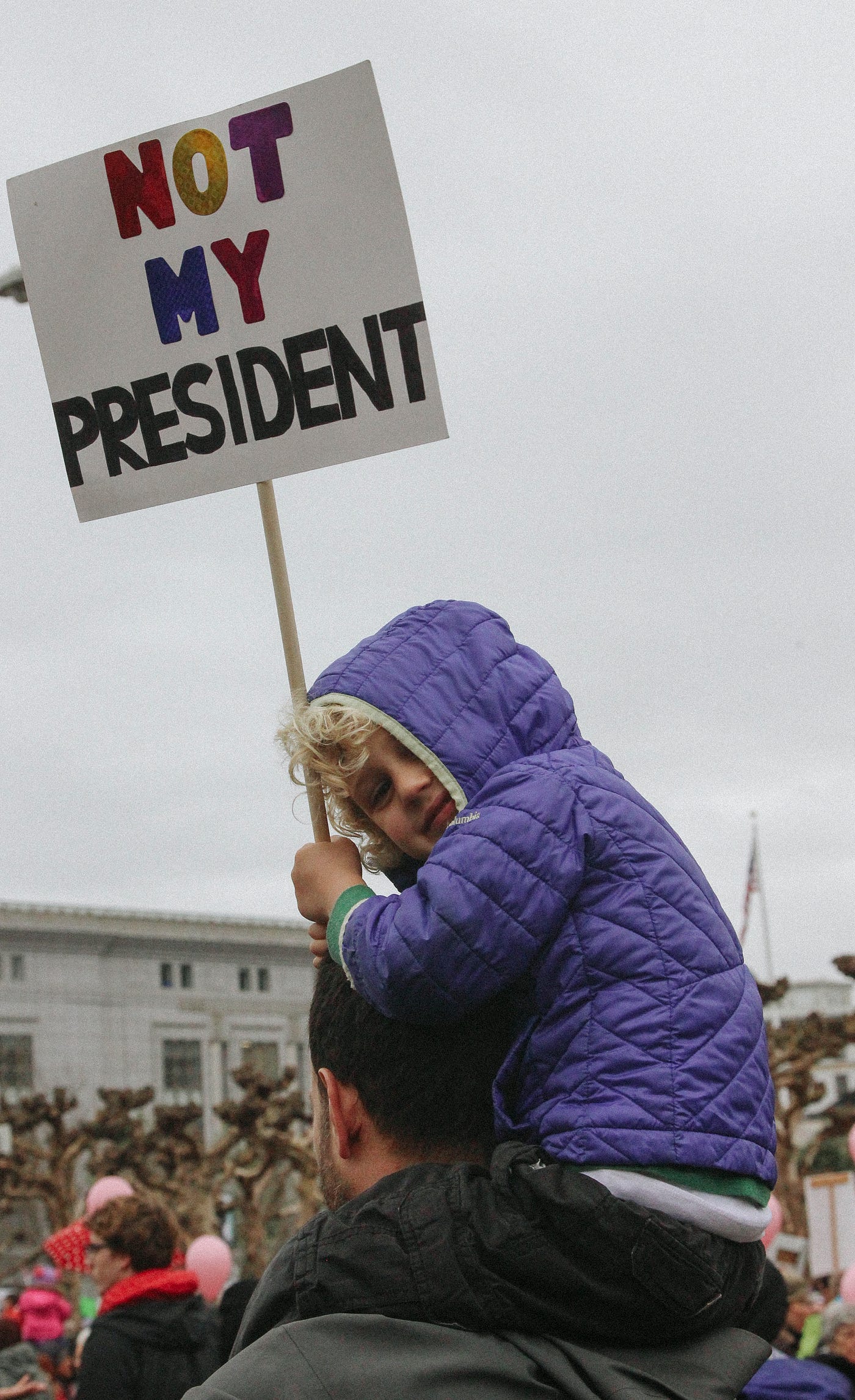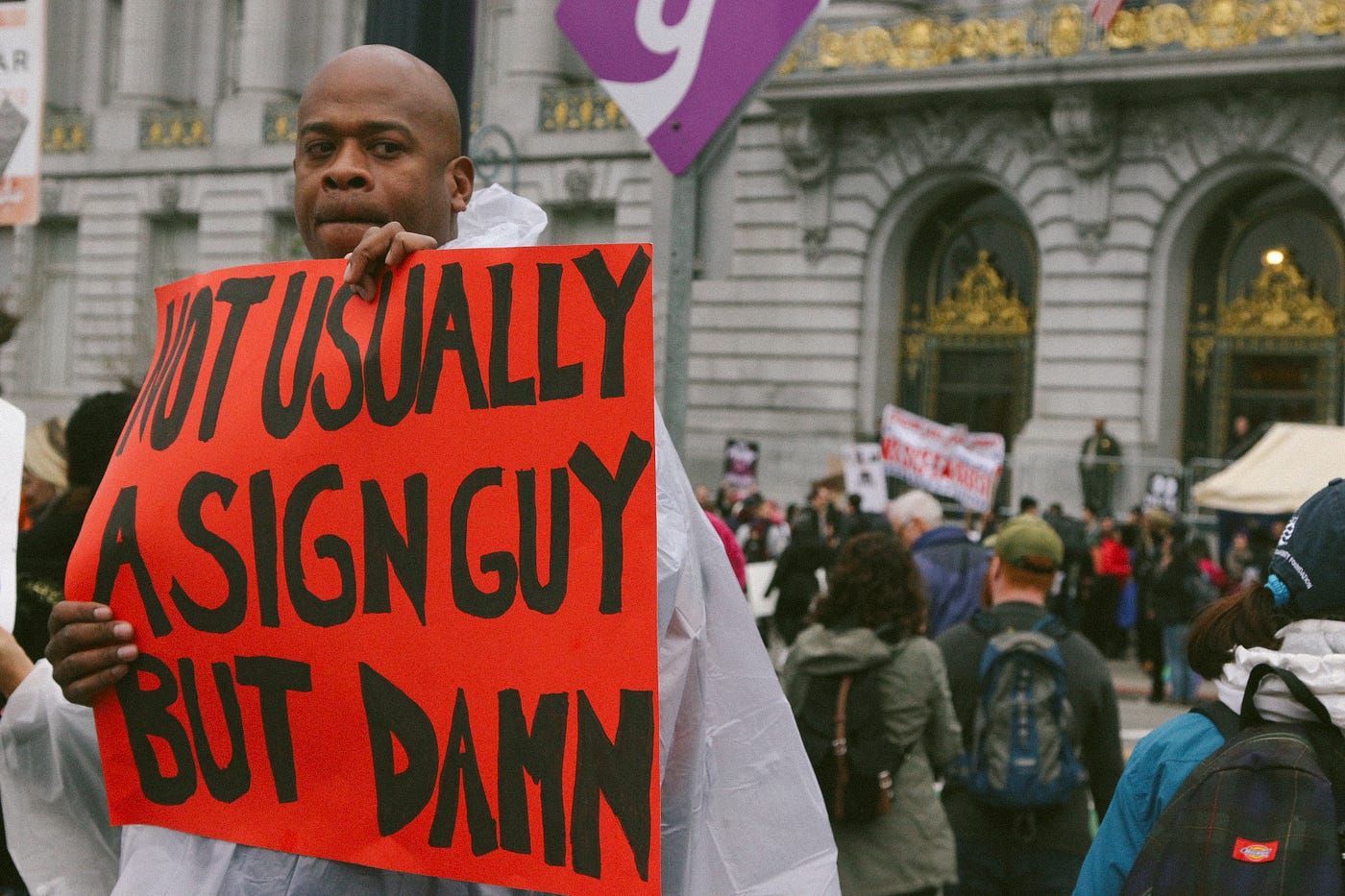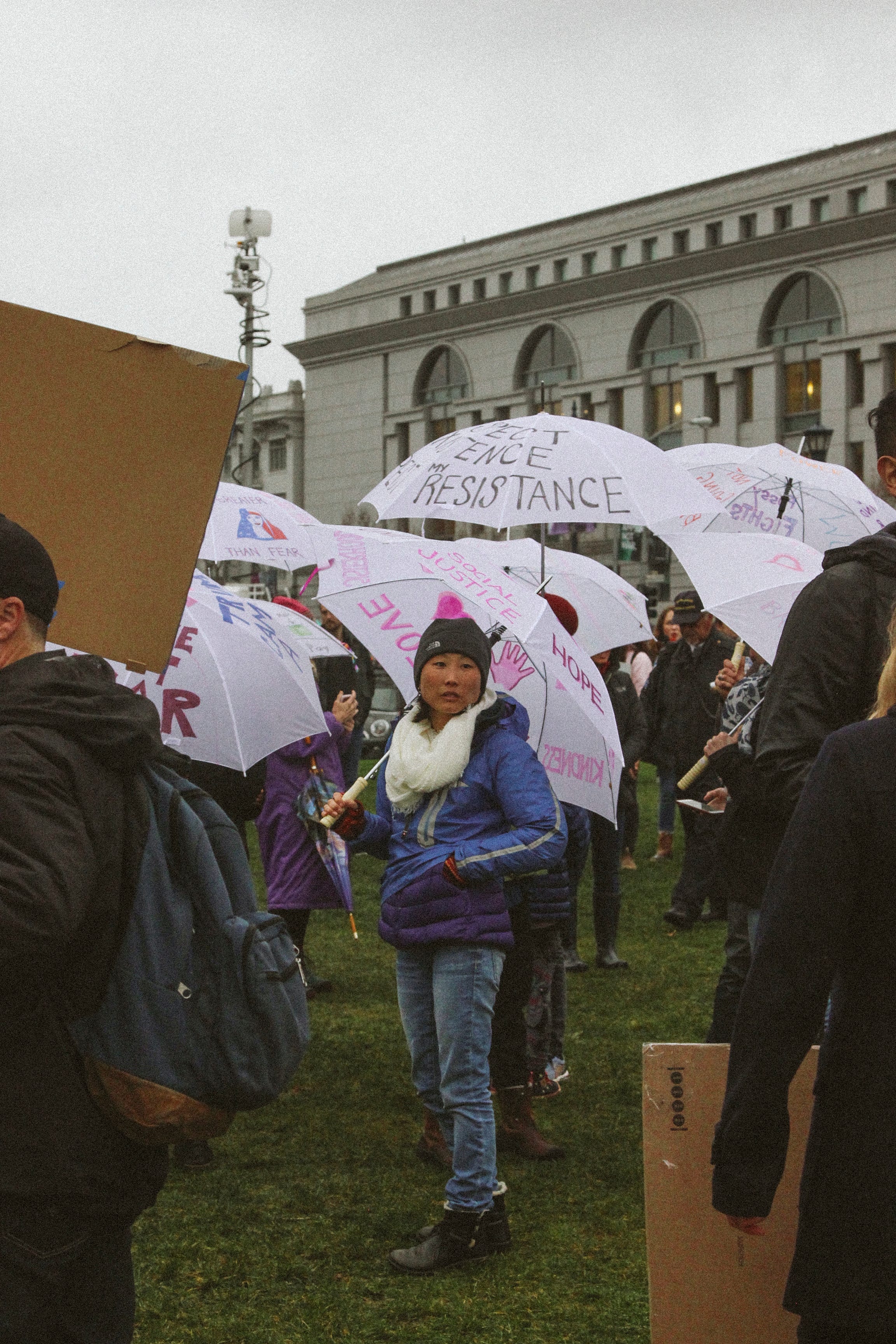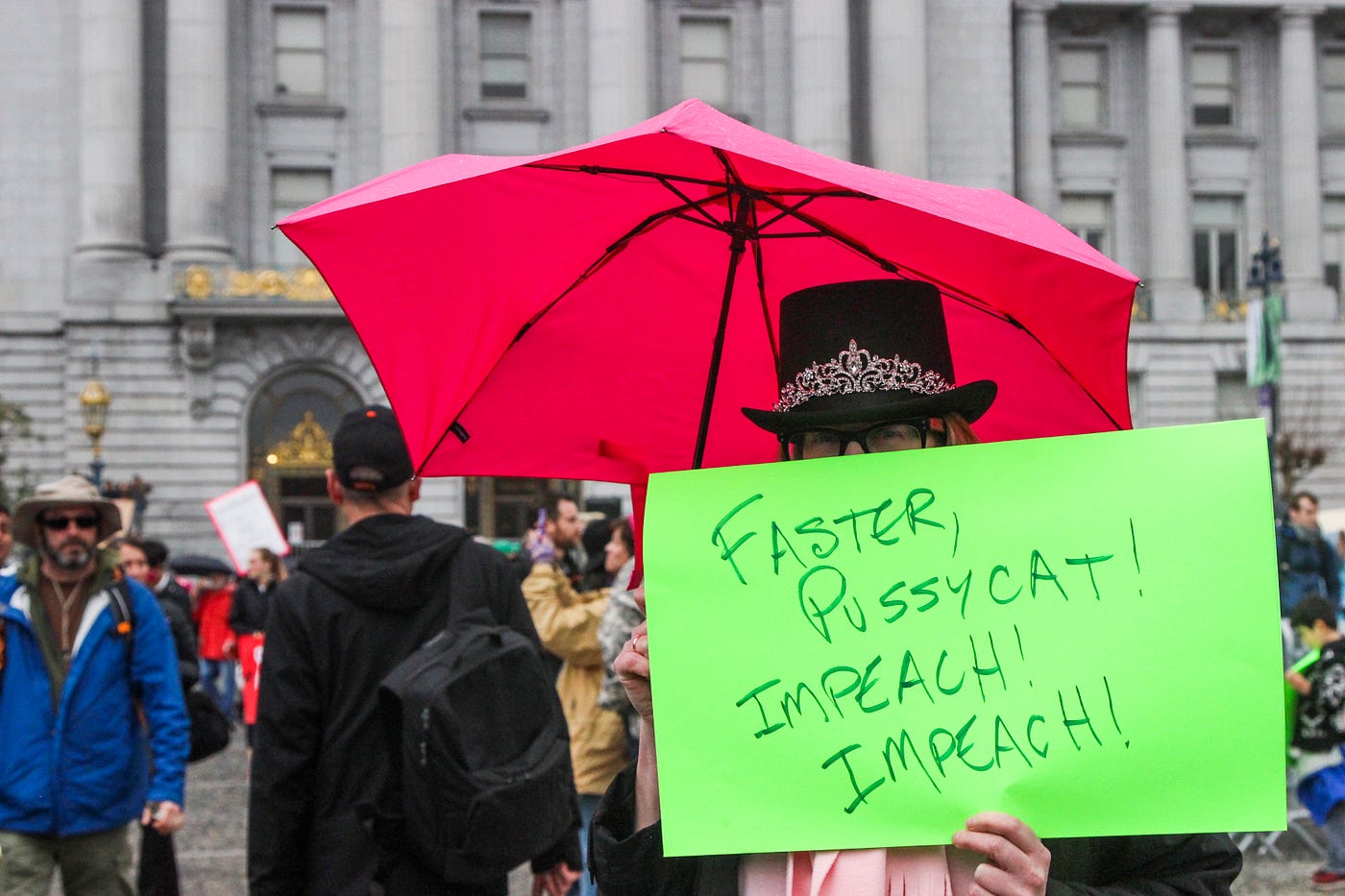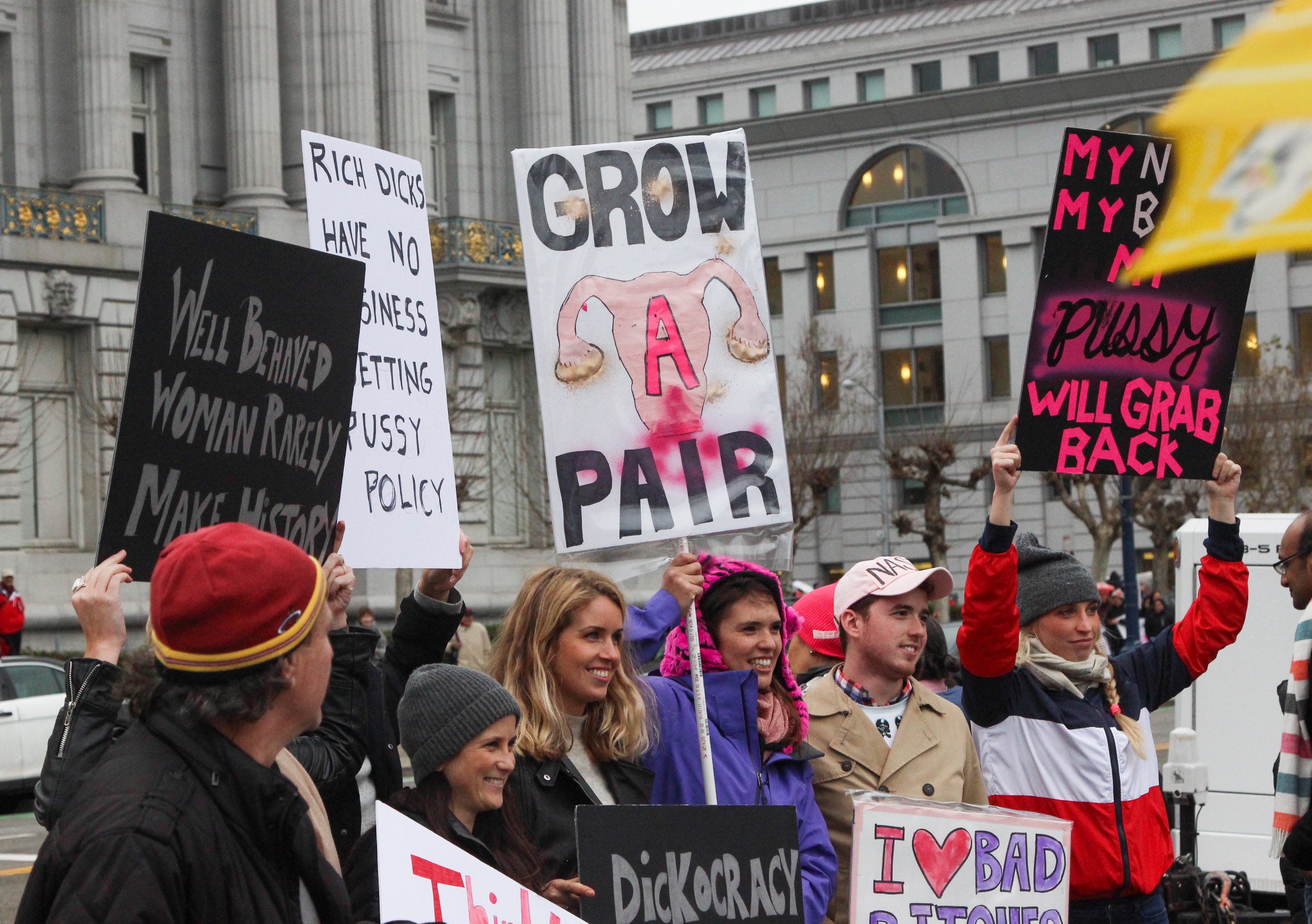 Protesters whose ages ranged from newborn to 99 streamed into Civic Center Plaza, carrying clever signs and sporting pink “pussy” hats. Despite the rain that began to fall heavily at the start of the march, tens of thousands marched from City Hall to the Embarcadero well into the evening, carried by their rallying cries and rain boots.