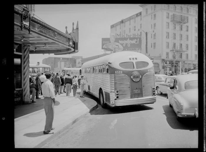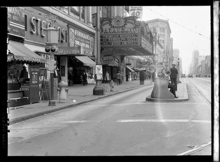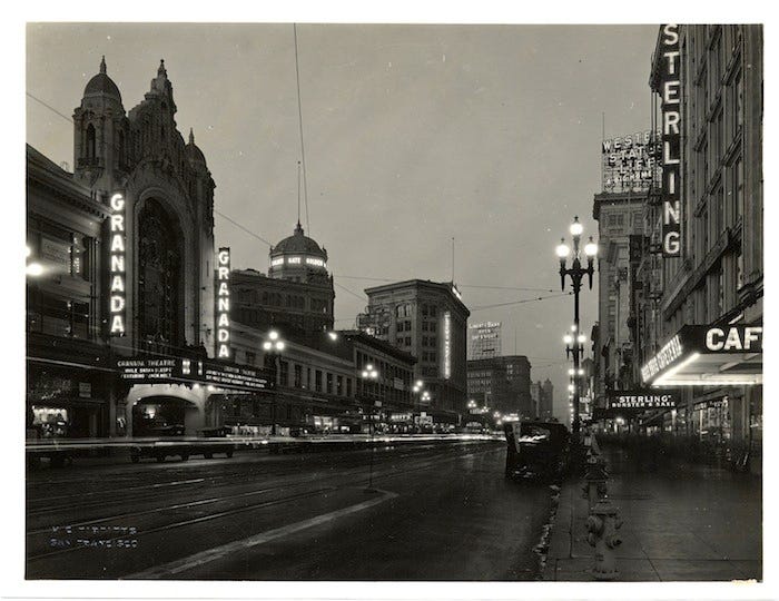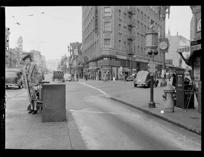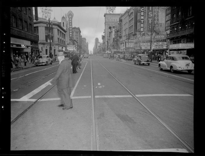 Market Street has one of the more rapidly changing skylines in San Francisco. Old buildings and their grungy neon signs are being torn down to make room for shiny new condos, restaurants, and office spaces. These changes are symbolic of the times, but they’re also true of any big city that invites the masses — no urban skyline remains the same over the ages. I love looking through old photos of busy San Francisco streets to see what the city used to look like before most of us were here, and the San Francisco History Center at the San Francisco Public Library offers an amazing portal into our past.
