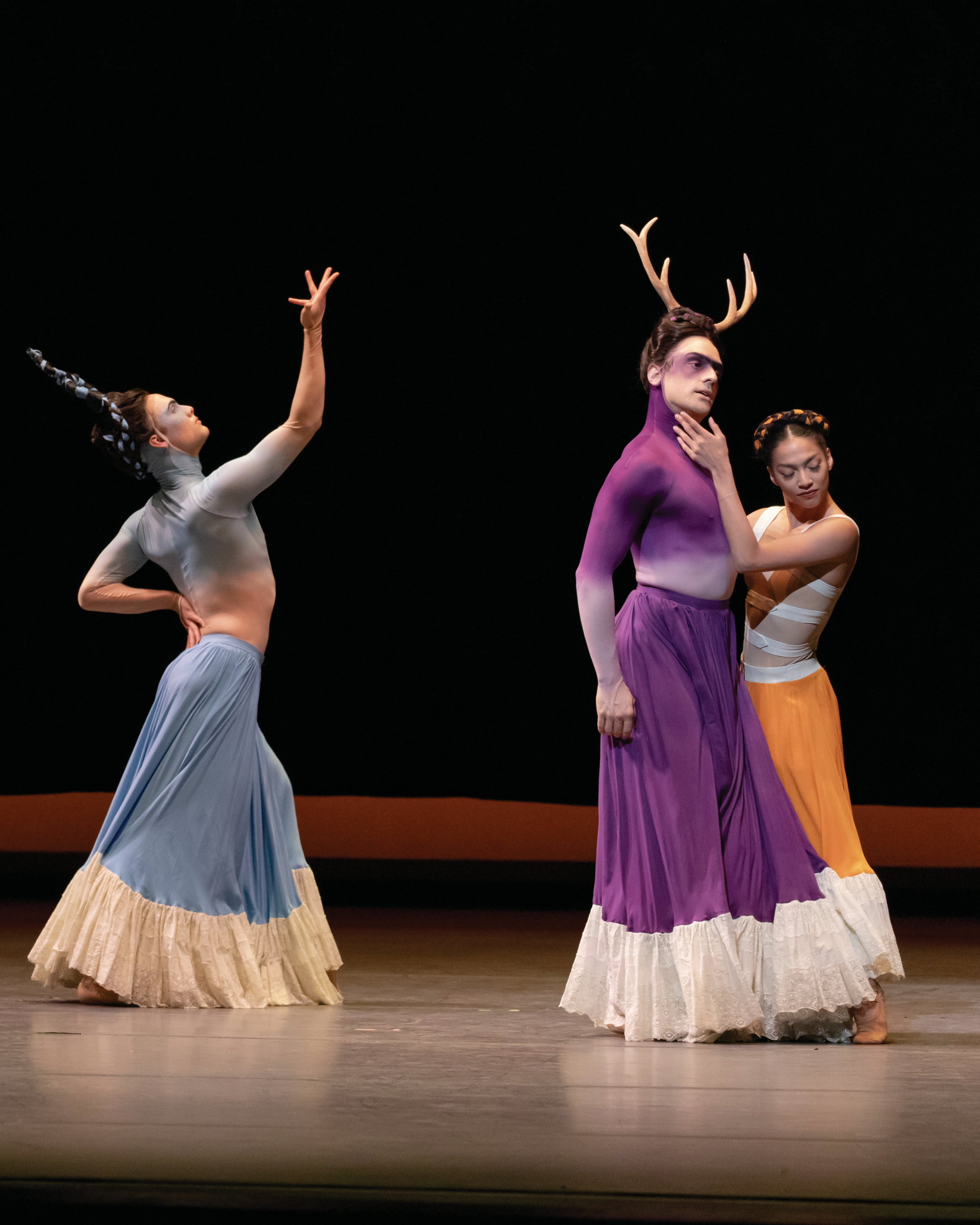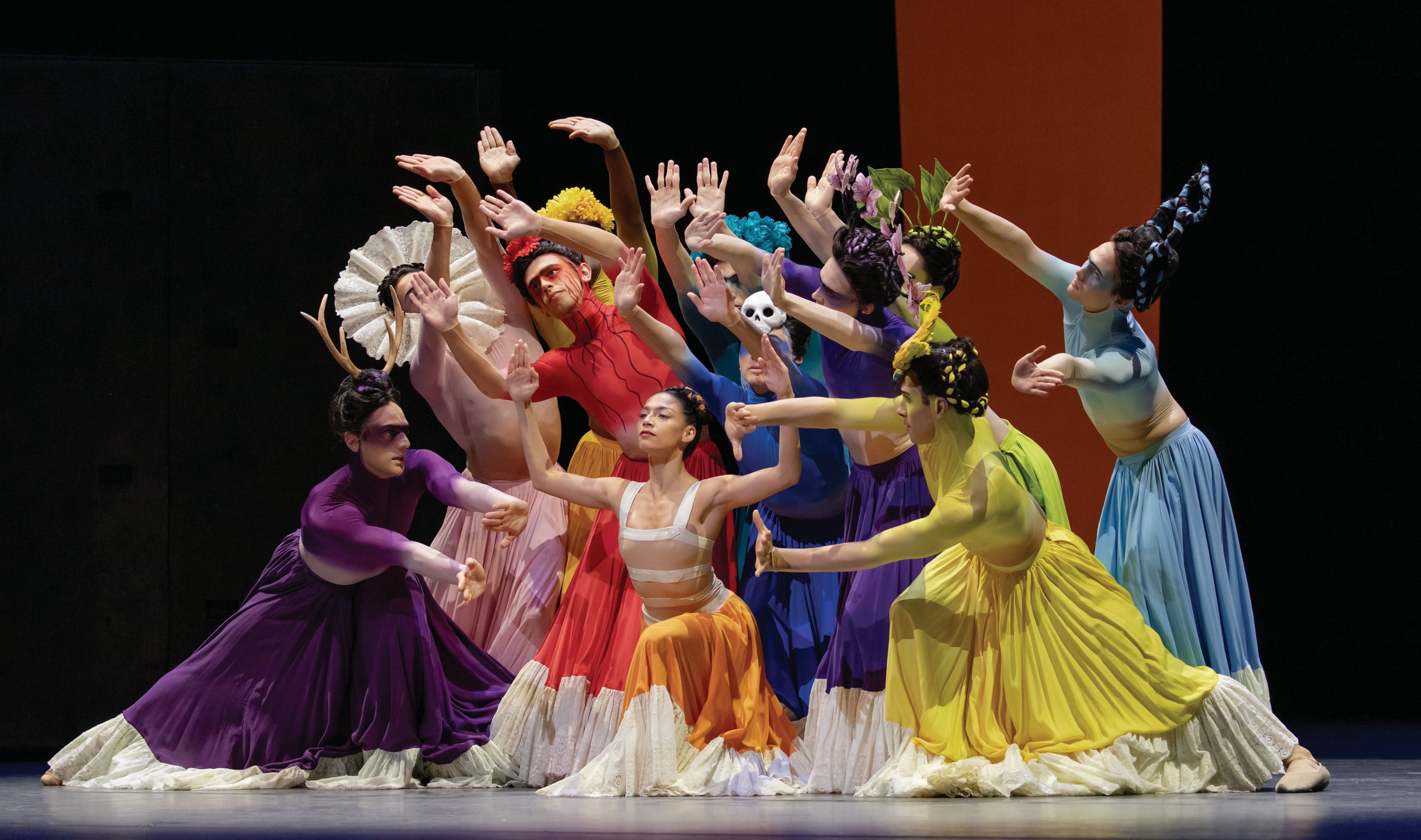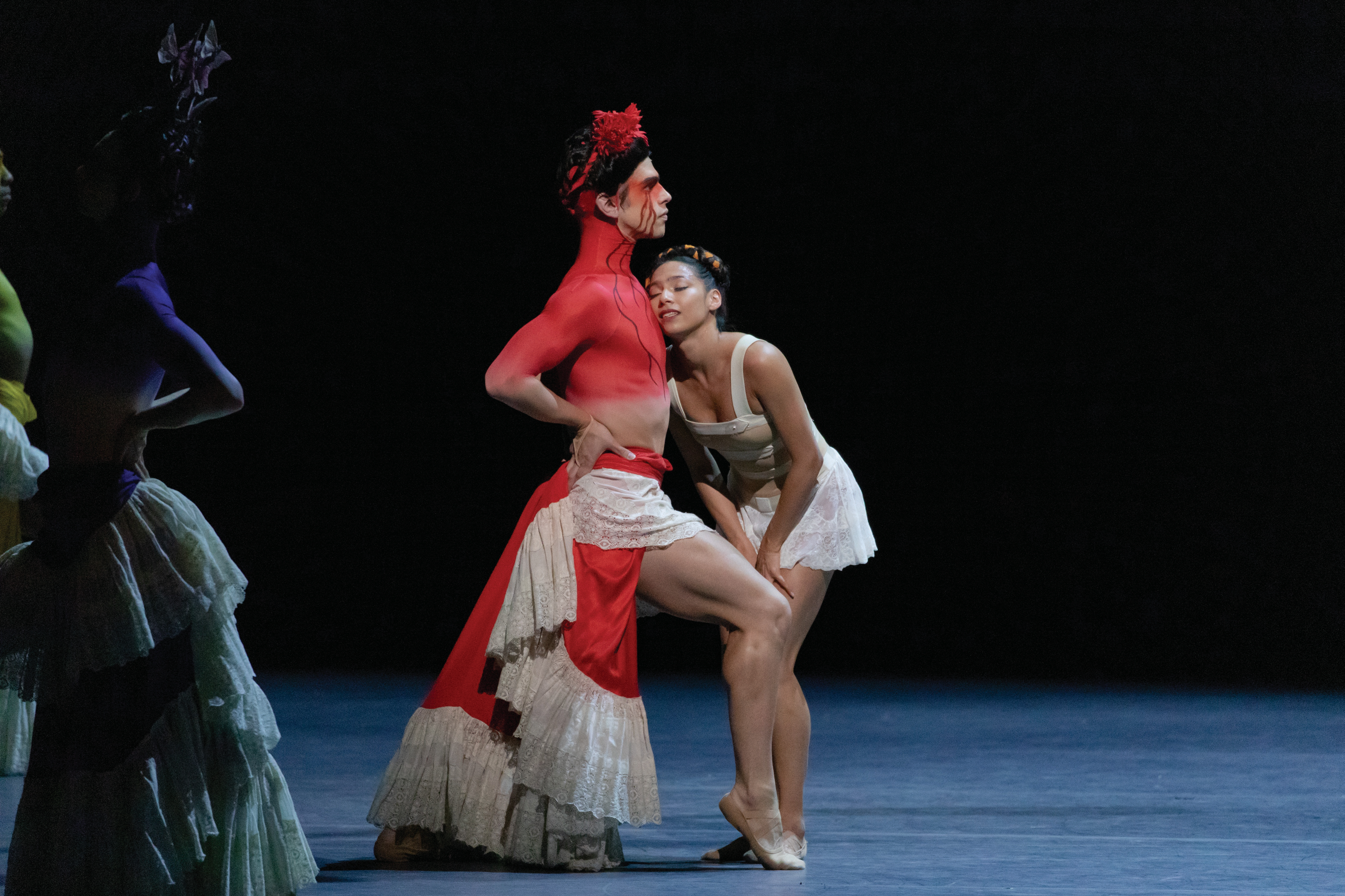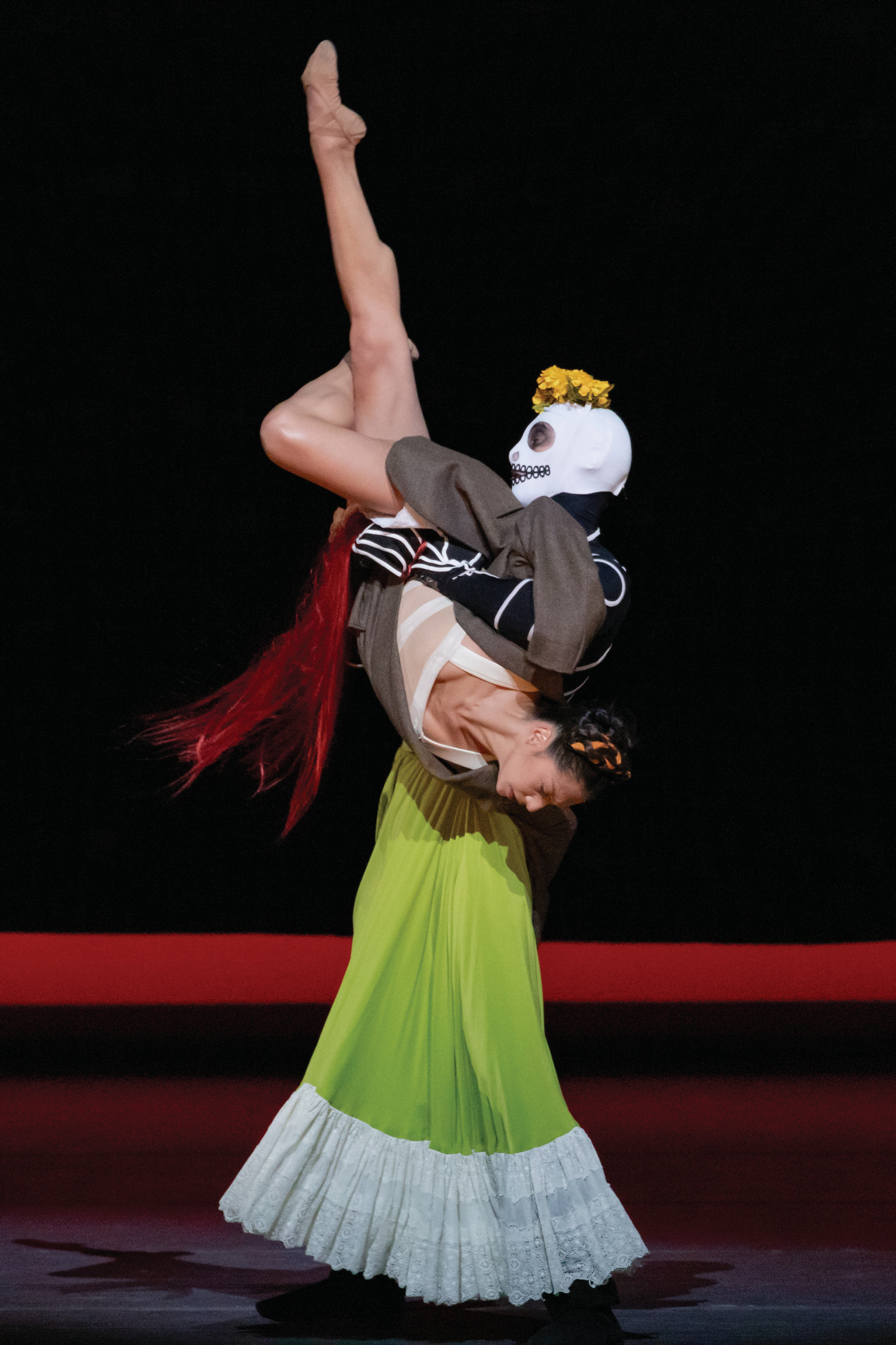 Soloist Isabella Devivo was superb as Kahlo, a sprightly yet strong counterpoint to John-Paul Simoens’s powerful Diego; Simeon is a guest artist visiting from Oregon Ballet Theatre. Kahlo is known for her introspection, and 55 of her 143 paintings were self-portraits. This inspired Lopez Ochoa to create many different Fridas — 10 in fact — all danced by skirted male corp members. The effect was vibrant and beautiful.