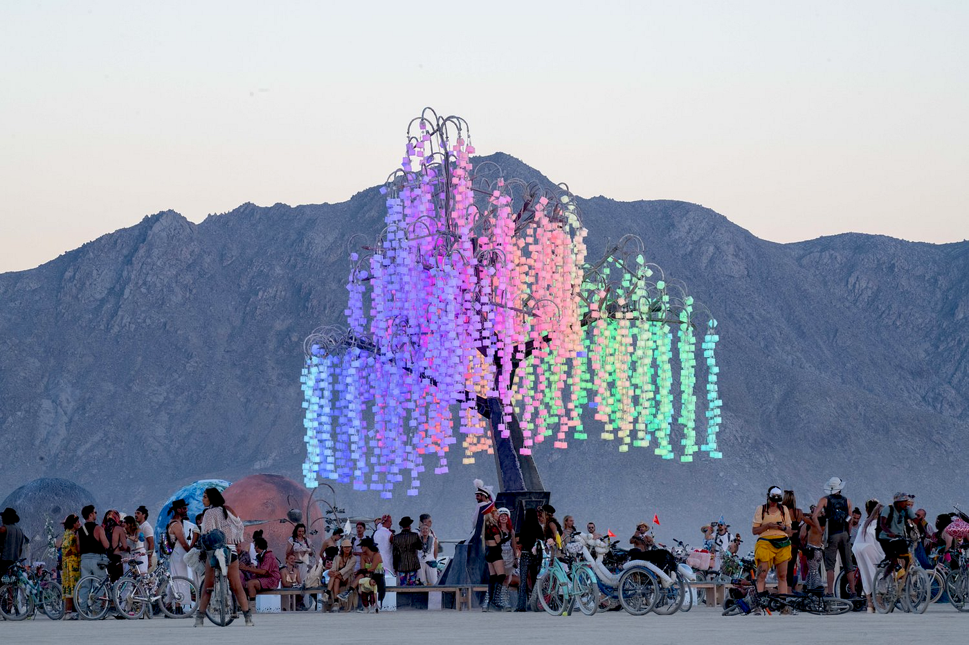 In fact, Entwined: Elder Mother is two art exhibits, grafted into one: Elder Mother, the tree which debuted at the rained-out 2023 Burning Man, and Entwined, the surrounding rod-and-cube shrubs and saplings which have appeared annually alongside other trees in Peacock Meadow since 2020.