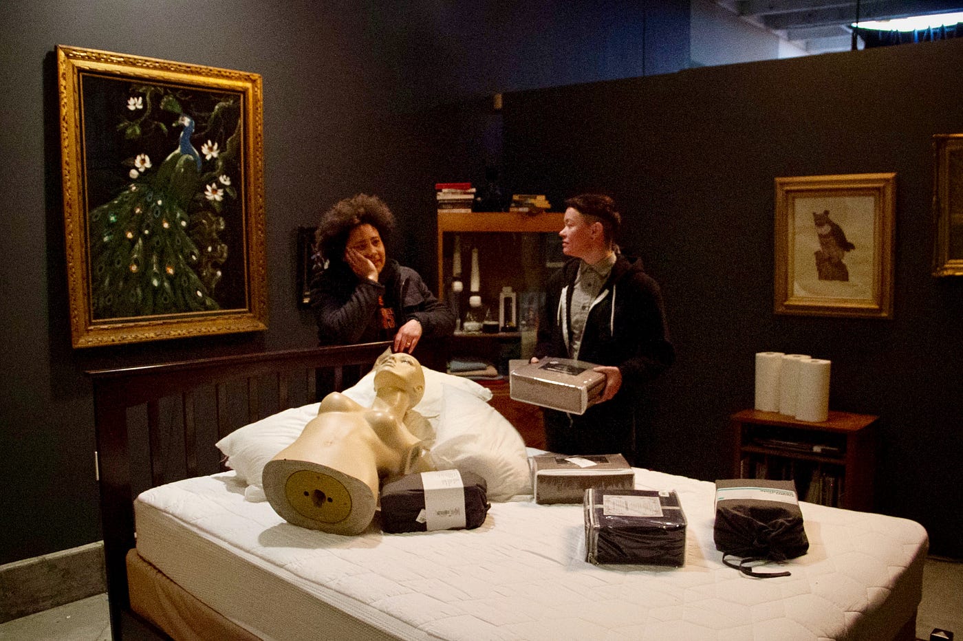 The space is small, maybe 15 by 20 feet, but it feels much larger owing to the placement of the bed and to the walls, which do not quite reach all the way to the ceiling. The room is tastefully decorated with paintings of birds, stacks of books and a cabinet of artfully arranged dildos. On the bed a fresh set of sheets lies still cubed in store-bought plastic, and just above, propped against the pillows, a lighting dummy sits—supine, feminine and glossy.