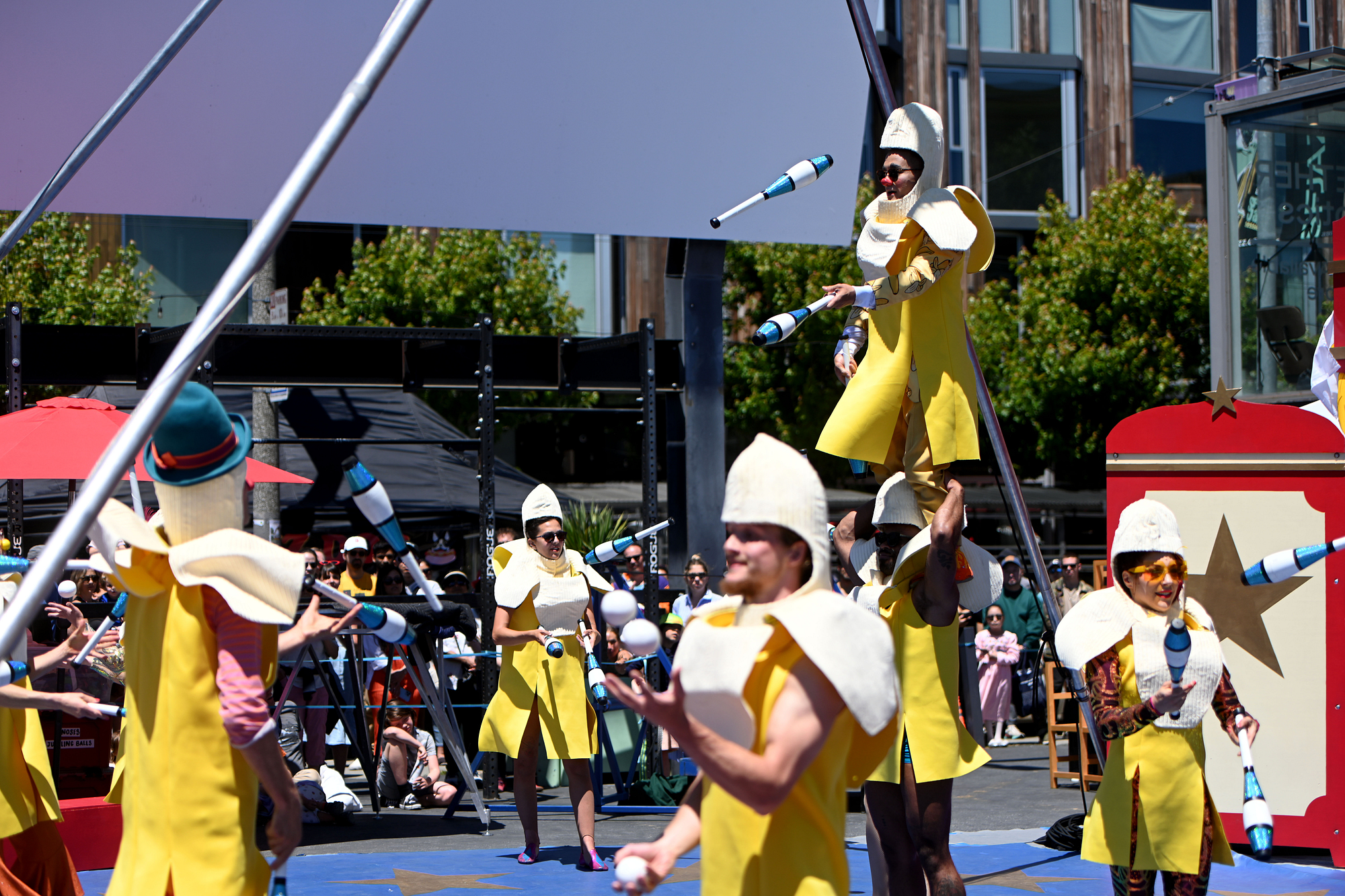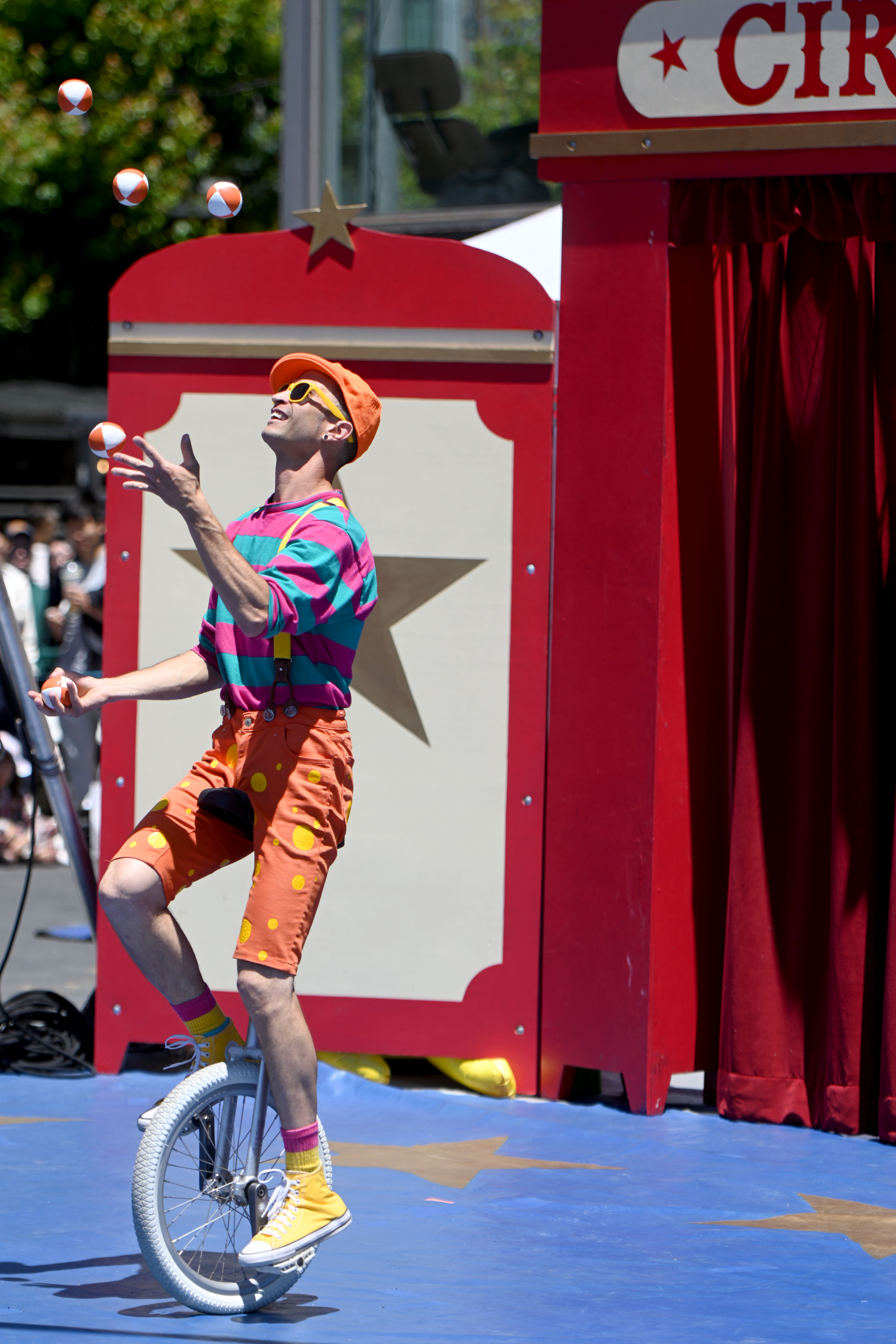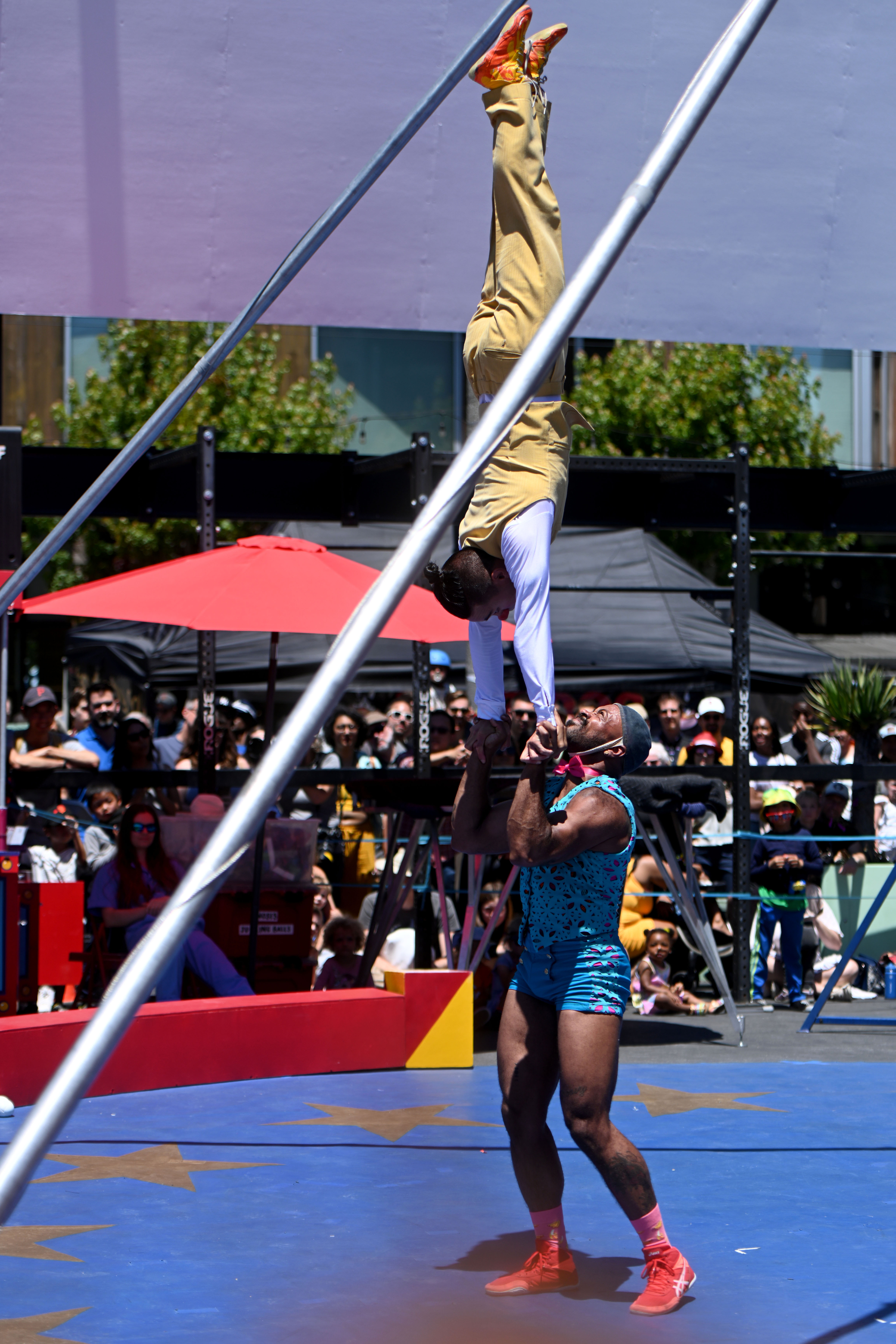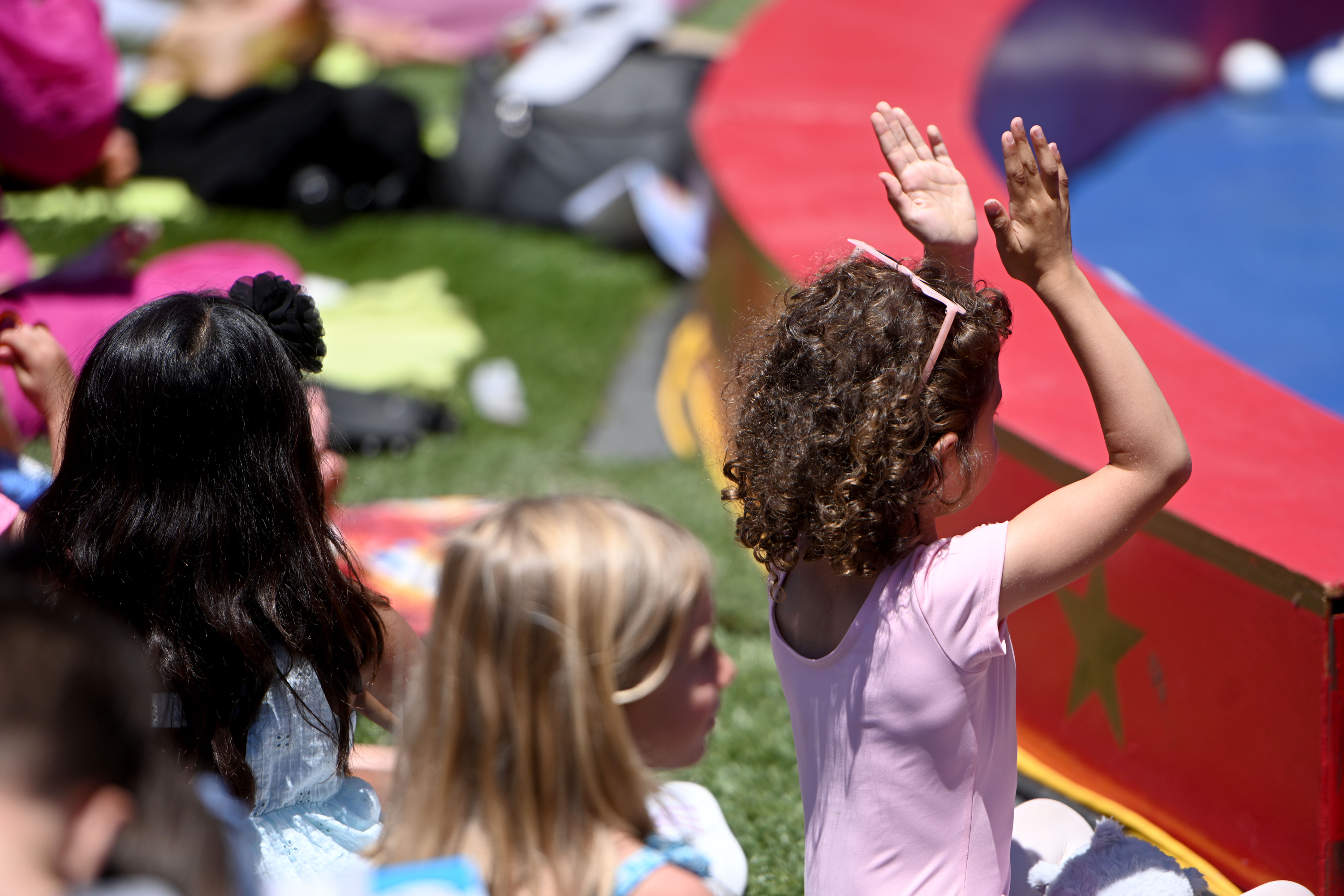 Families sat on benches and crowded artificial turf next to a stage. Circus Bella took their positions and performed everything from acrobatics to clowning.