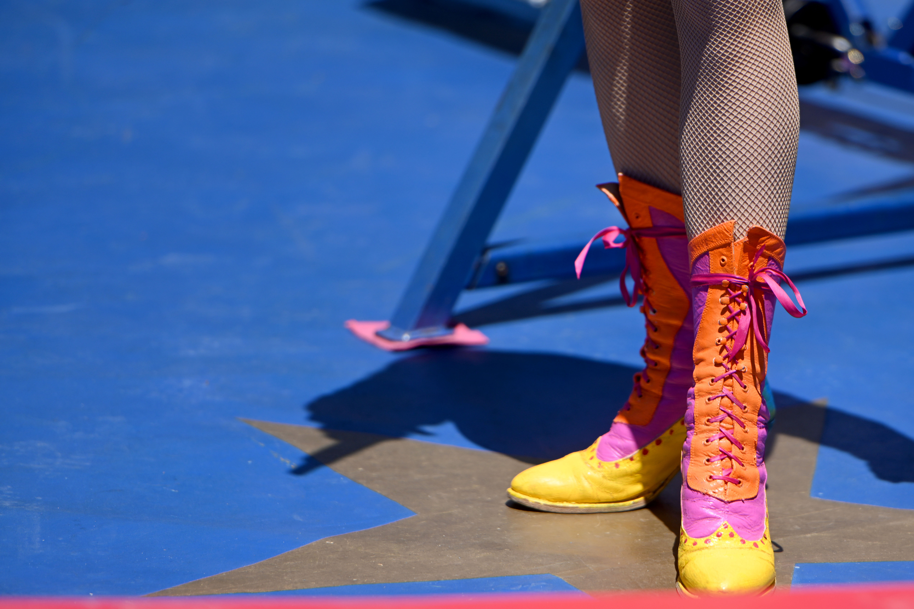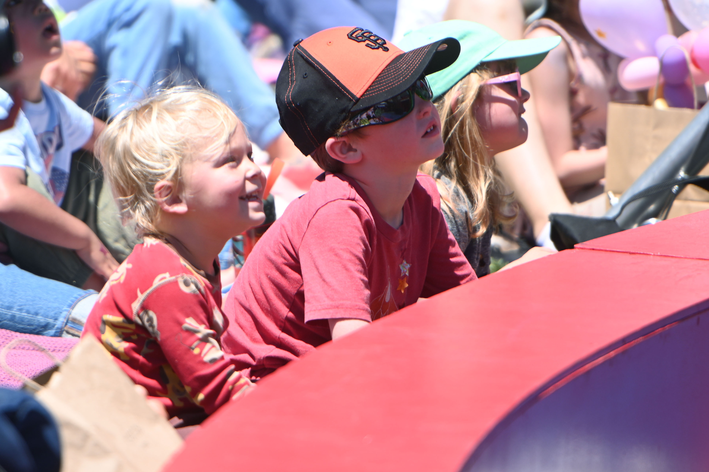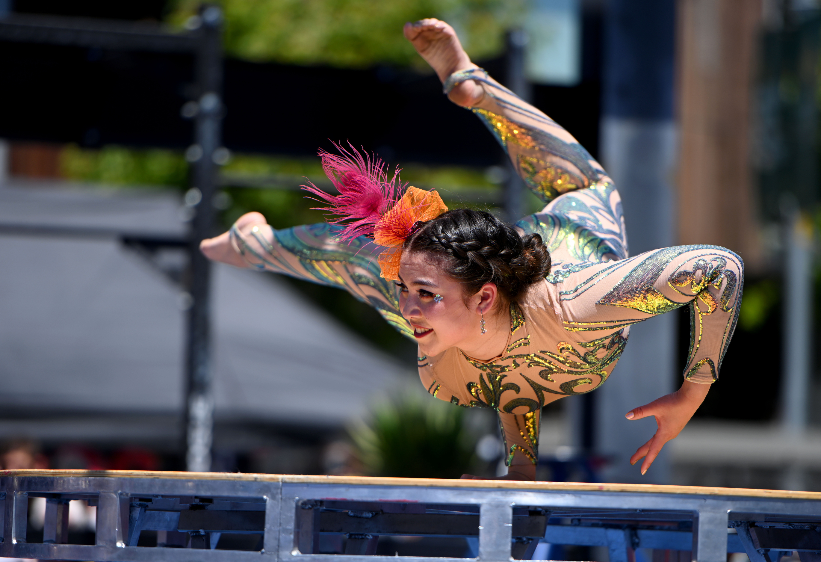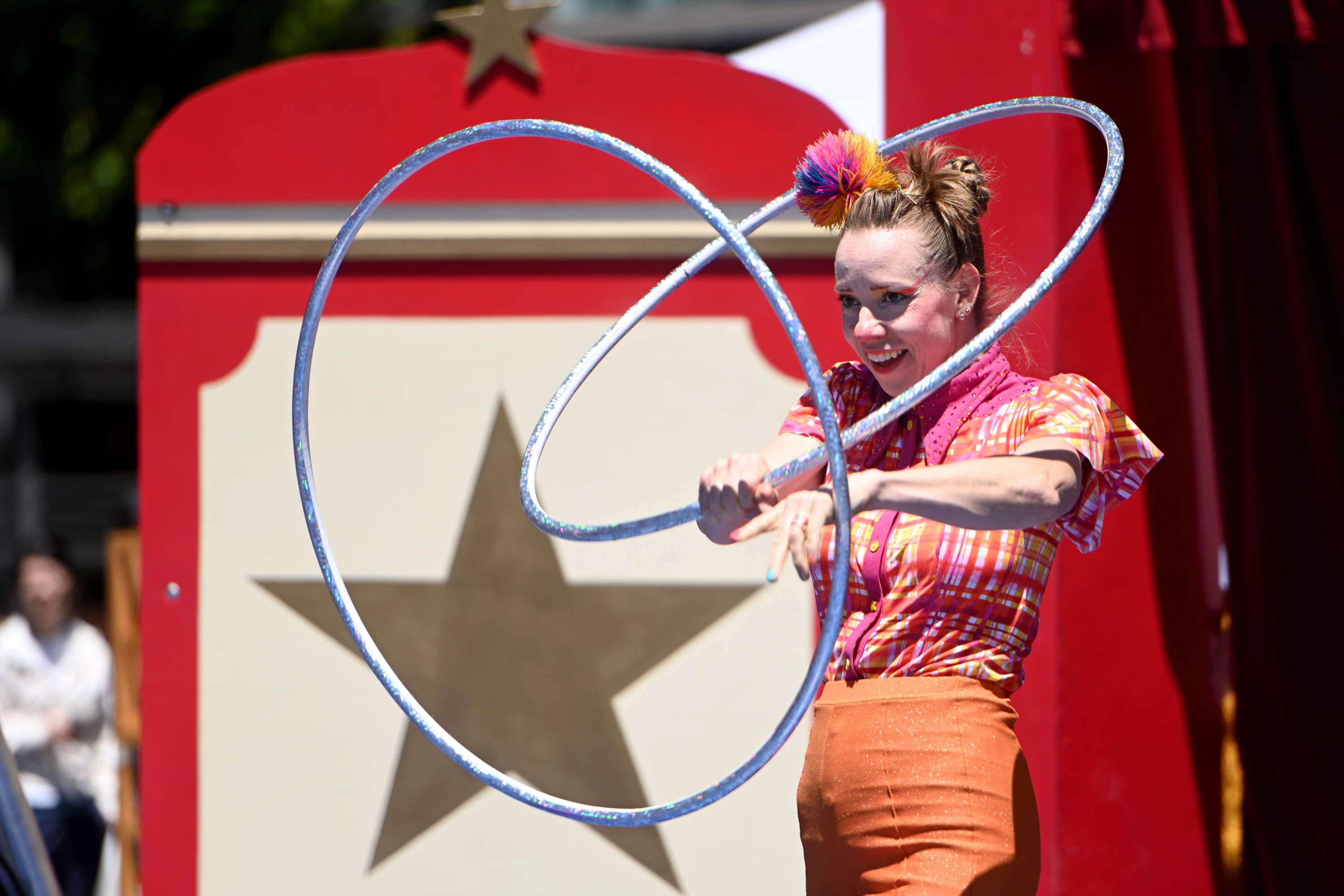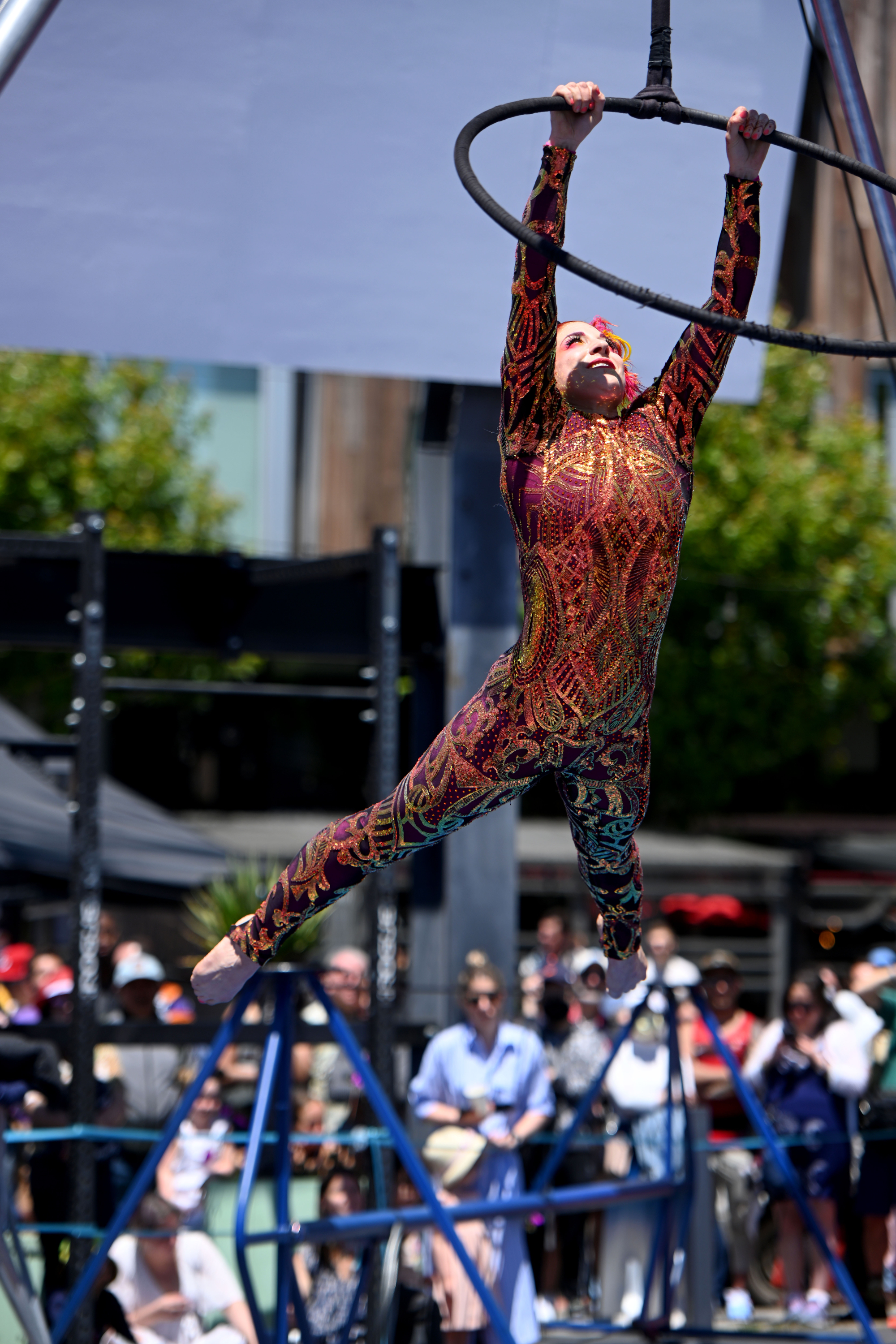 Families sat on benches and crowded artificial turf next to a stage. Circus Bella took their positions and performed everything from acrobatics to clowning.