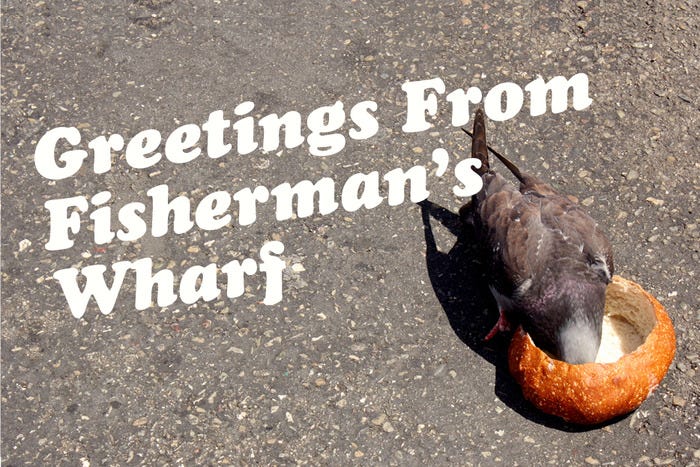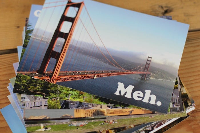 I’m a huge fan of cheesy, tourist-style postcards; they are truly the exclamation points of mail. Seeing one underneath my mail slot, nestled in a soft bed of six Capital One credit card offers — it’s just this glossy, day-brightening piece of FUN! (Unless it’s addressed to one of my roommates, in which case my day becomes suddenly soaked in dark, nauseous mail-jealousy.) Sending them is a wonderful feeling too, but a quick stroll through a downtown Walgreens or the shops in Fisherman’s Wharf and you’ll find the postcard selection sufficiently lacking in the sarcasm and cold-hard-truth departments. To fill that void, Luke Foss and I created the best postcard set ever, ever known to man. Ever.