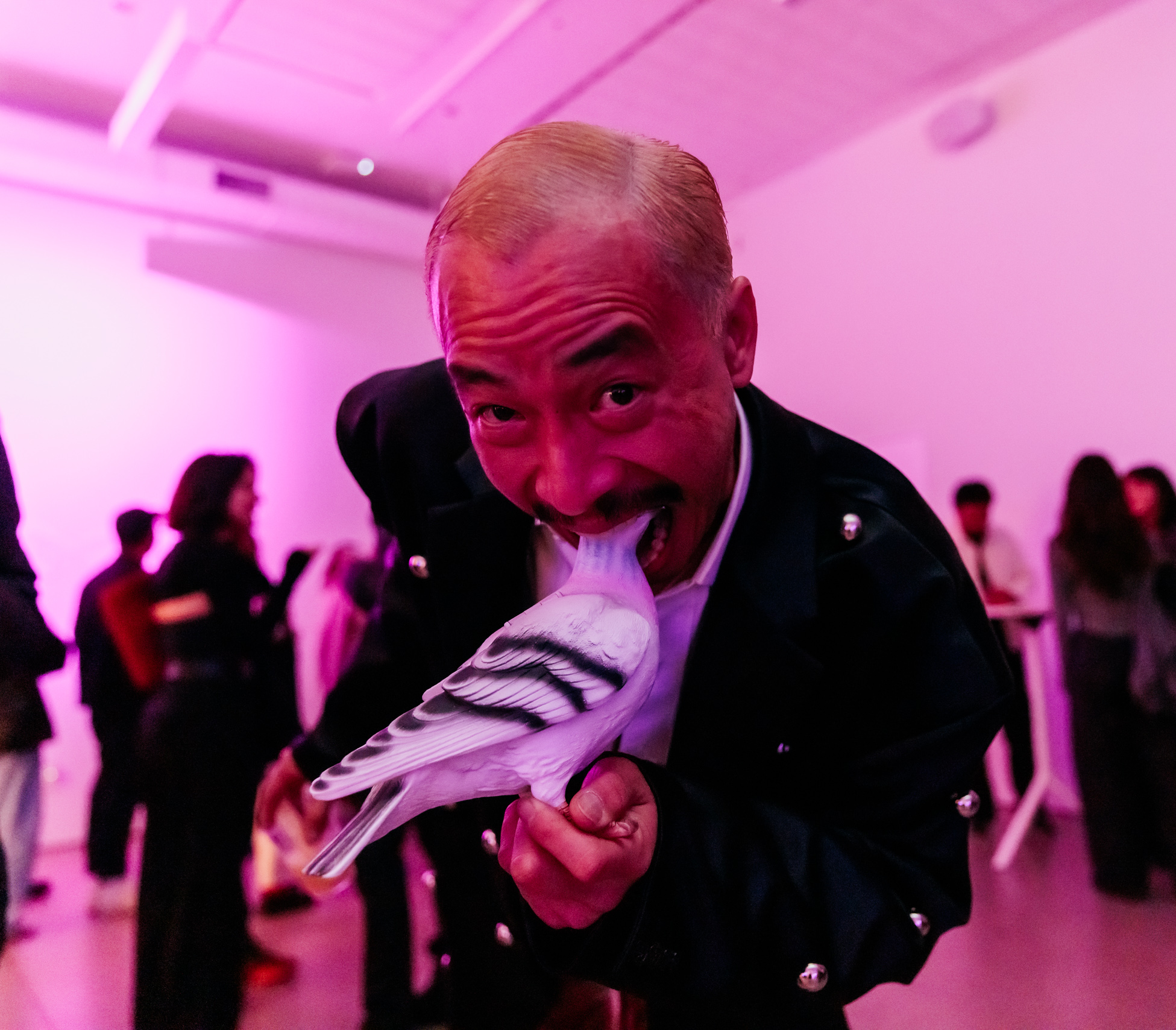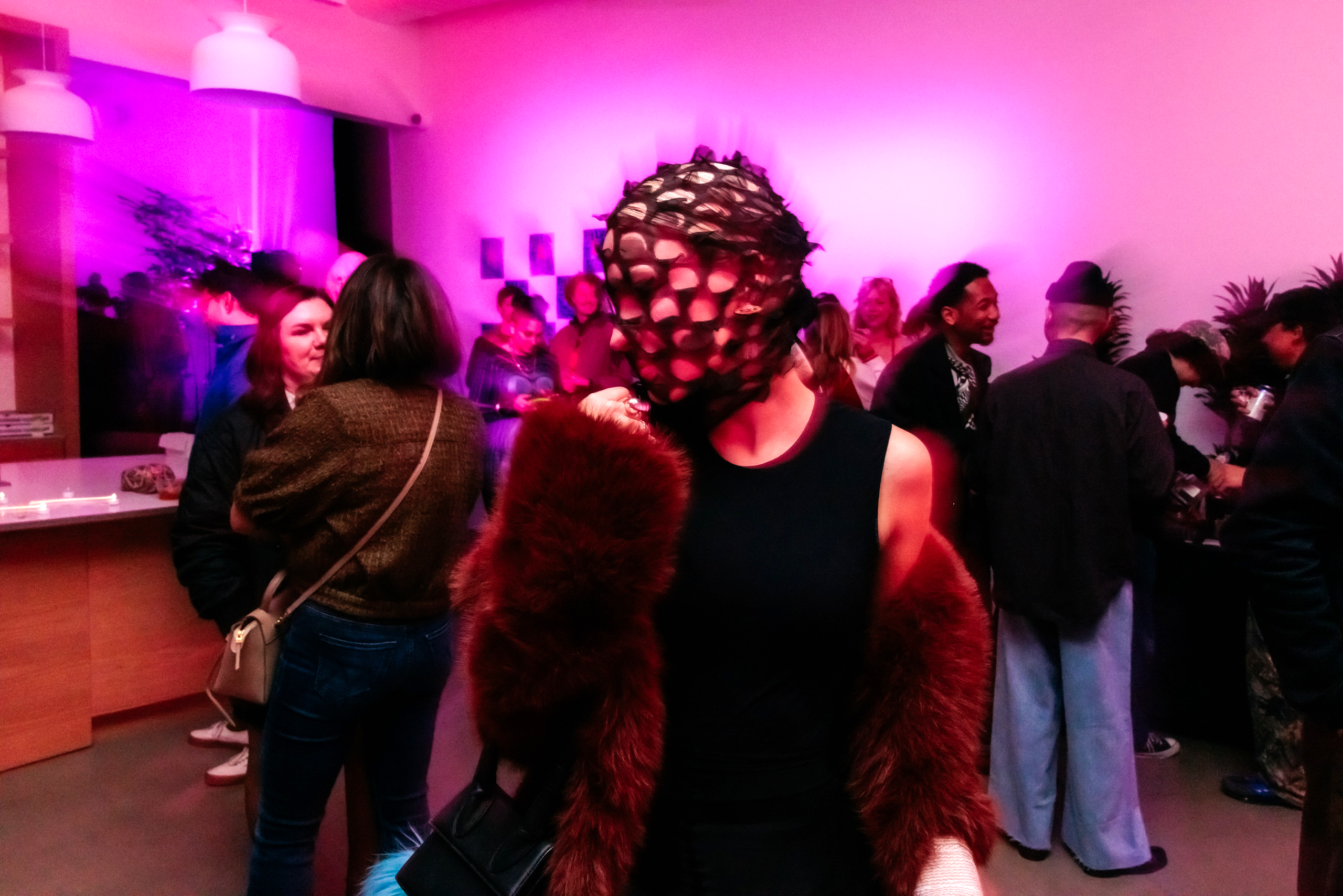 The shenanigans continued at “FOGLift: The Unofficial Unofficial Afterhours” party put on by Sonya Yu, who founded a creative studio space in SoMA. The party was a fun vibe with entertaining juxtapositions: High-end fashion alongside paper plates. I enjoyed bold choices like this headpiece and fake pigeon.