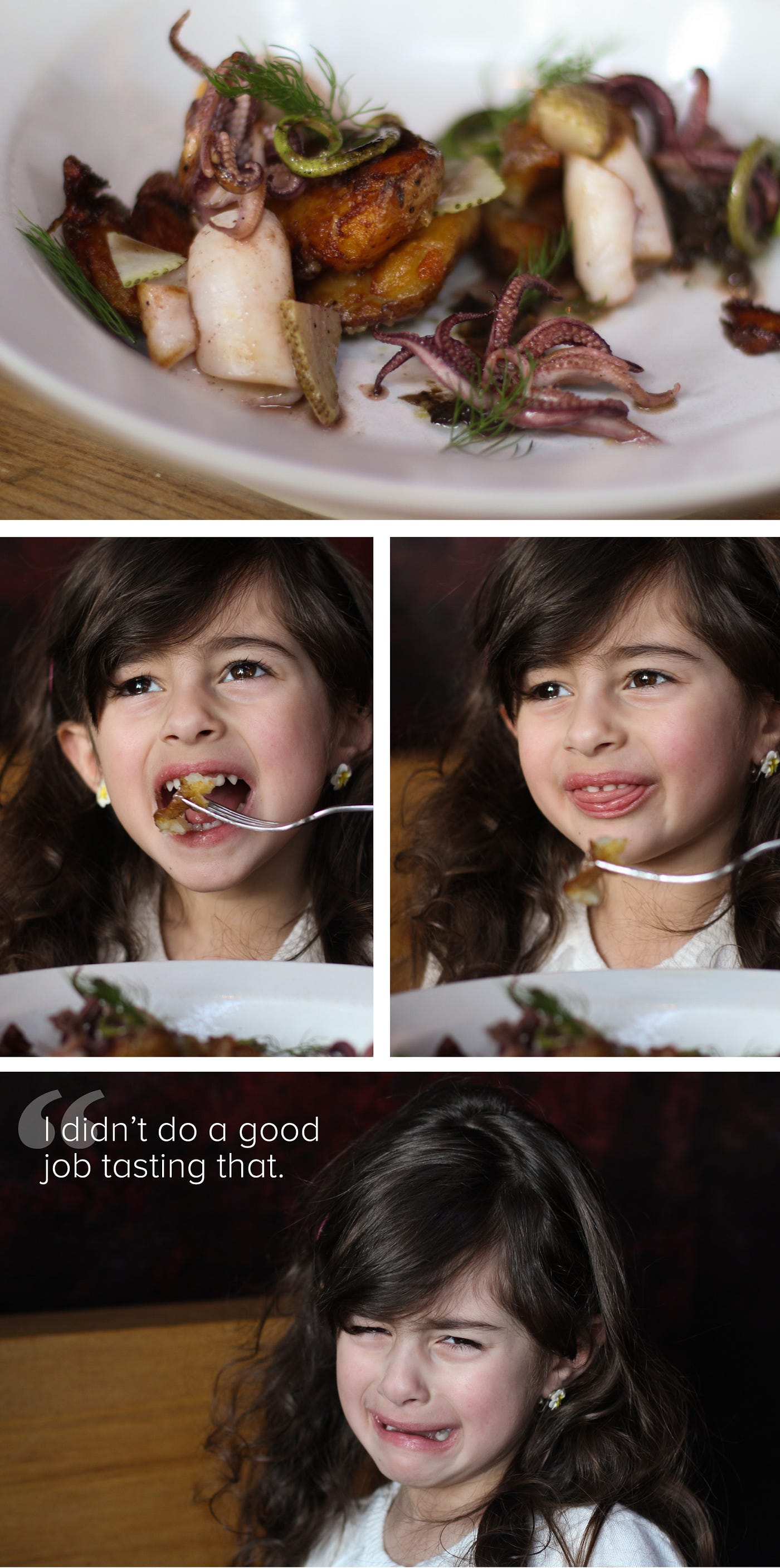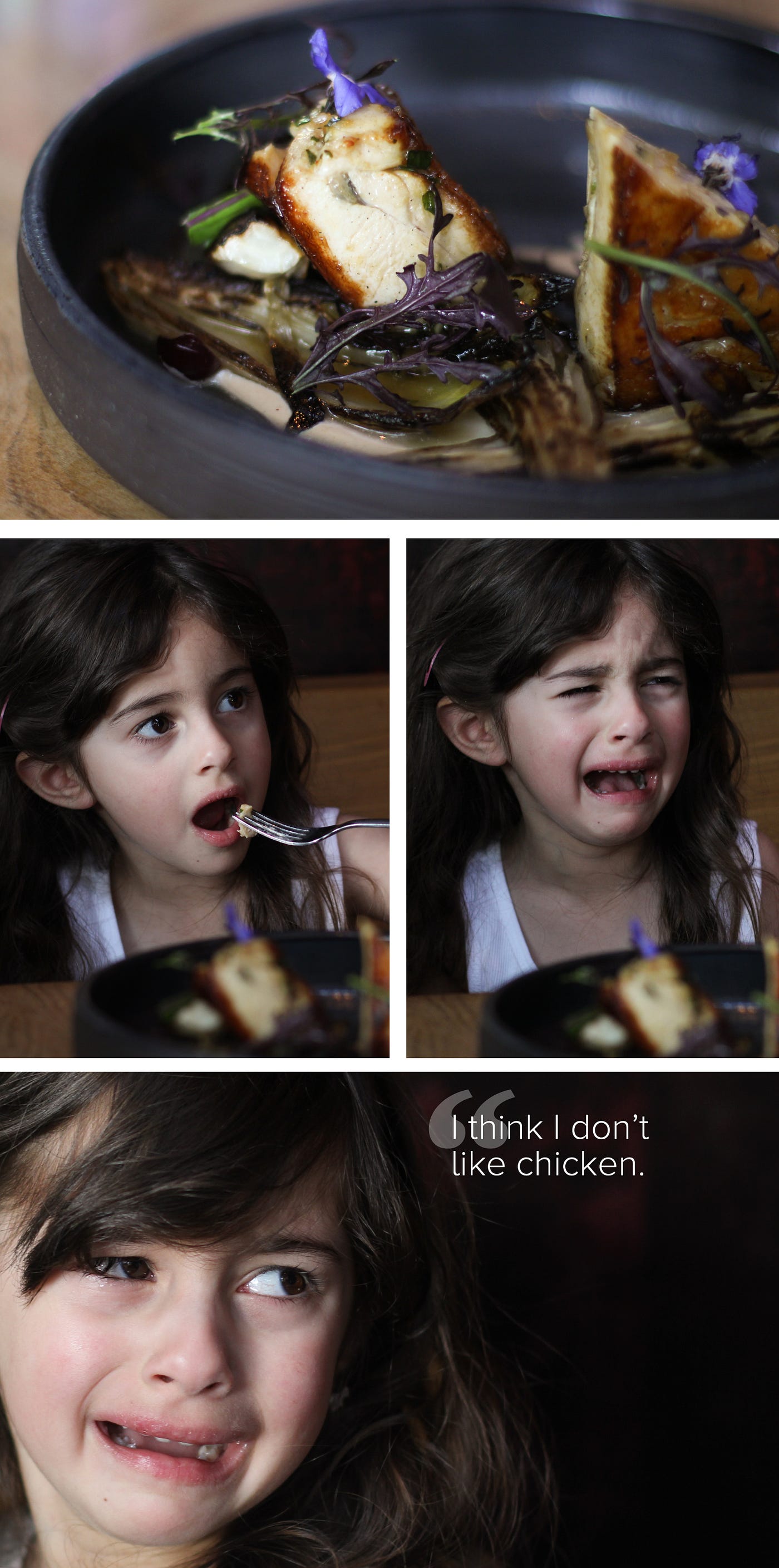 At this point the photographer had taken about 40 photos of this adorable little girl sobbing, and we were starting to feel like monsters. So having this crazy-delicious layered chicken come out (topped with flowers!) was a bit of a relief. But I think we pretty solidly severed Elai’s trust back at the squid dish (and the “paint” didn’t help), and so from this dish on she would just start crying any time a dish came to the table. But hey, being a professional food critic is emotional work!