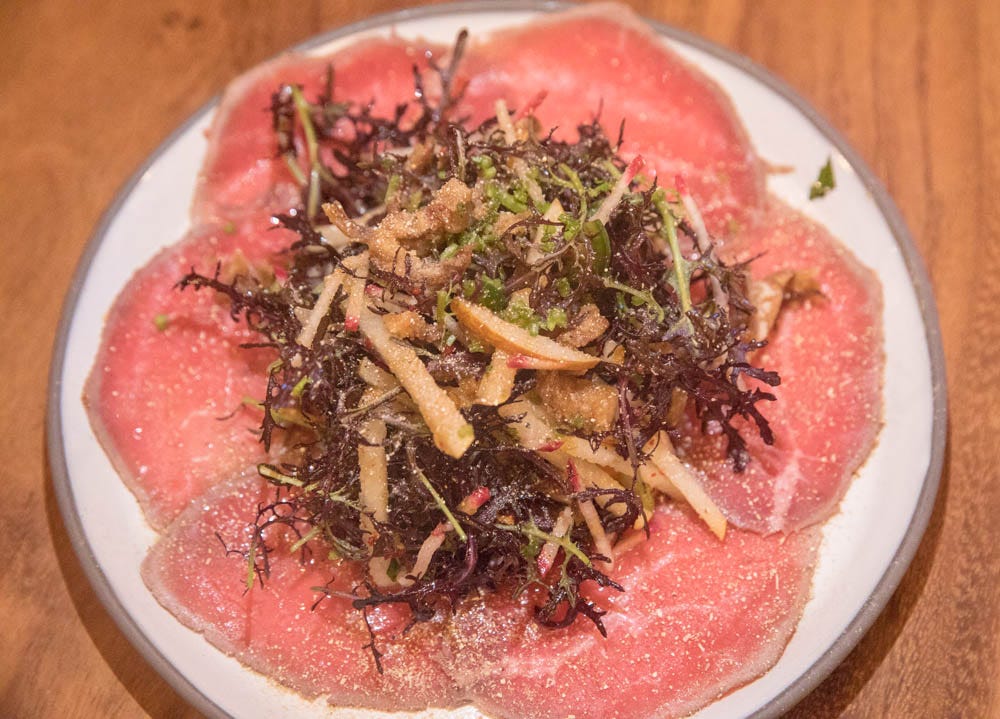 Ubiquitous brussels sprouts when shaved make an ideal salad, while Monterey squid is among the best in the world, fresh for us lucky neighbors of Monterey. Together, it’s one exciting salad dotted with pomello and fried bits of tripe (if you fear tripe, you won’t even know what hit you as you down that crispy goodness) in hot mustard dressing. Paper-thin beef carpaccio lays under a bed of frilly red mustard leaves, strips of shinko pear in housemade mae ploy chili sauce with crispy pig ears adding crunch. All three are vivid, surprising, each an explosion of flavor and opposites. They’re blessedly light yet not lacking in punch. Signature Kapur.