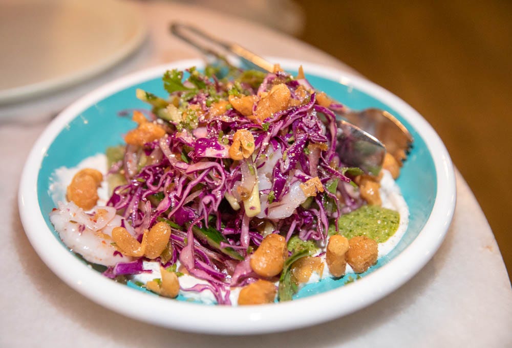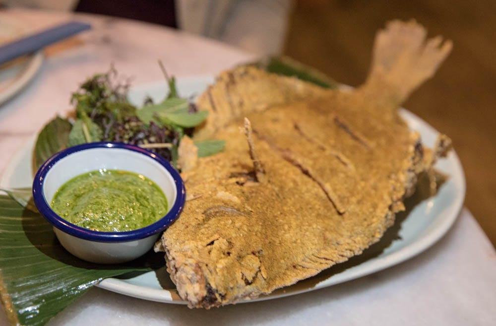 A whole fried petrale sole brined in turmeric coconut milk — accompanied by a palapa herb salad — was irresistibly crunchy yet moist and flaky inside, transporting me back to my month in Vietnam just over 20 years ago where I frequently ate fried whole fish with herbs making an elevating partner.