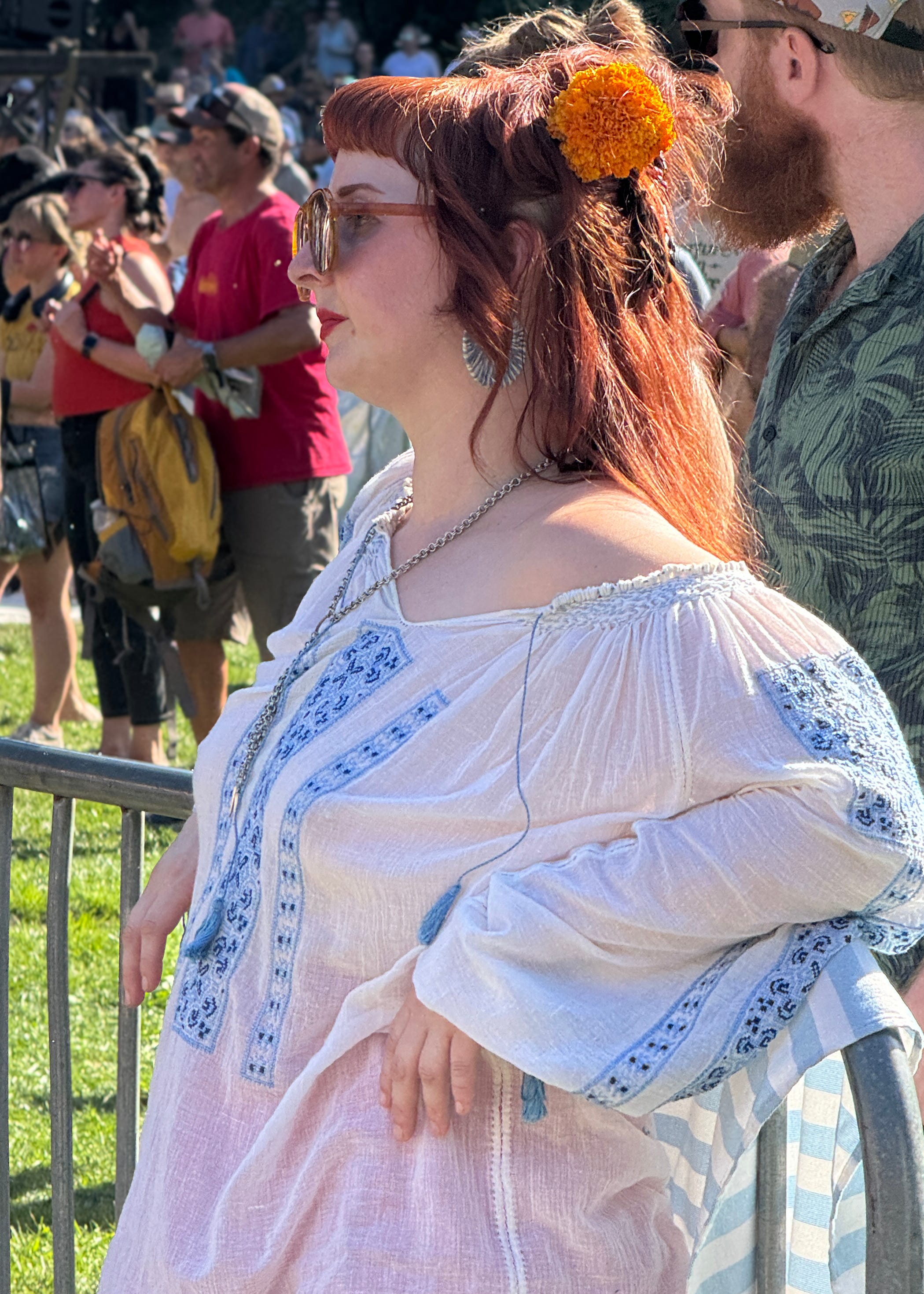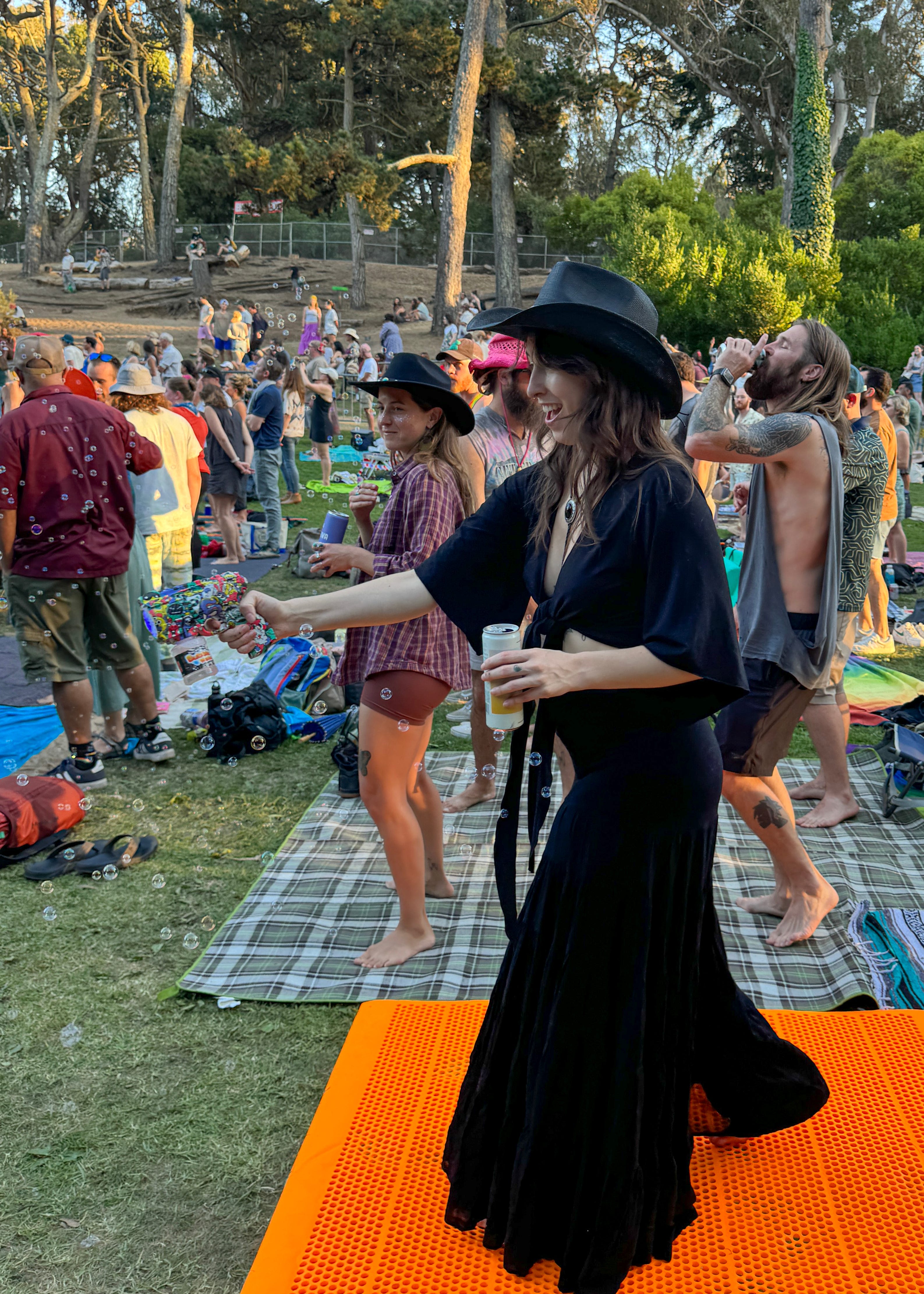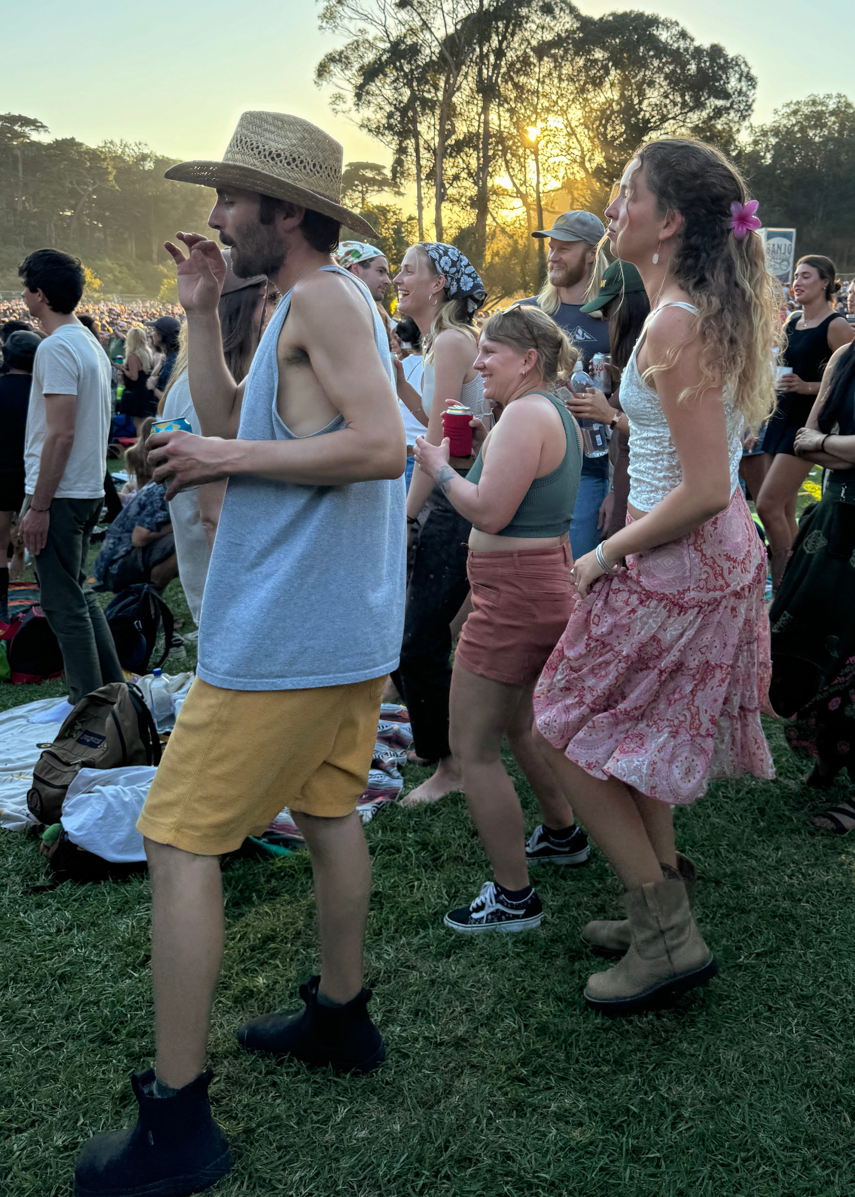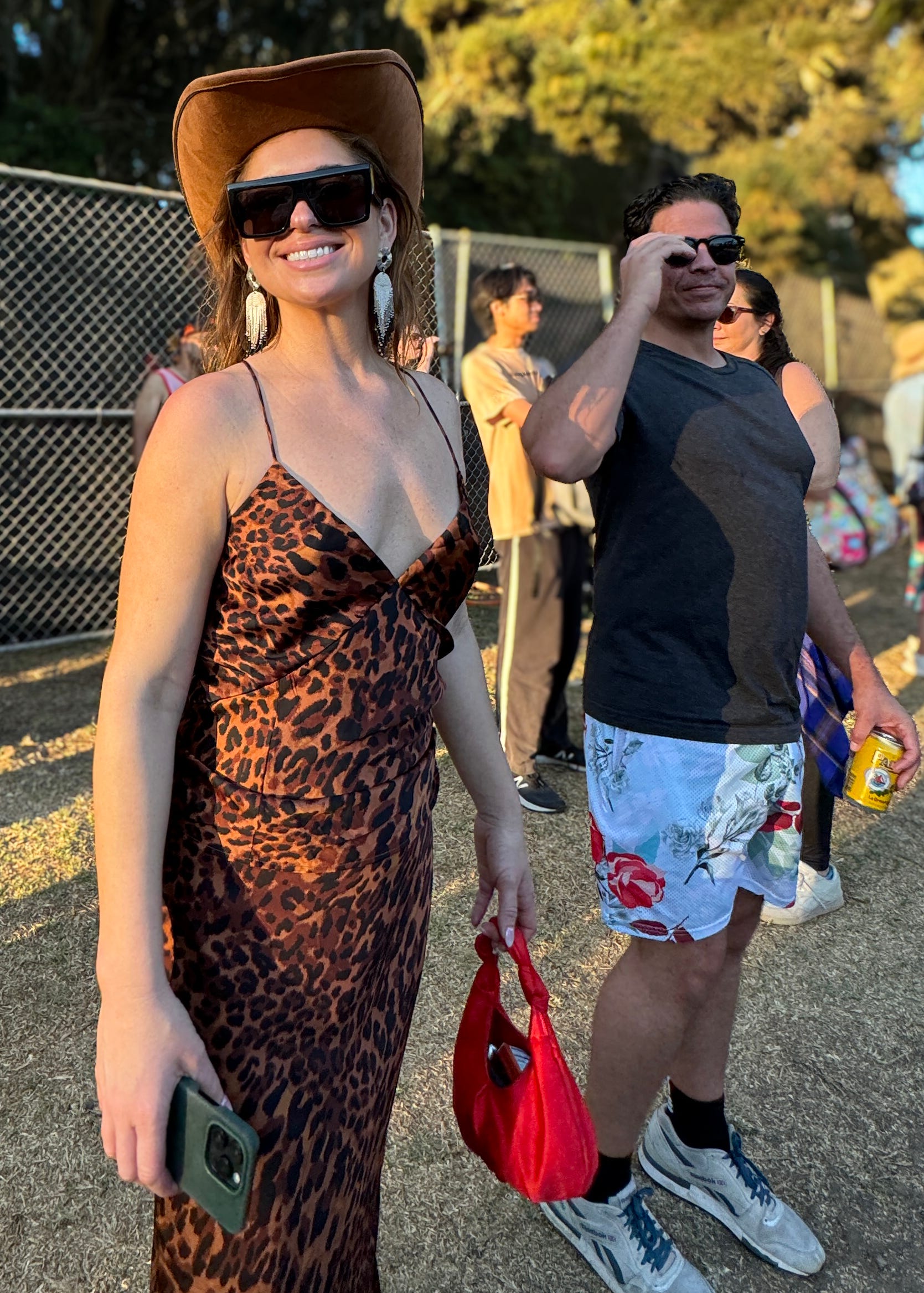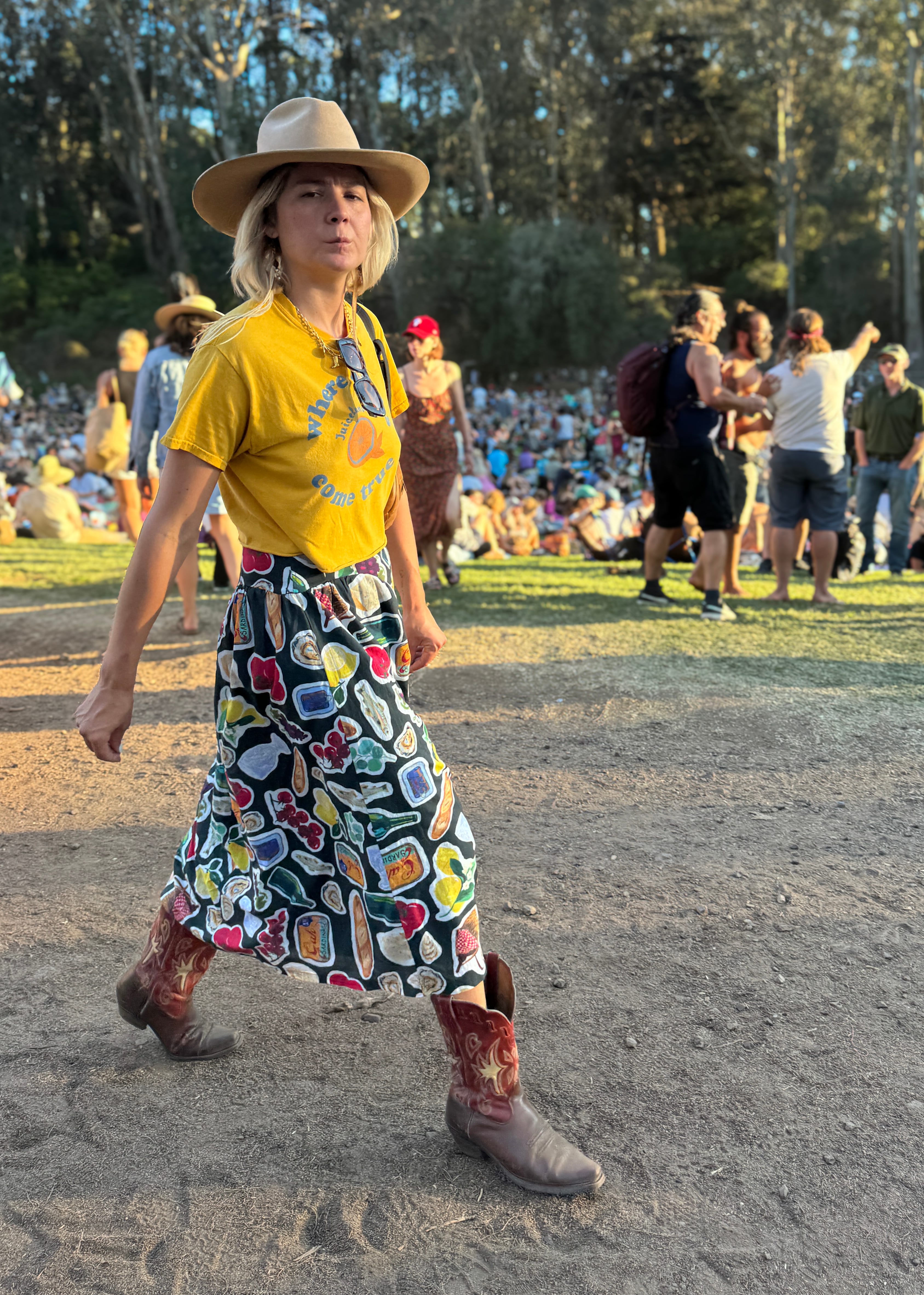 The fashion leaned hard into the boho-western vibe. Straw hats? Check. Cowboy hats? Double check. It felt like everyone took the opportunity to dust off their best western wear, blending “hardly” and “strictly” with ease. Think: boho chic meets “hardly strictly cowboy.” For those of us who didn’t pack sunscreen, hats were a saving grace, perhaps the only one because omg it was hot. Right?