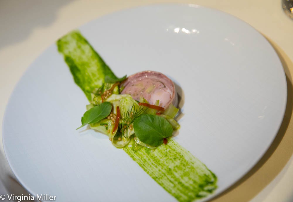 Course One: For seafood contrast to the A5 charcuterie extravaganza, we went with popular halibut crudo doused in a canadew (hybrid melon of honeydew and cantaloupe) emulsion with compressed cantaloupe and subtle hit of serrano chilies. Already eating beef and seafood, I opted for my other favorite meat after pork: rabbit. In this case, a starter of Devil’s Gulch rabbit, which exudes Germanic vibes in roulade mode over an artful green streak of parsnip pistou with a veggie/herb salad and pickled mustard seeds.