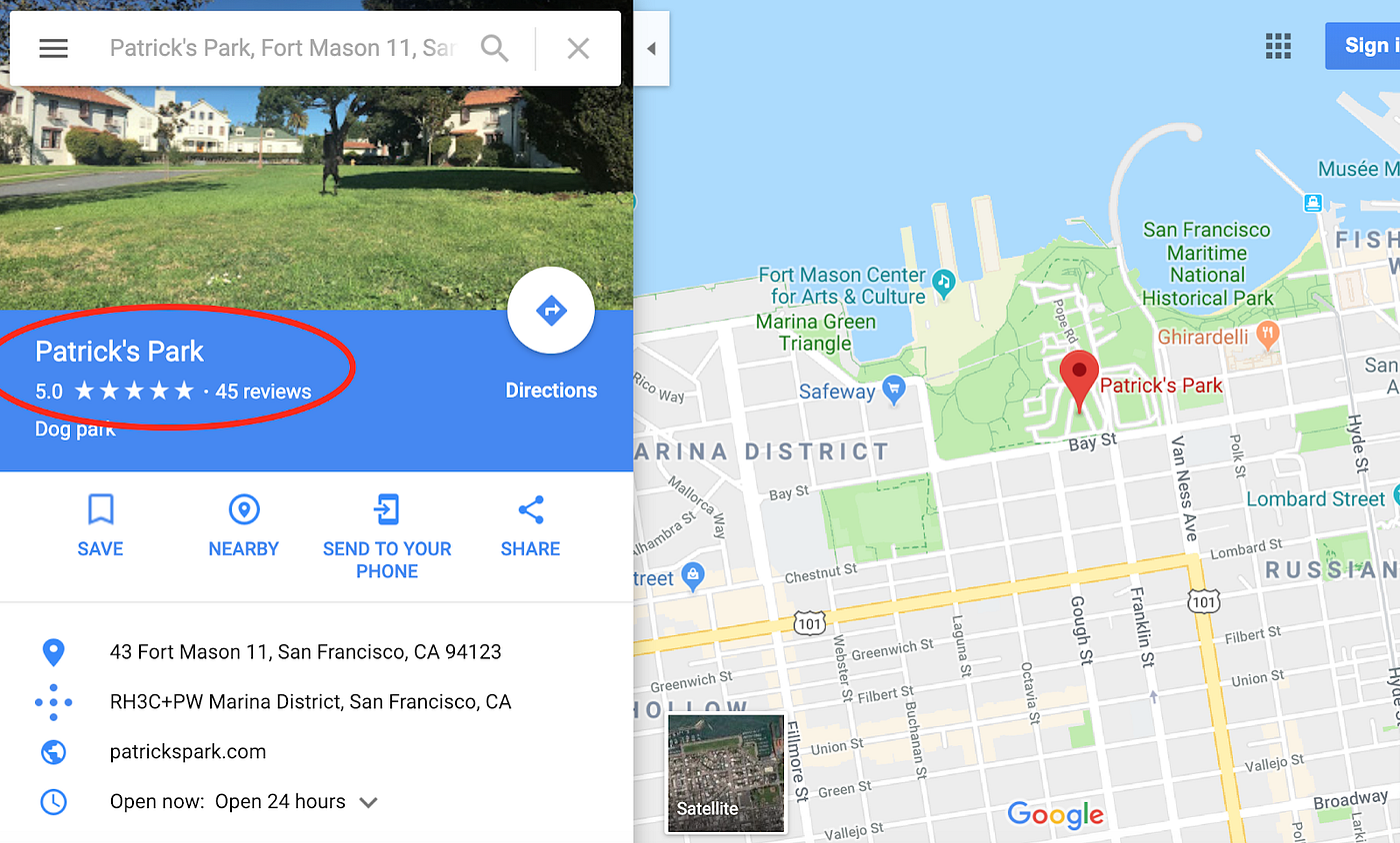 There happened to be a patch of grass that came to mind, where the two of us went nearly every day to play frisbee. When I’d invite others to meet us there, they’d often found it difficult to find since the land had no name or mappable location. Technically, it’s in Fort Mason, but it’s not actually in Fort Mason, it’s next door to it on Bay and Franklin Streets, behind a gate. To help friends find this unnamed territory, I added it to Google Maps as Patrick’s Park.