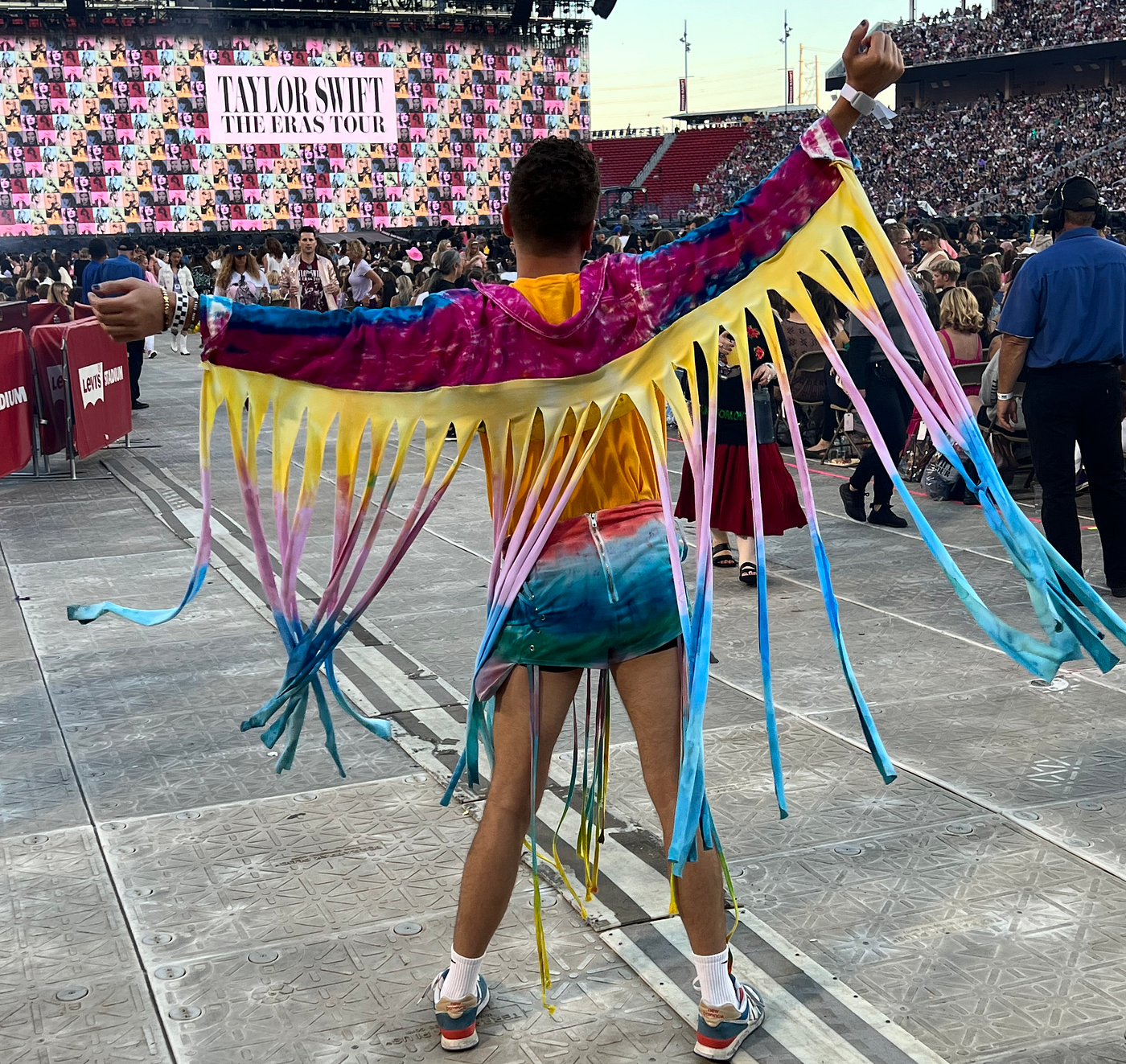 At the stadium, I felt like a rock star. I had spent weeks making my outfit, an obnoxious rainbow fringe getup inspired by what she wore to Wango Tango in 2019 during the Lover Era. The pièce de resistance was a bright yellow “no its becky” t-shirt (if you know, you know).